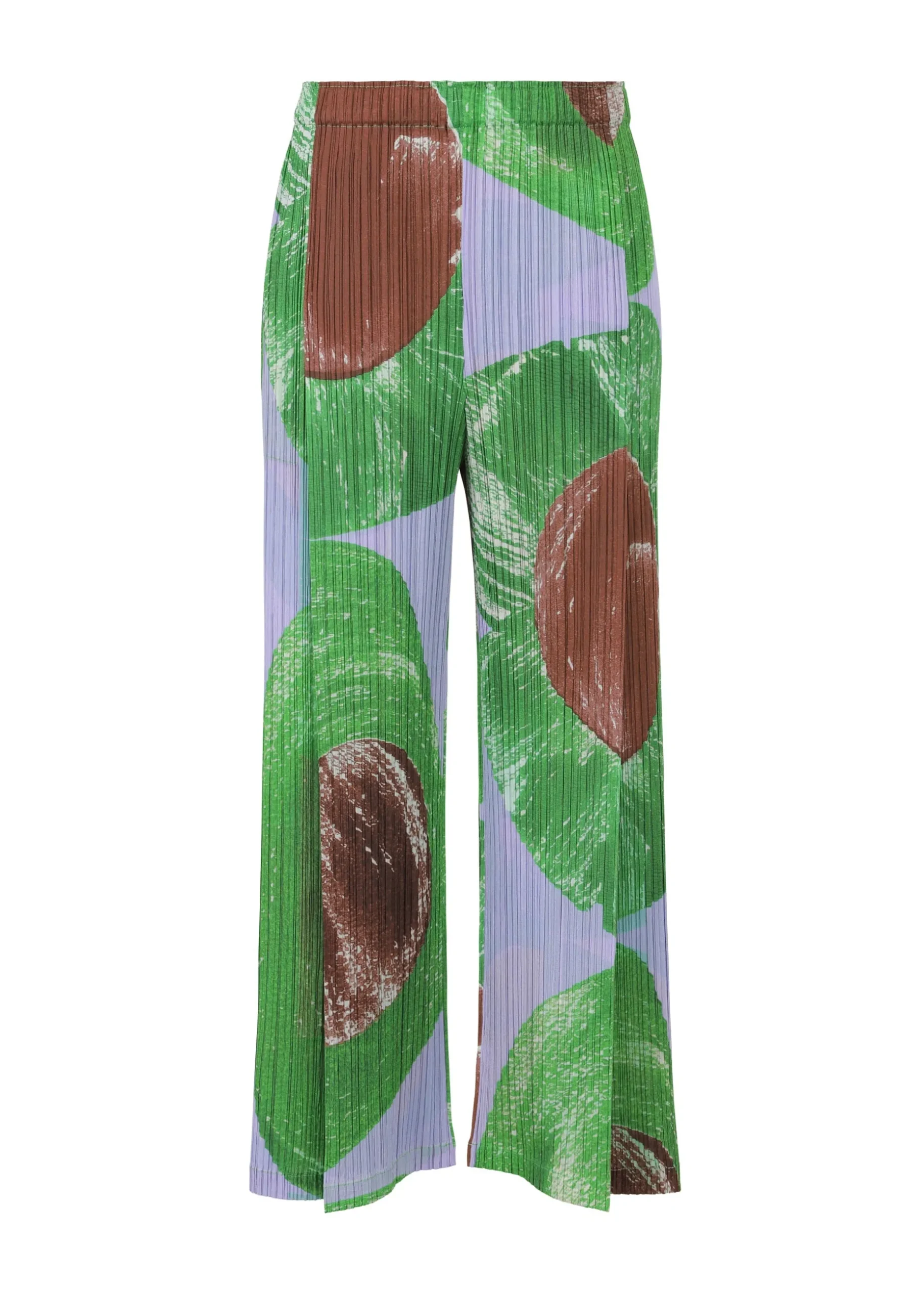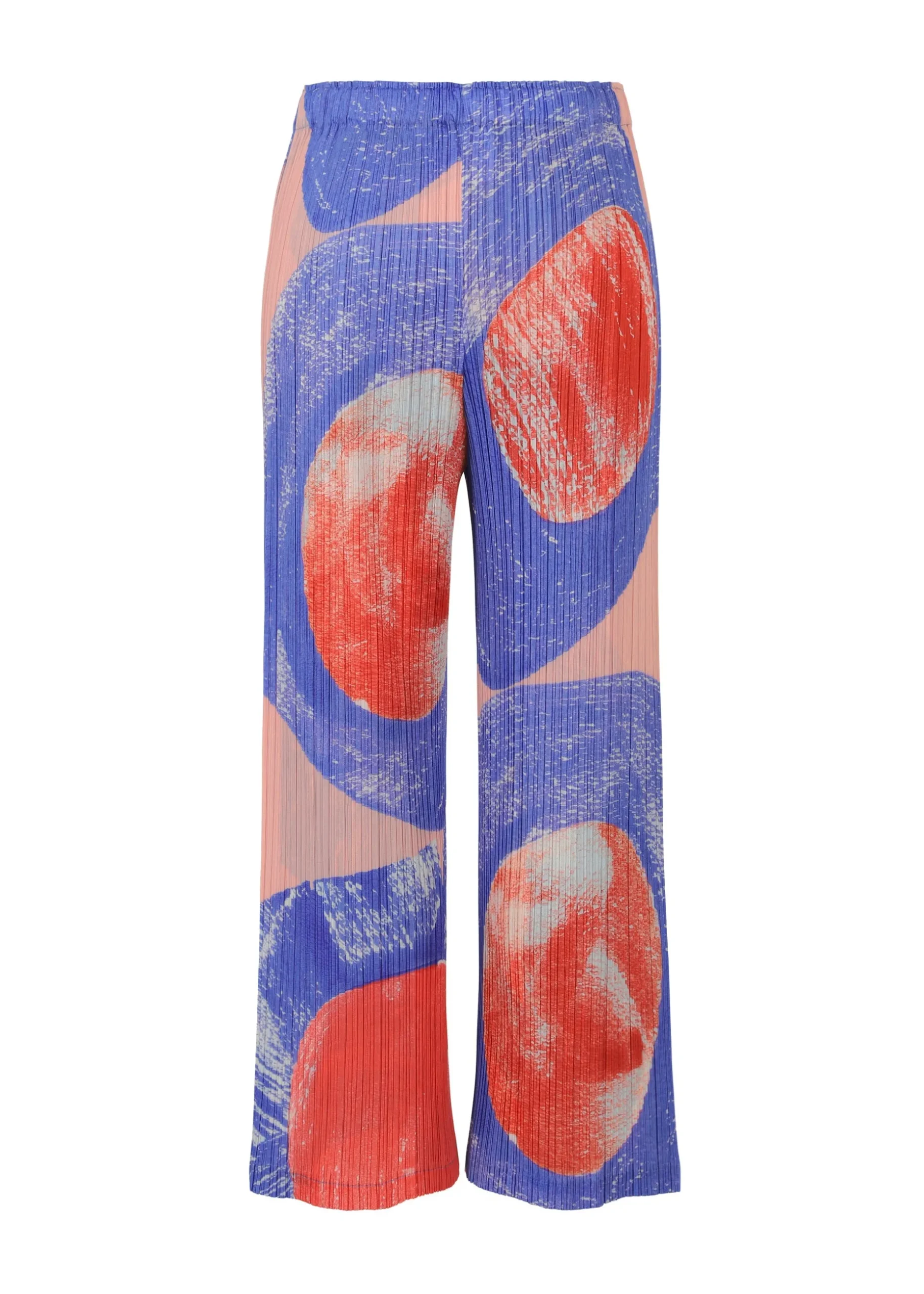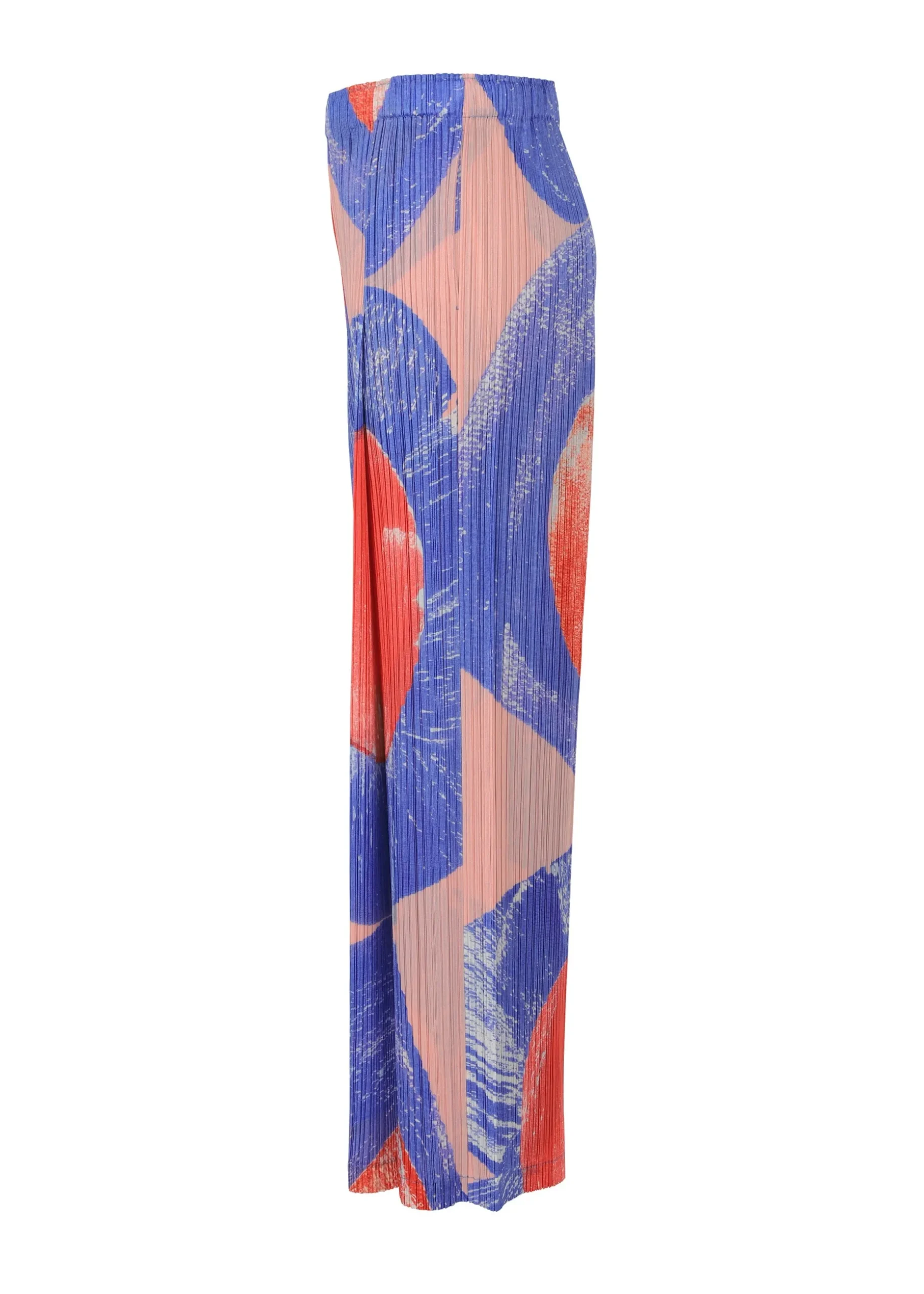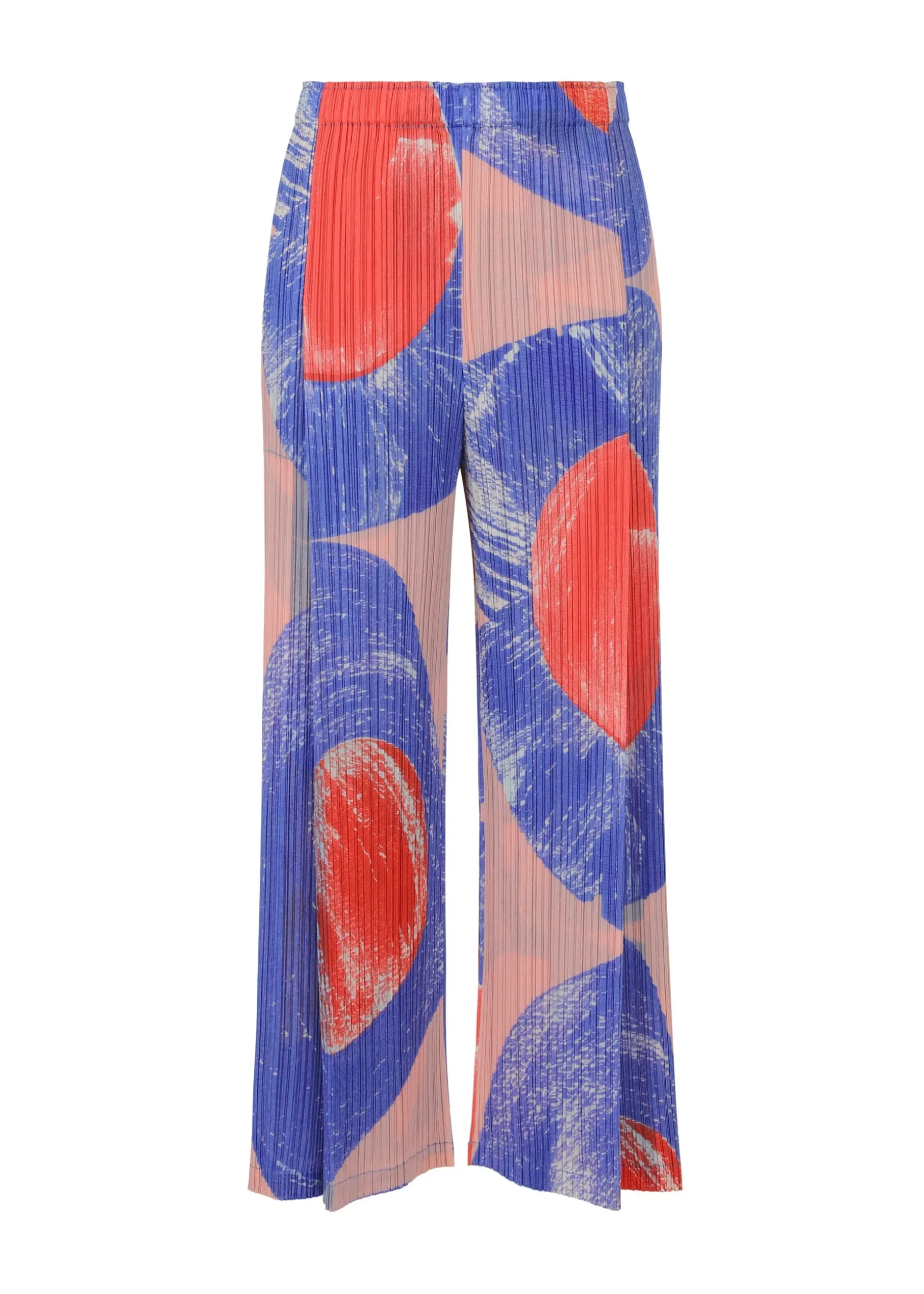 Tucked pants with a dynamic curved print using paper printing techniques. There are pockets on both sides.