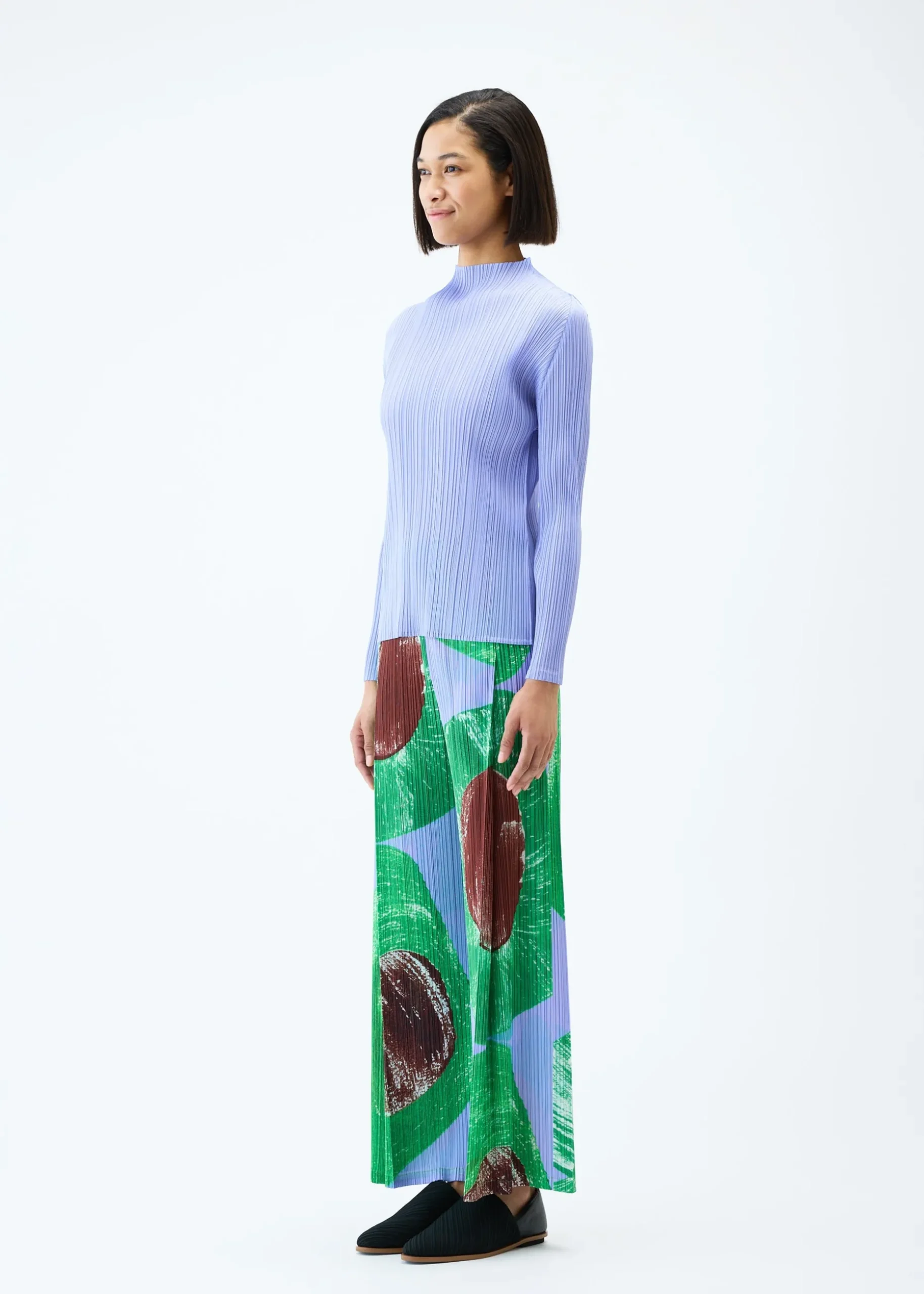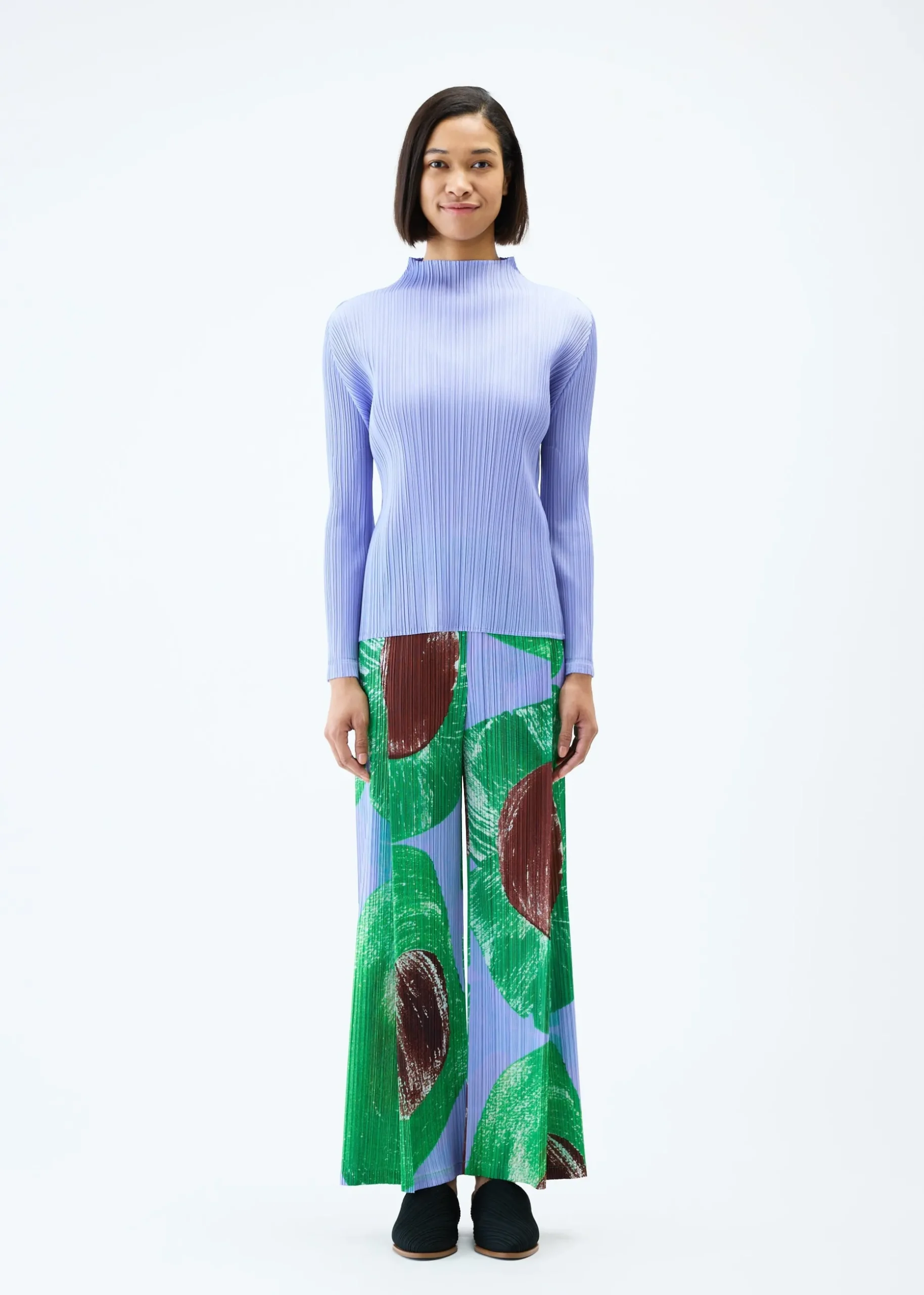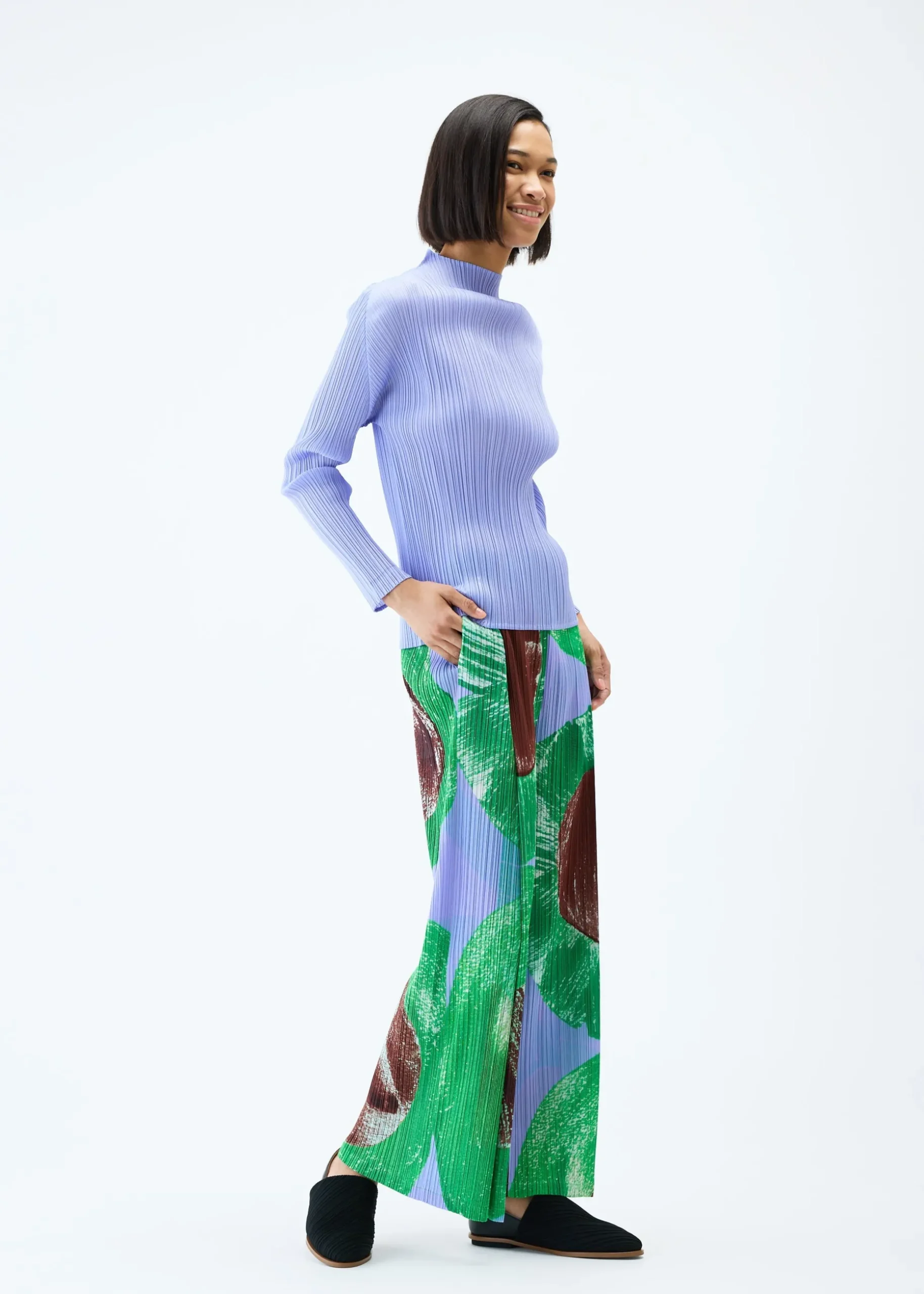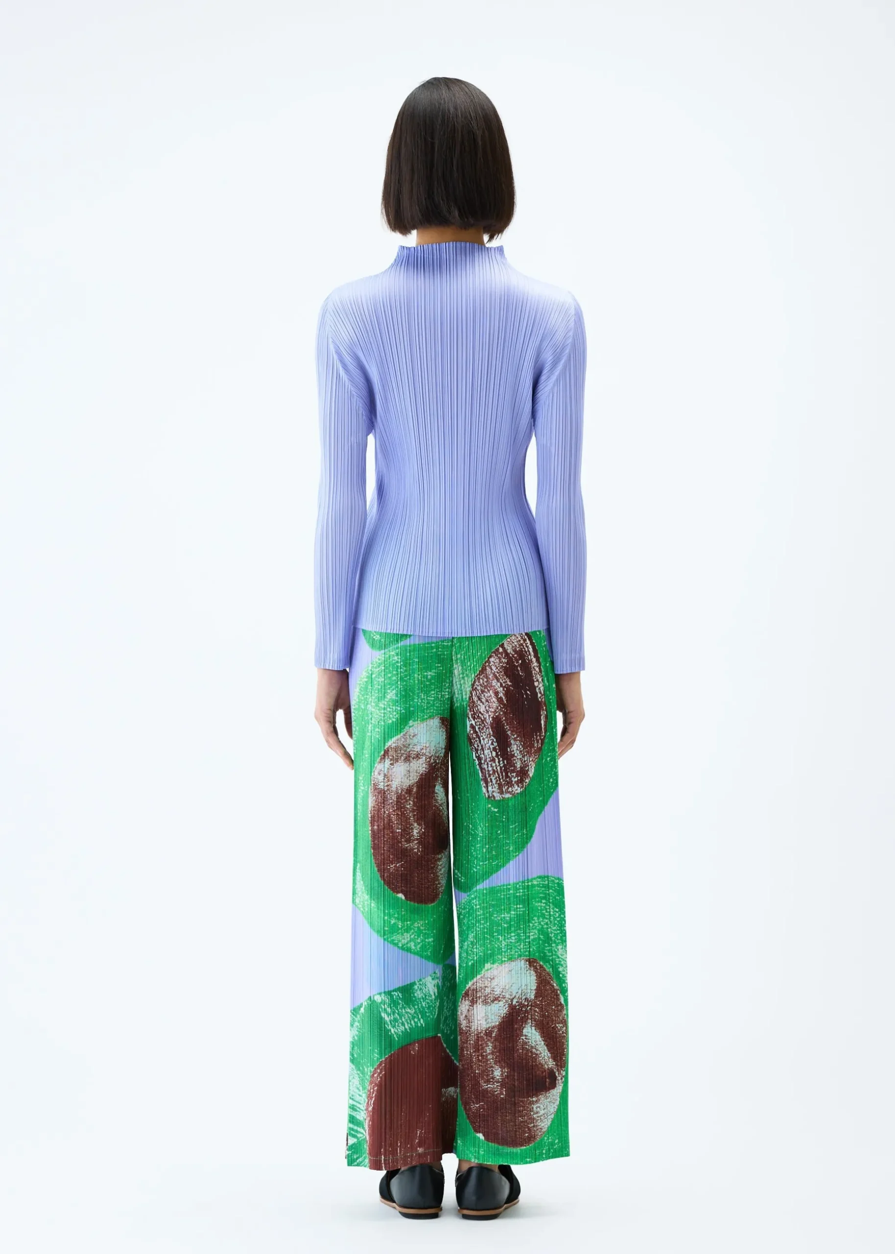 Tucked pants with a dynamic curved print using paper printing techniques. There are pockets on both sides.