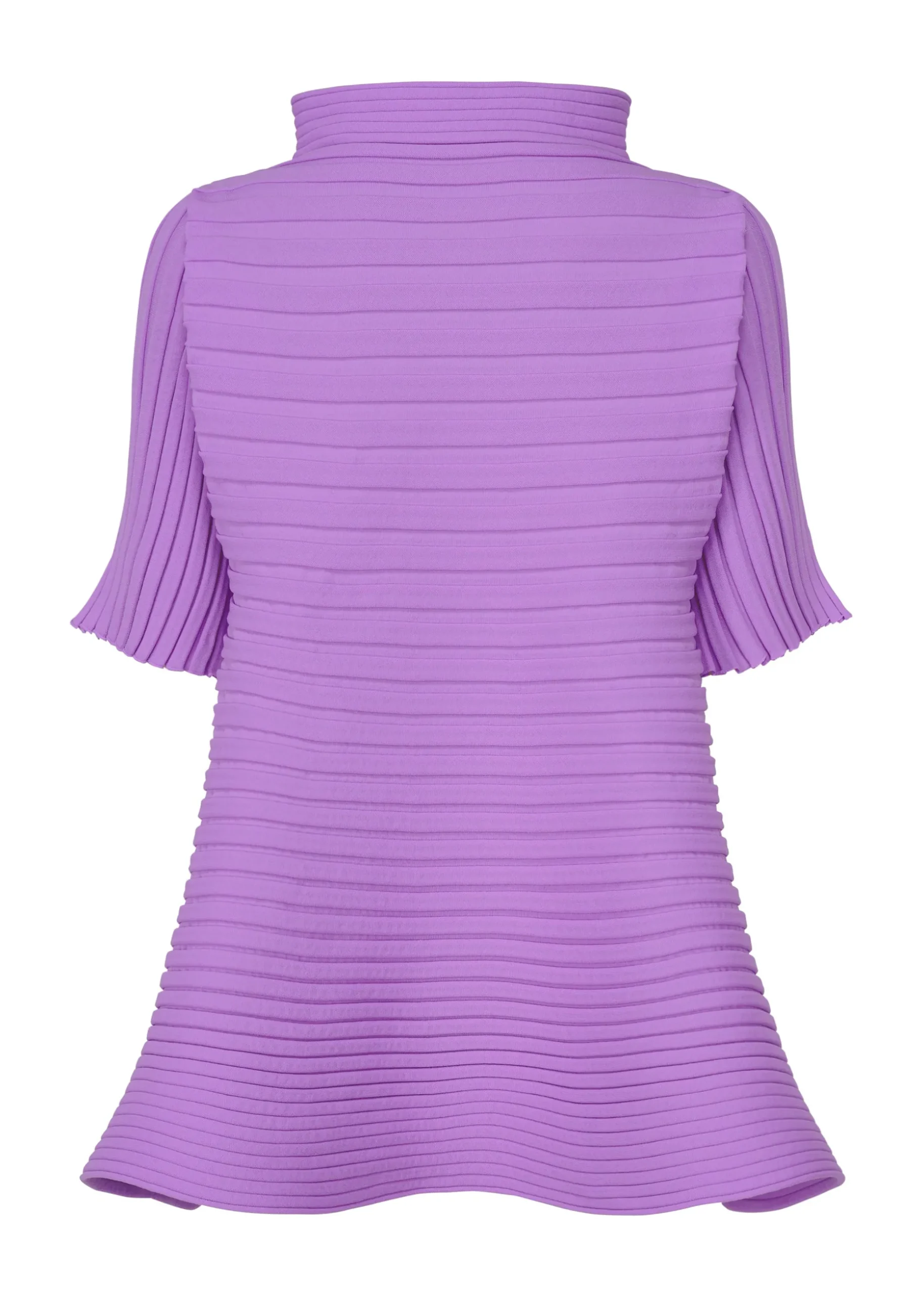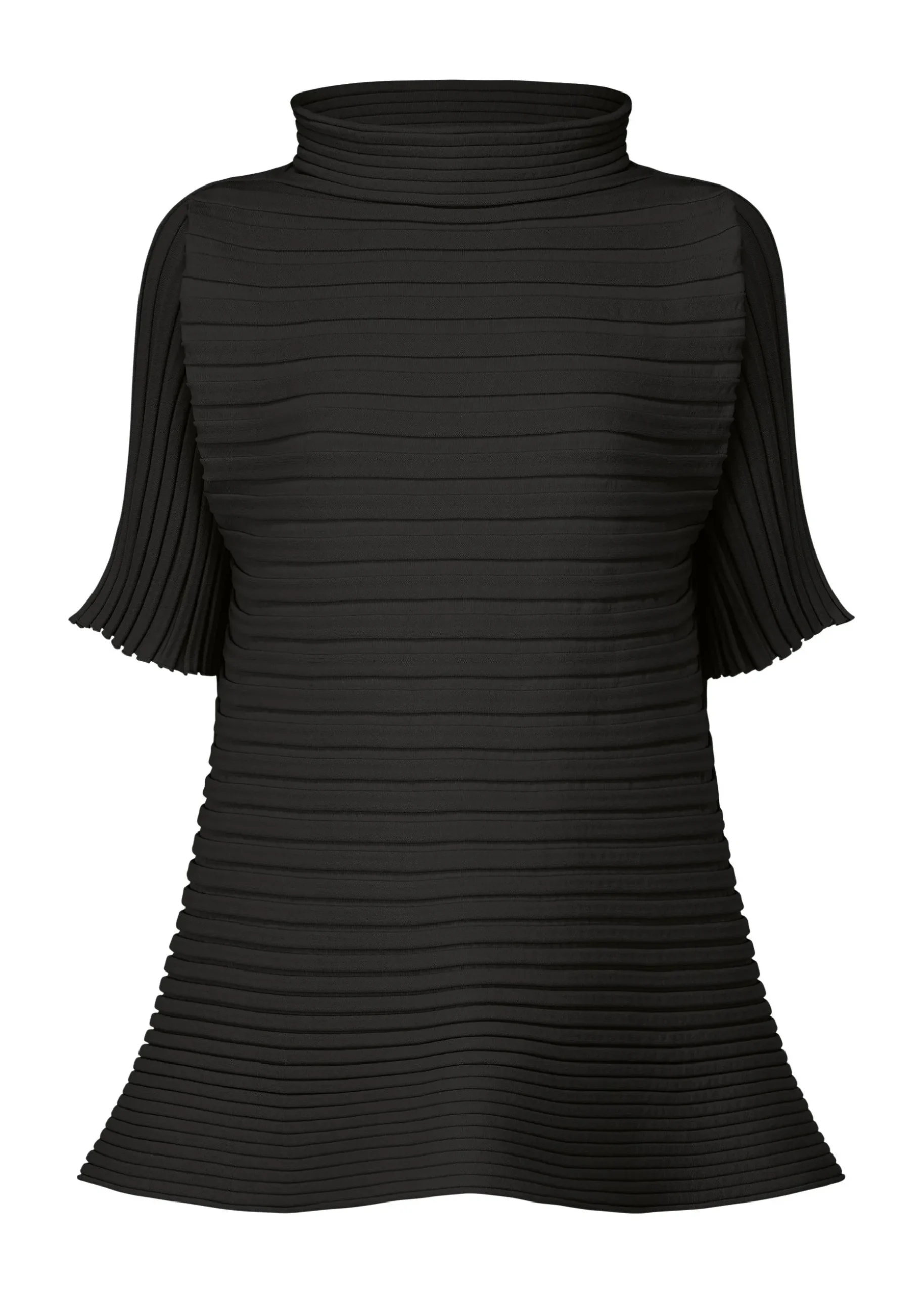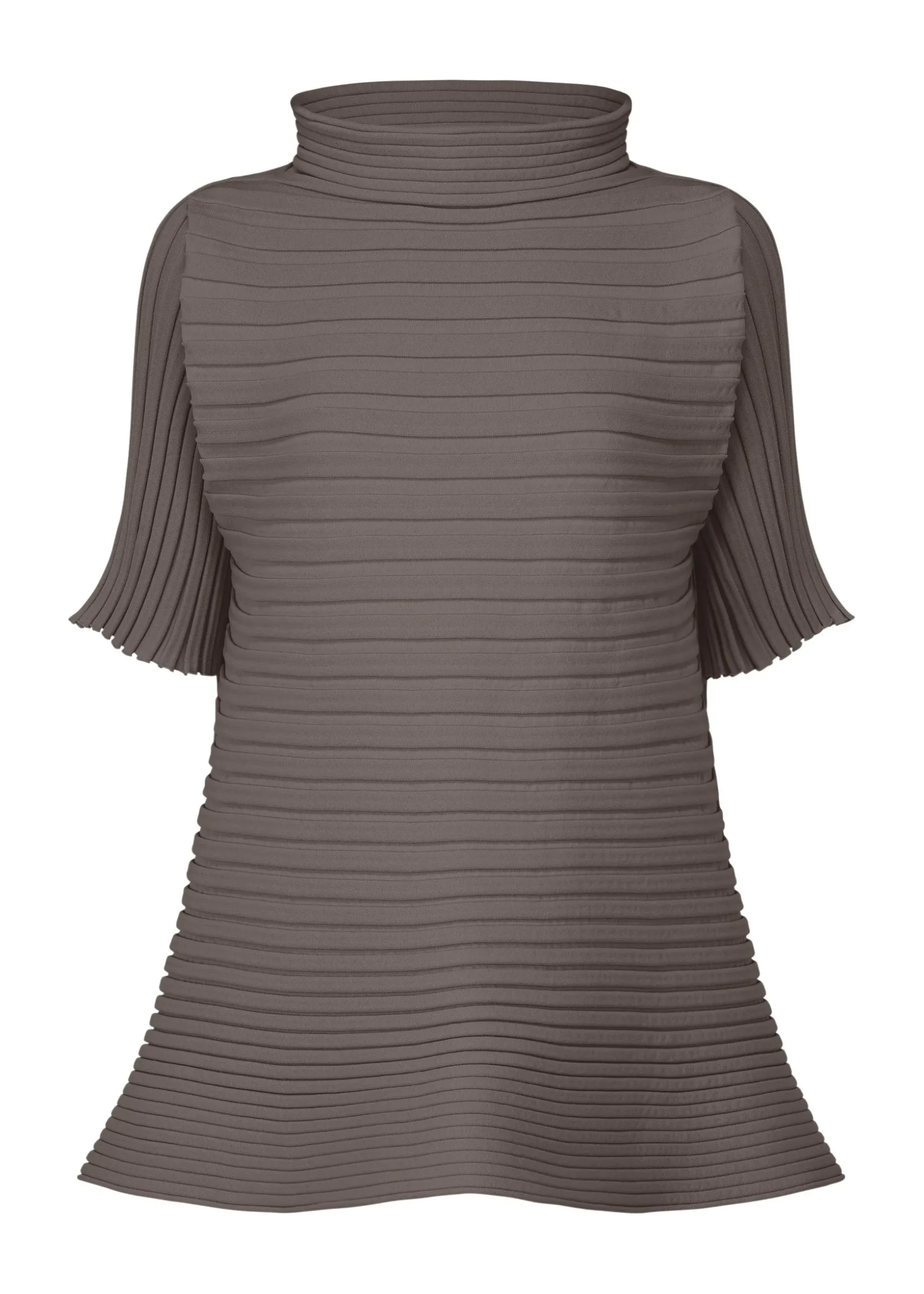 This non-sewn high-neck, half-sleeve knit expresses horizontal pleats with its knitted structure that bounces as you move. Recycled polyester thread is used to create the textile that is easy to care for because it is washable in water.