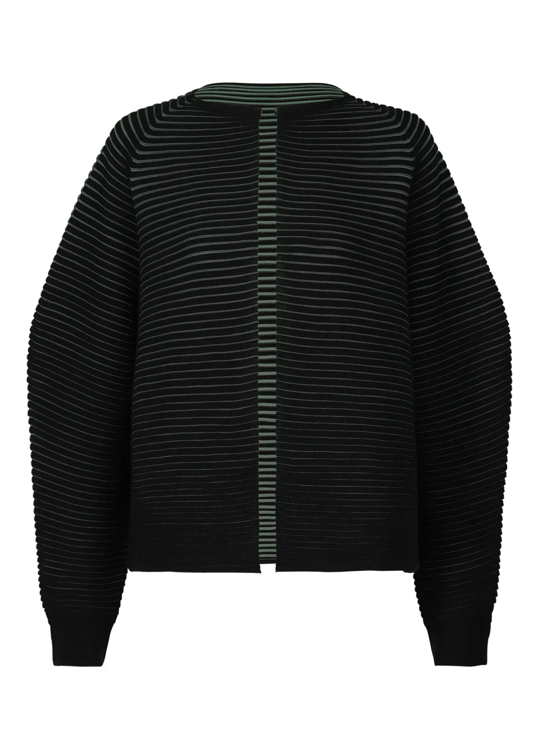 This non-sewn, knit cardigan is characterized by its striped pattern in an uneven color scheme. It is knitted unevenly, alternating between wool threads with a fluffy texture and polyester threads recycled from plastic bottles. The reversible design features a contrasting color scheme on the front and back, making this a fun item with horizontally knitted fabric that bounces as you move, revealing glimpses of the colors. It is knitted without sewing while accentuating the roundness of the sleeves for a three-dimensional form.