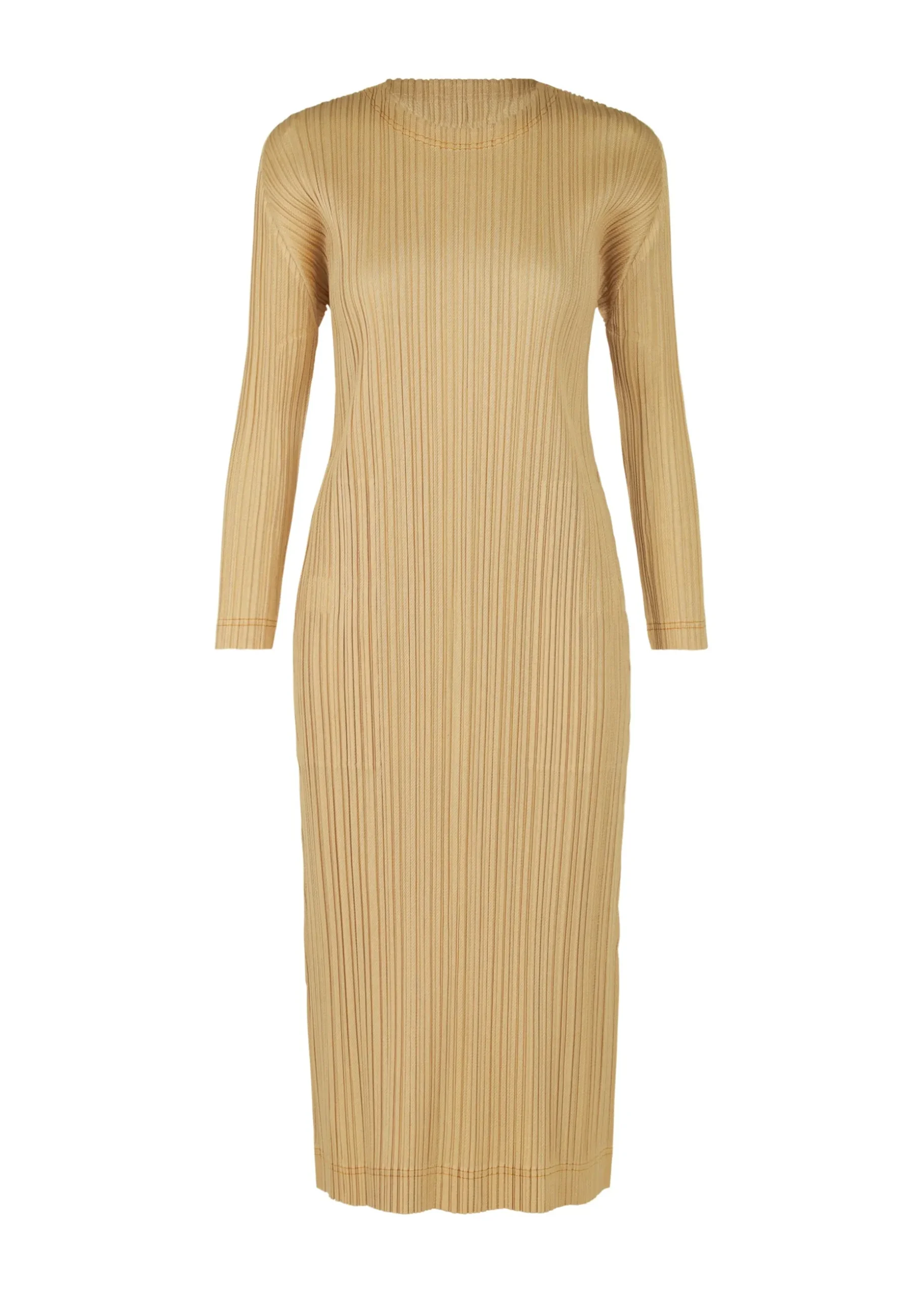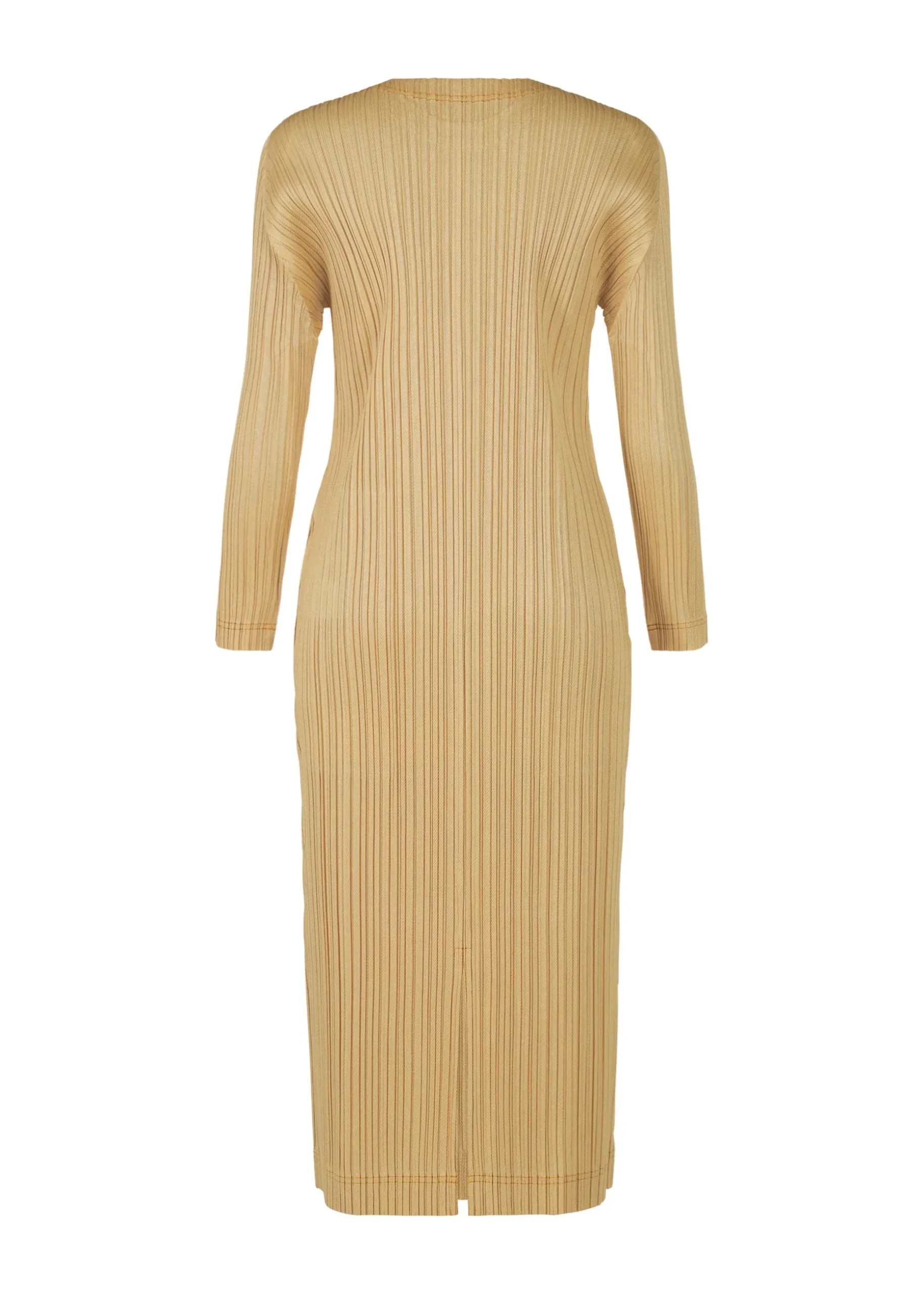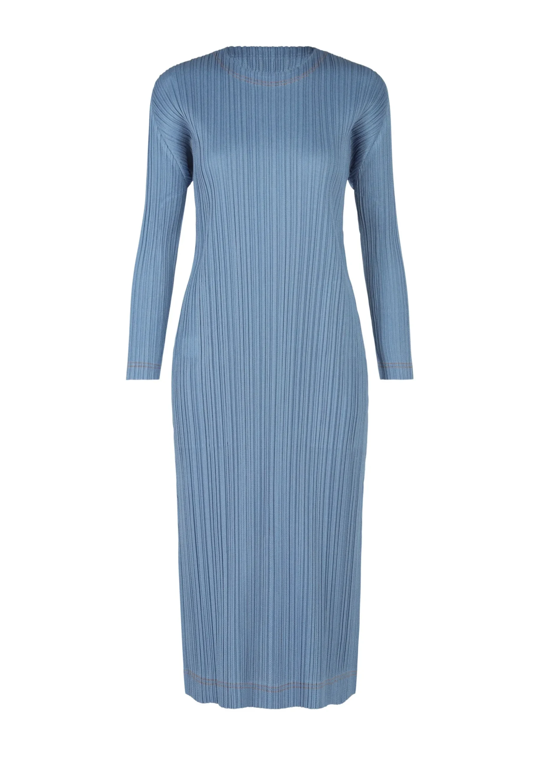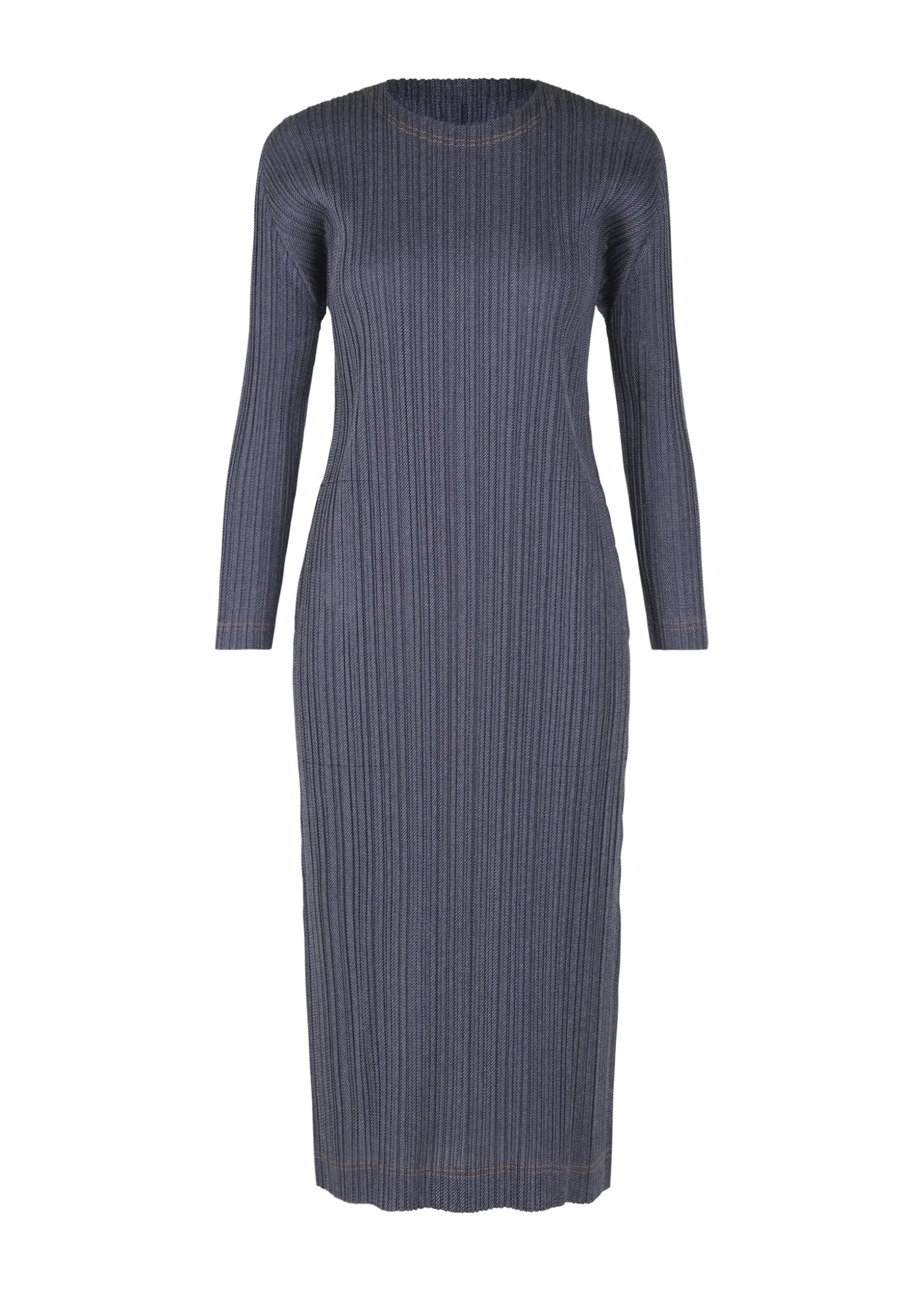 A round long-sleeve dress made of textile that incorporates cotton, with a moderate sheen and a denim-like feel. Stitching is done in an accent color that matches the fabric. There are pockets on both sides and a slit in the center back.