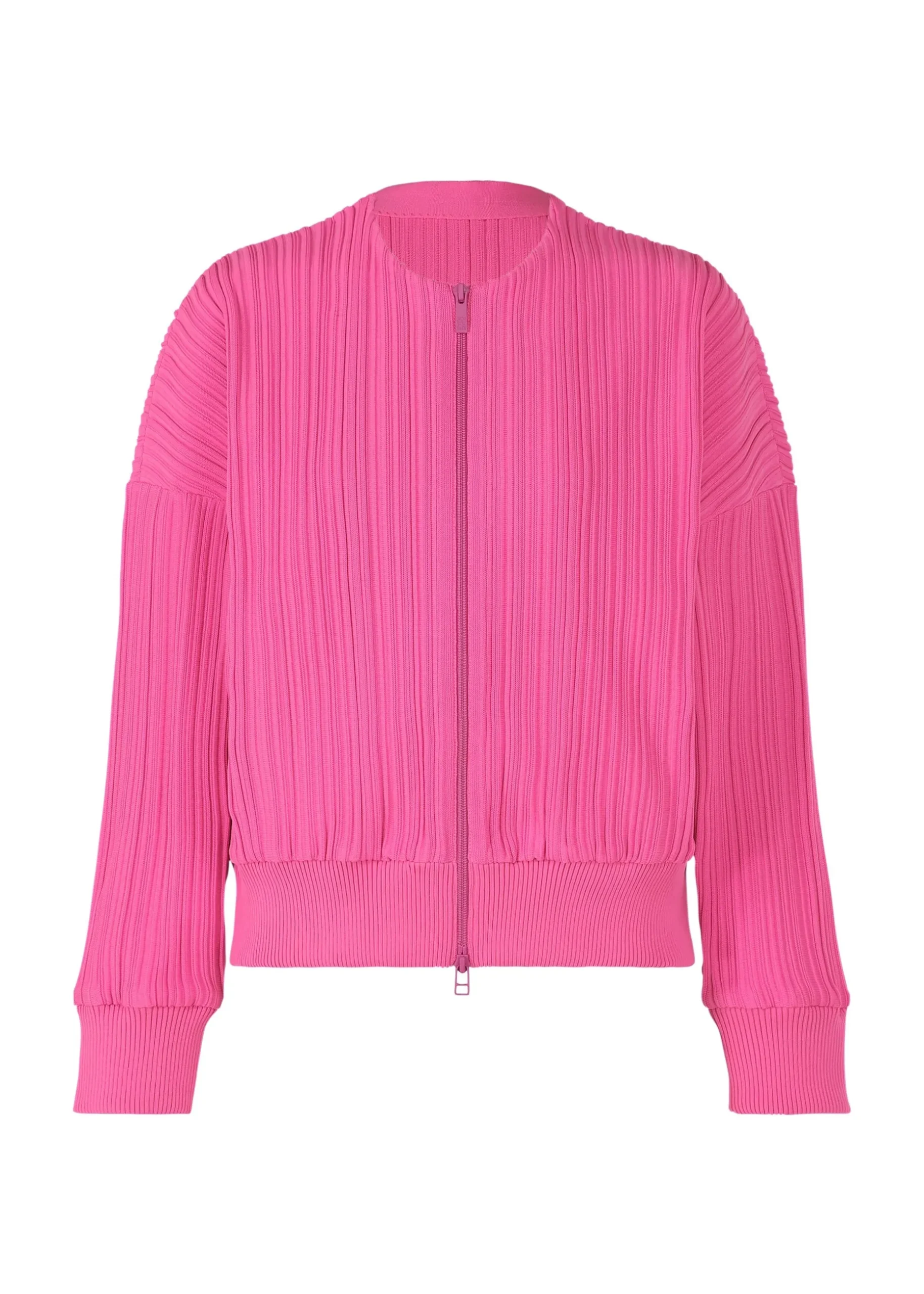 This knit jacket with a zipper features pleats in a horizontal knitting structure. It is characterized by being easy to care for as it is lightweight and machine-washable due to being made from 100% recycled polyester. There are pockets on both sides.