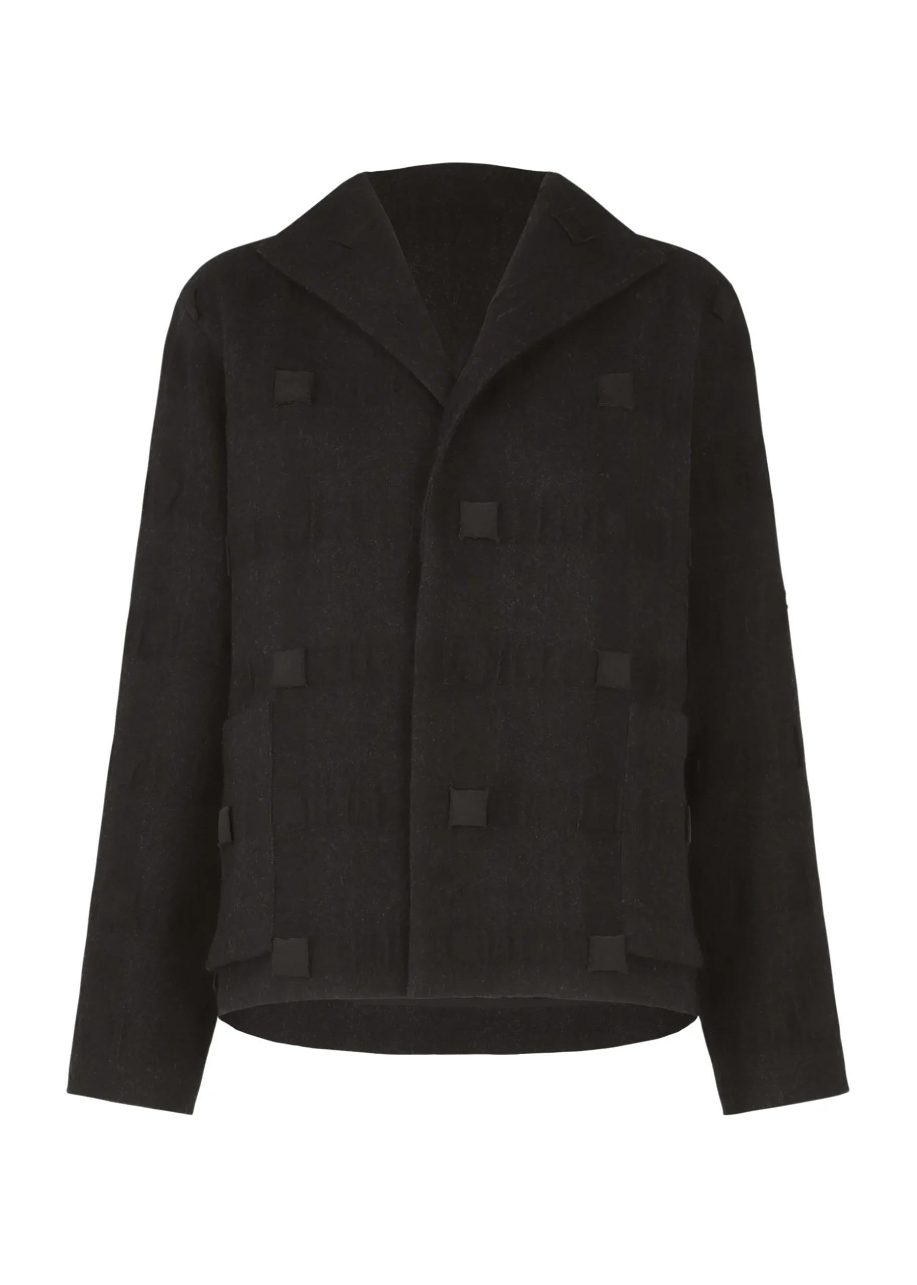 This jacket uses a three-dimensional textile that is made of wool and recycled polyester in a lattice pattern, triple woven, and then filled into a cube shape.