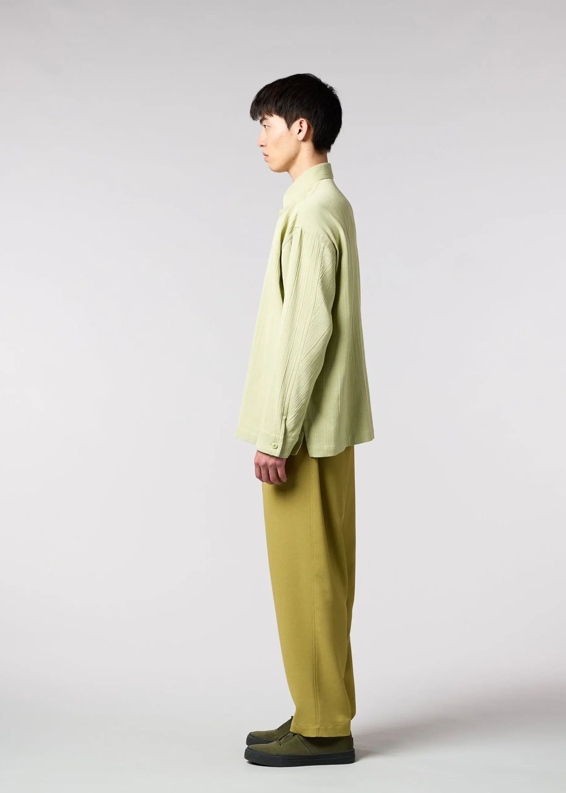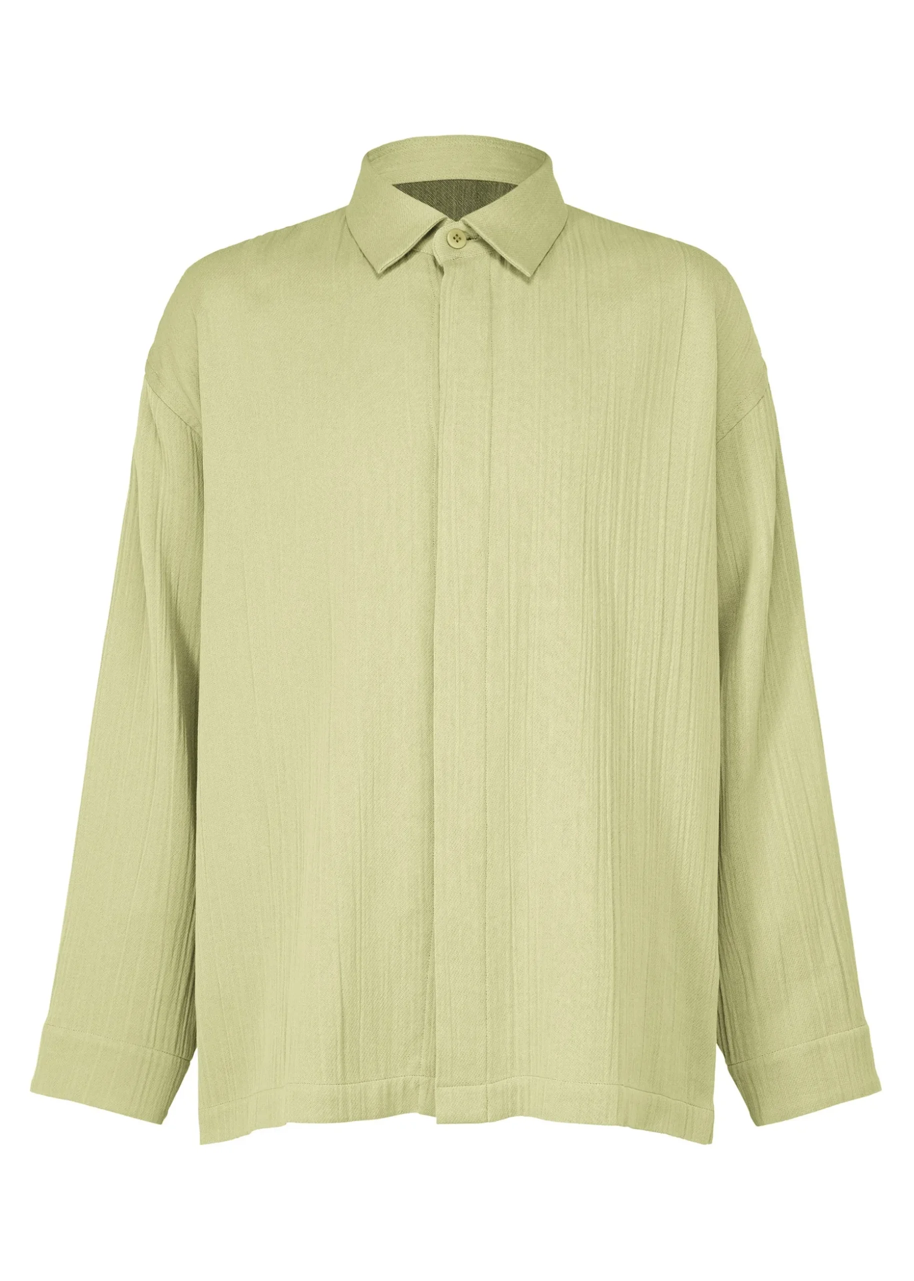 A shirt made from yarn-dyed, highly twisted yarn, which is expanded and contracted during the washing process to create a willow-like texture. The double-woven fabric has different colors on the front and back, giving it a fluffy feel and texture.