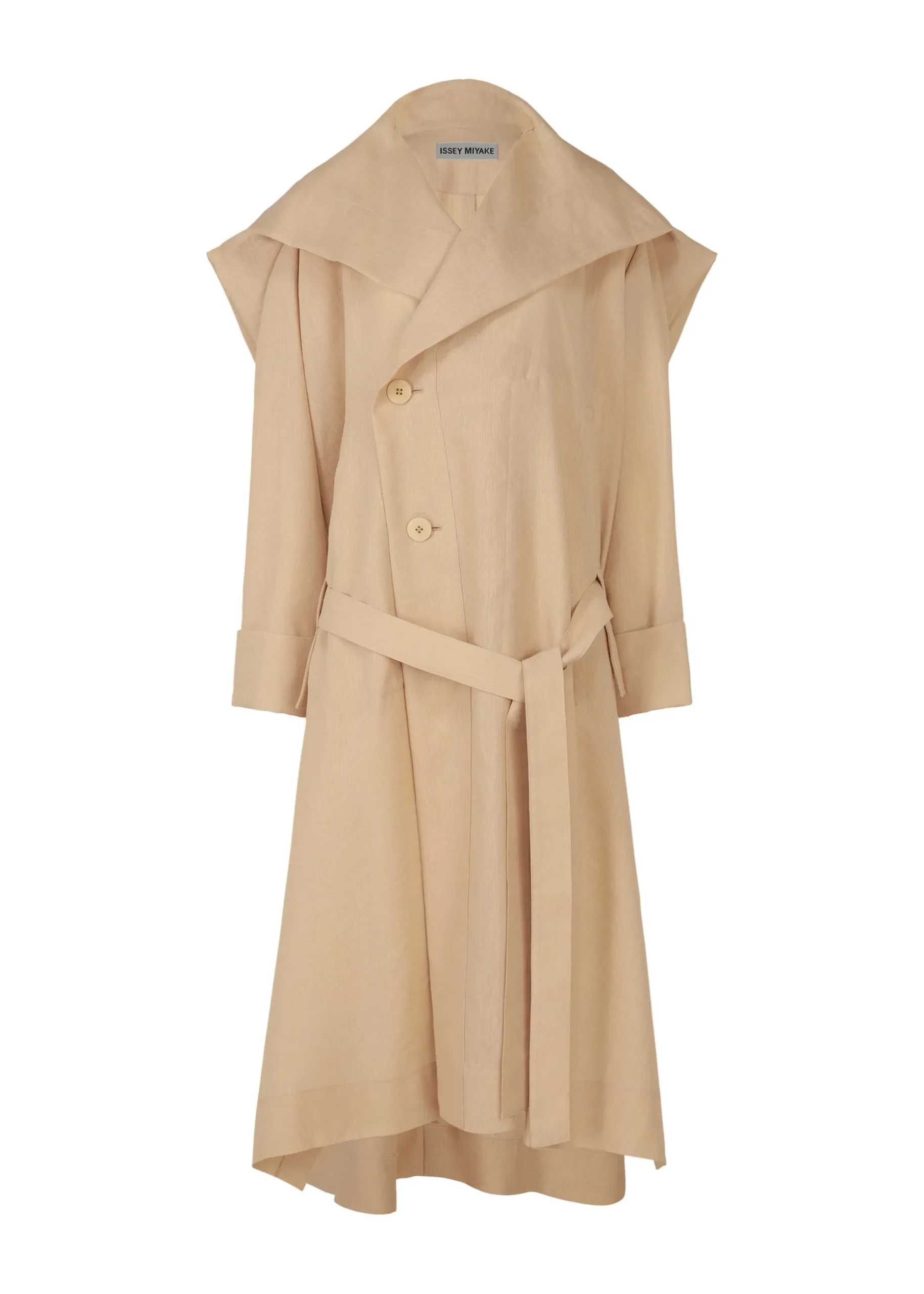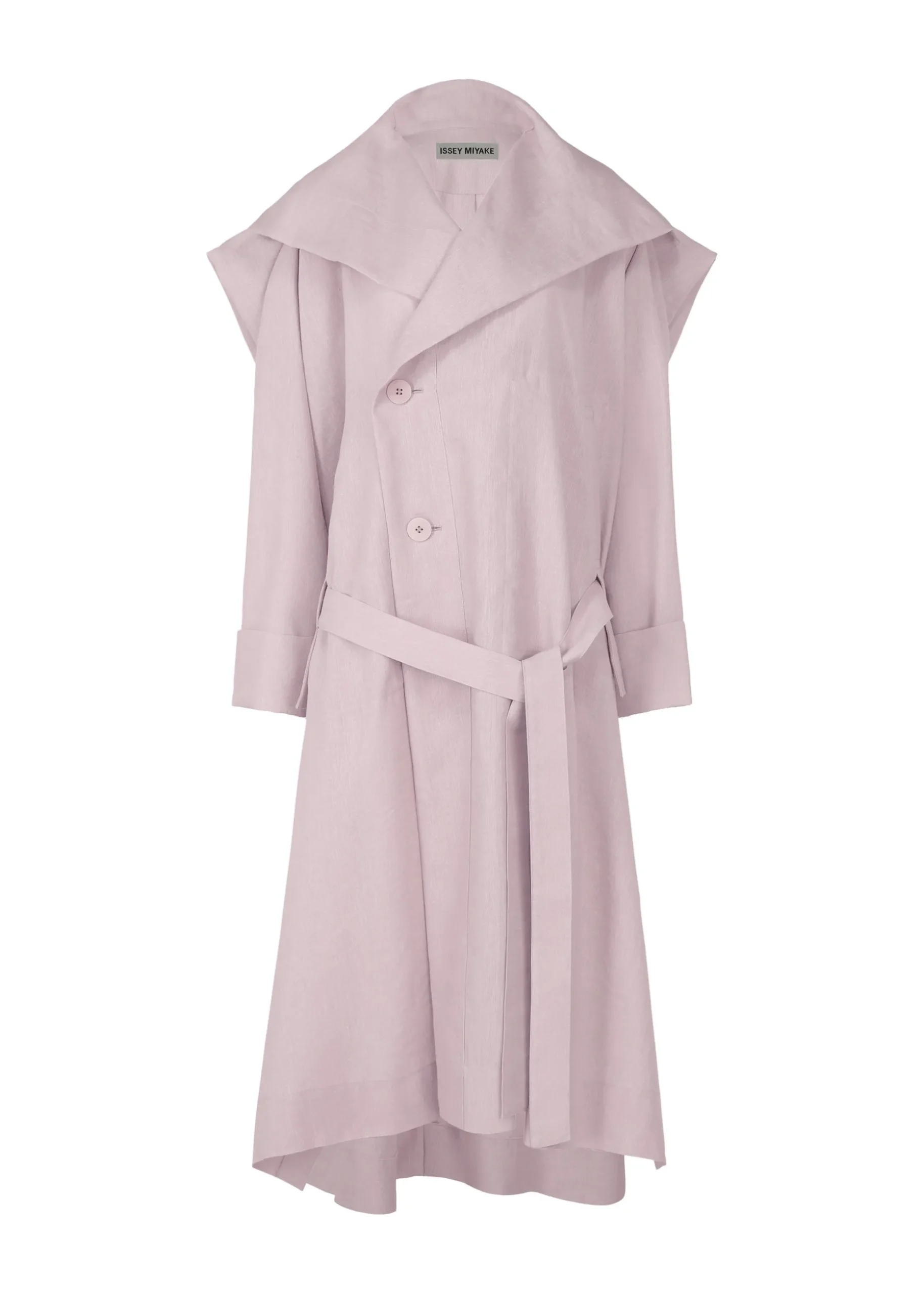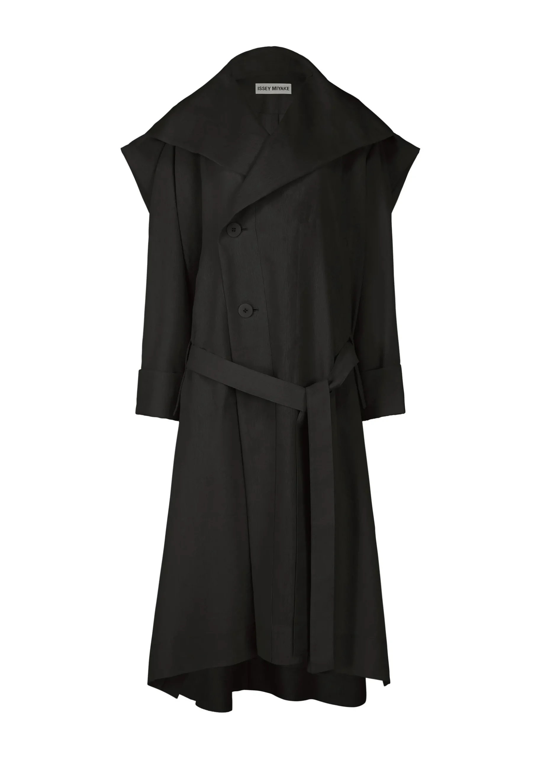 This long coat is characterized by its material that combines hemp’s distinctive tautness and strength with the warmth of mohair and wool. It is made using custom-order spun thread, with hemp for the warp and mohair and wool for the weft. The yarn-dyeing process creates subtle variations in color between the warp and weft, resulting in a beautiful hue with a sense of depth. The design features a bold silhouette that leverages the moderately taut hemp and the elasticity of mohair.