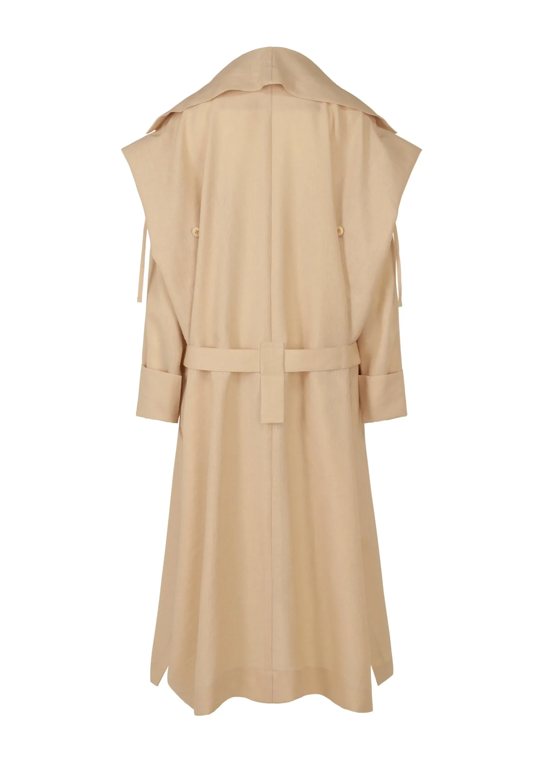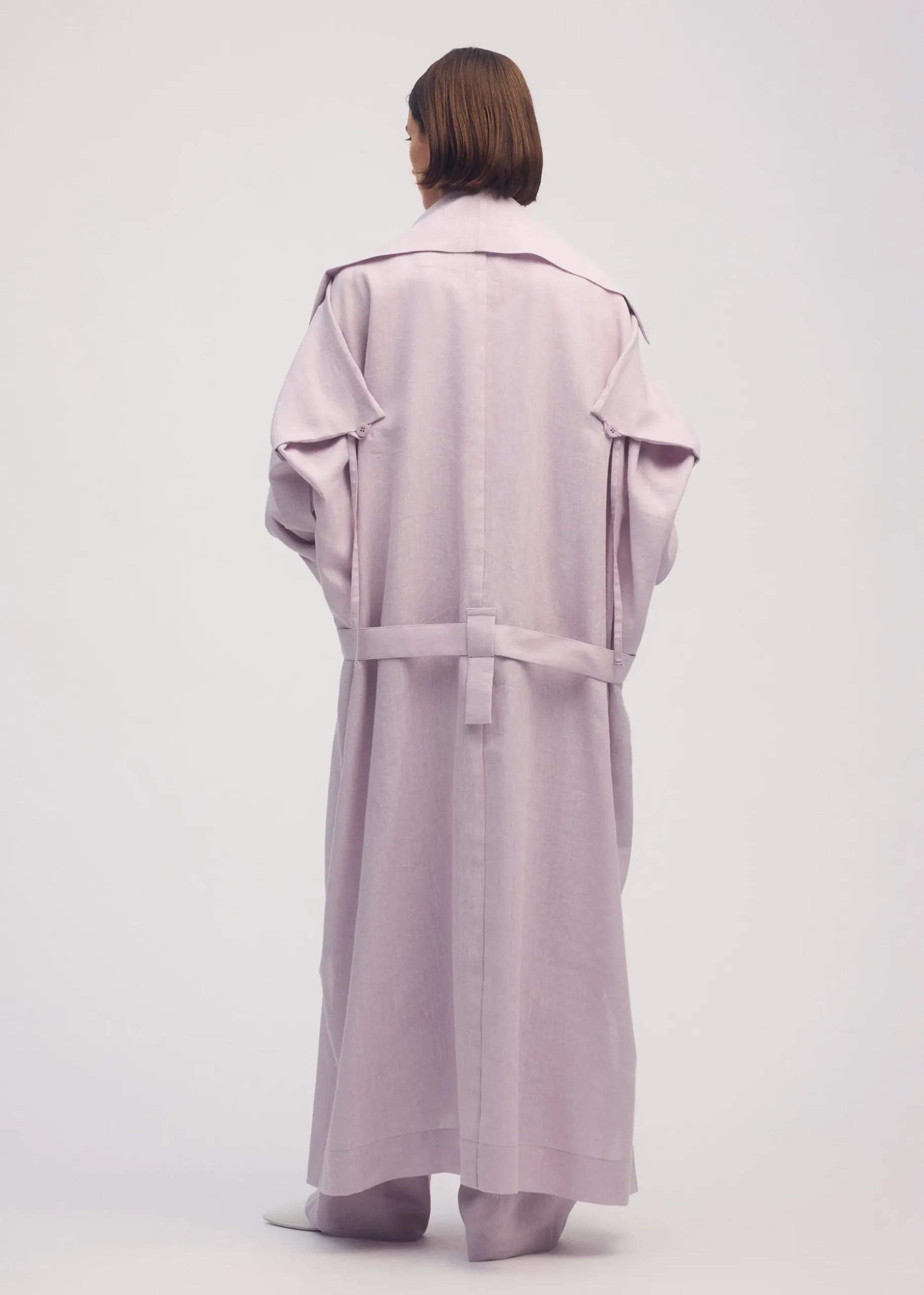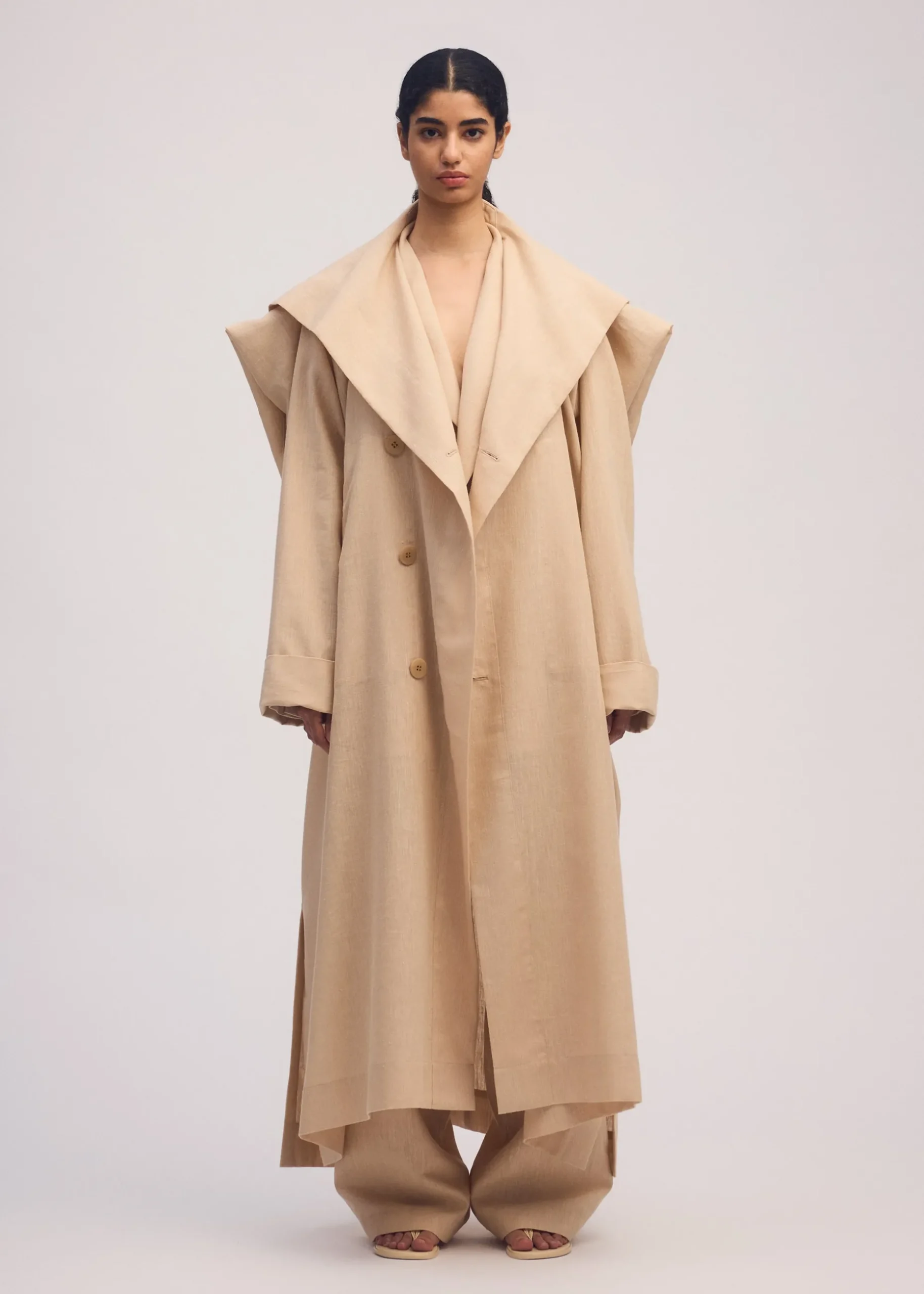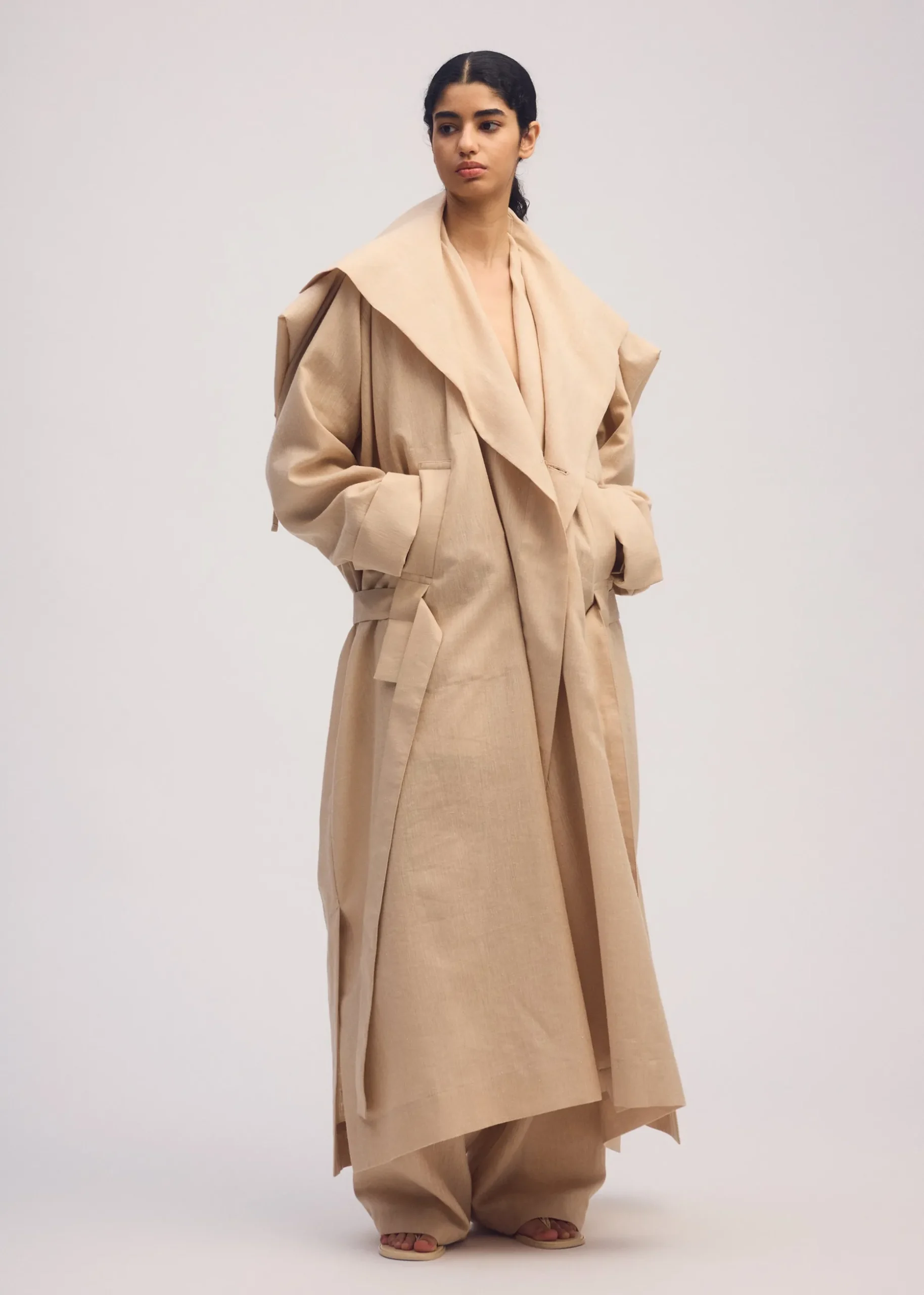 This long coat is characterized by its material that combines hemp’s distinctive tautness and strength with the warmth of mohair and wool. It is made using custom-order spun thread, with hemp for the warp and mohair and wool for the weft. The yarn-dyeing process creates subtle variations in color between the warp and weft, resulting in a beautiful hue with a sense of depth. The design features a bold silhouette that leverages the moderately taut hemp and the elasticity of mohair.