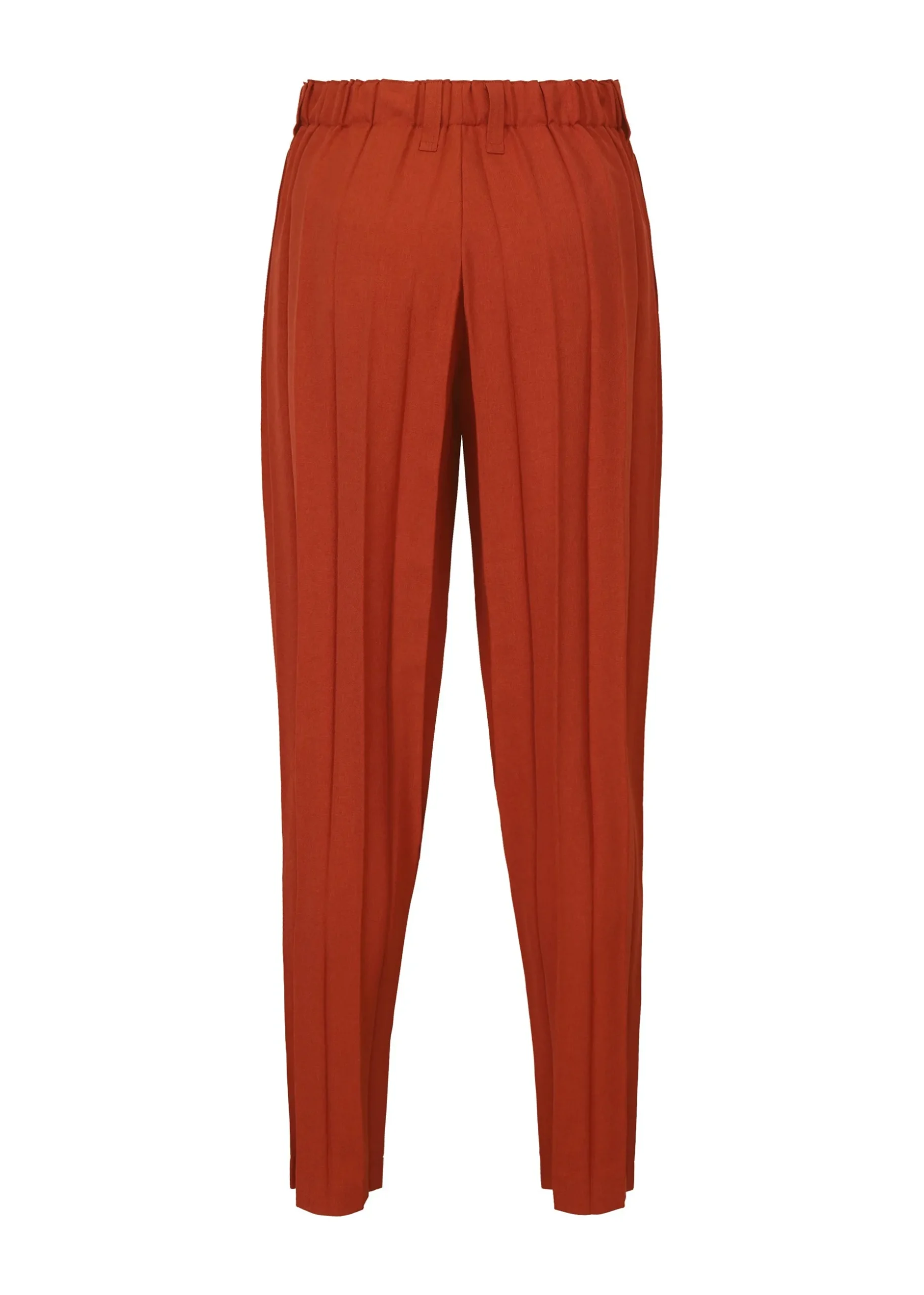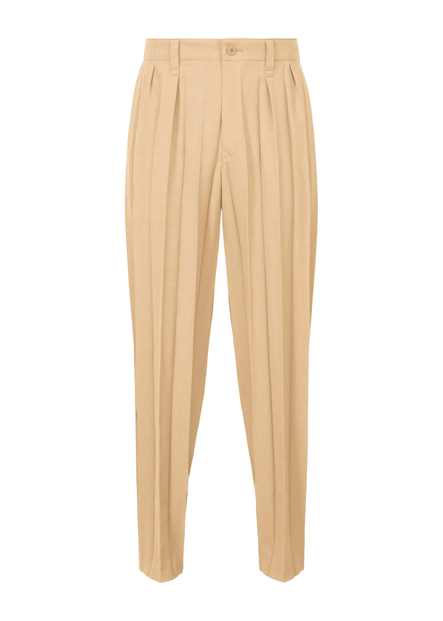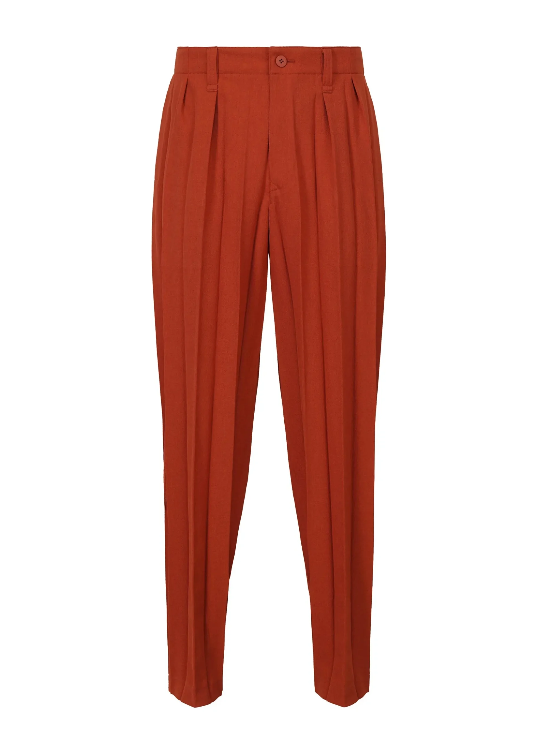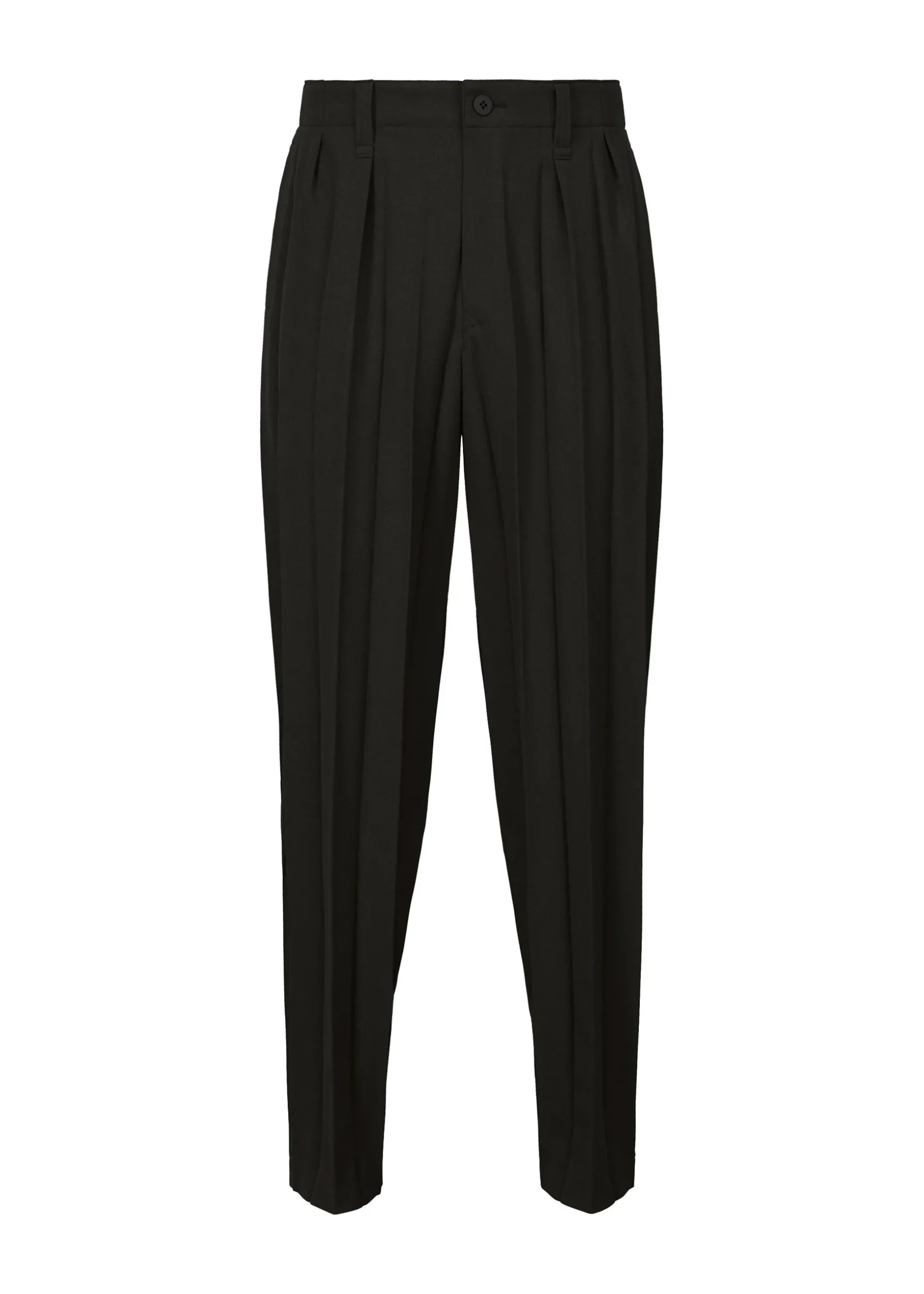 These tapered pants are made from glossy material with wide accordion pleats. They have pockets on both sides and belt loops at the waist. They have a button-fly design.
