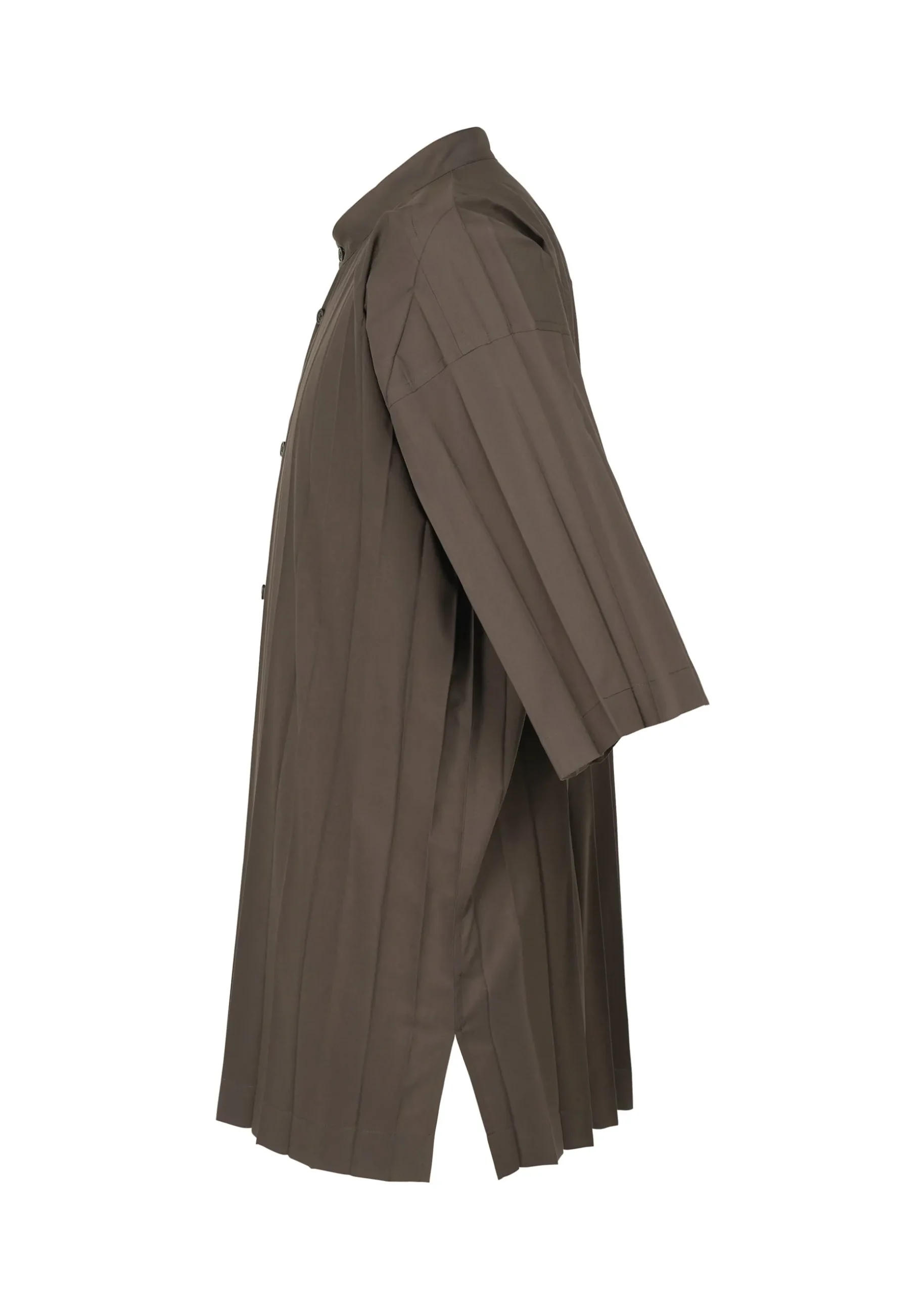 This shirt with a standing collar is made from thin polyester fabric with a hand-pleated finish. There are slits on both sides.