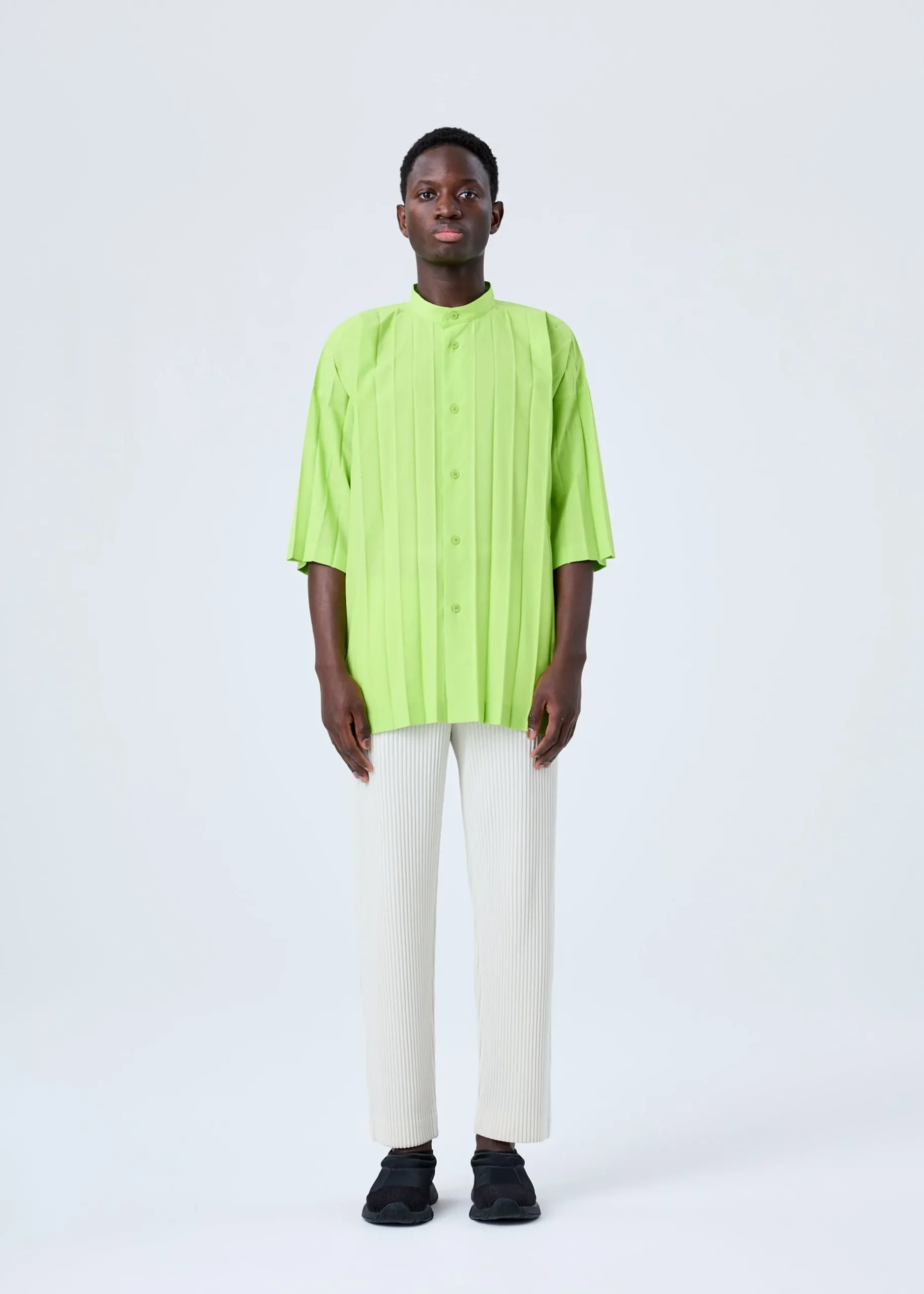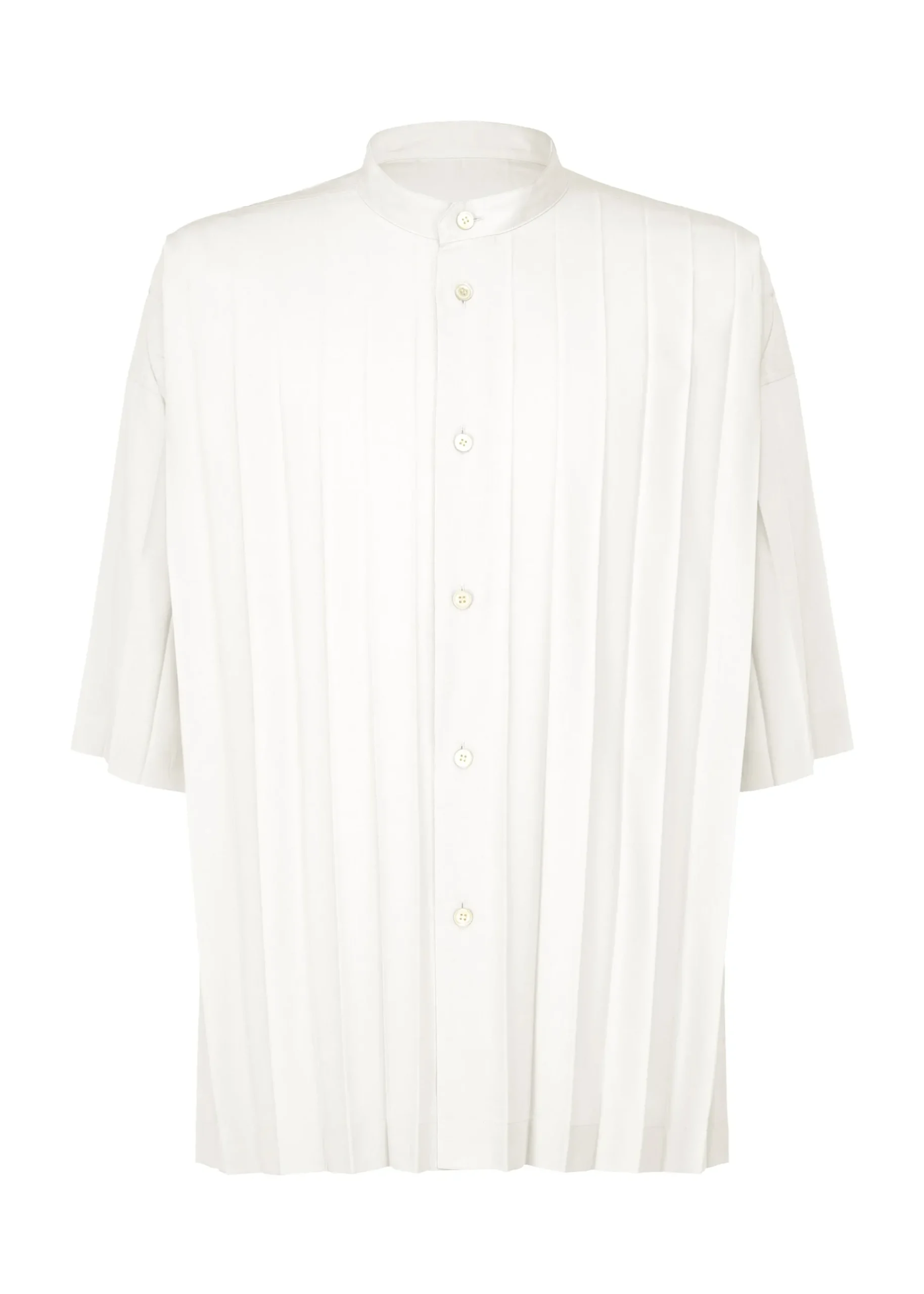 This short-sleeved shirt with a standing collar is made from thin, hand-pleated polyester fabric. It has slits on both sides.