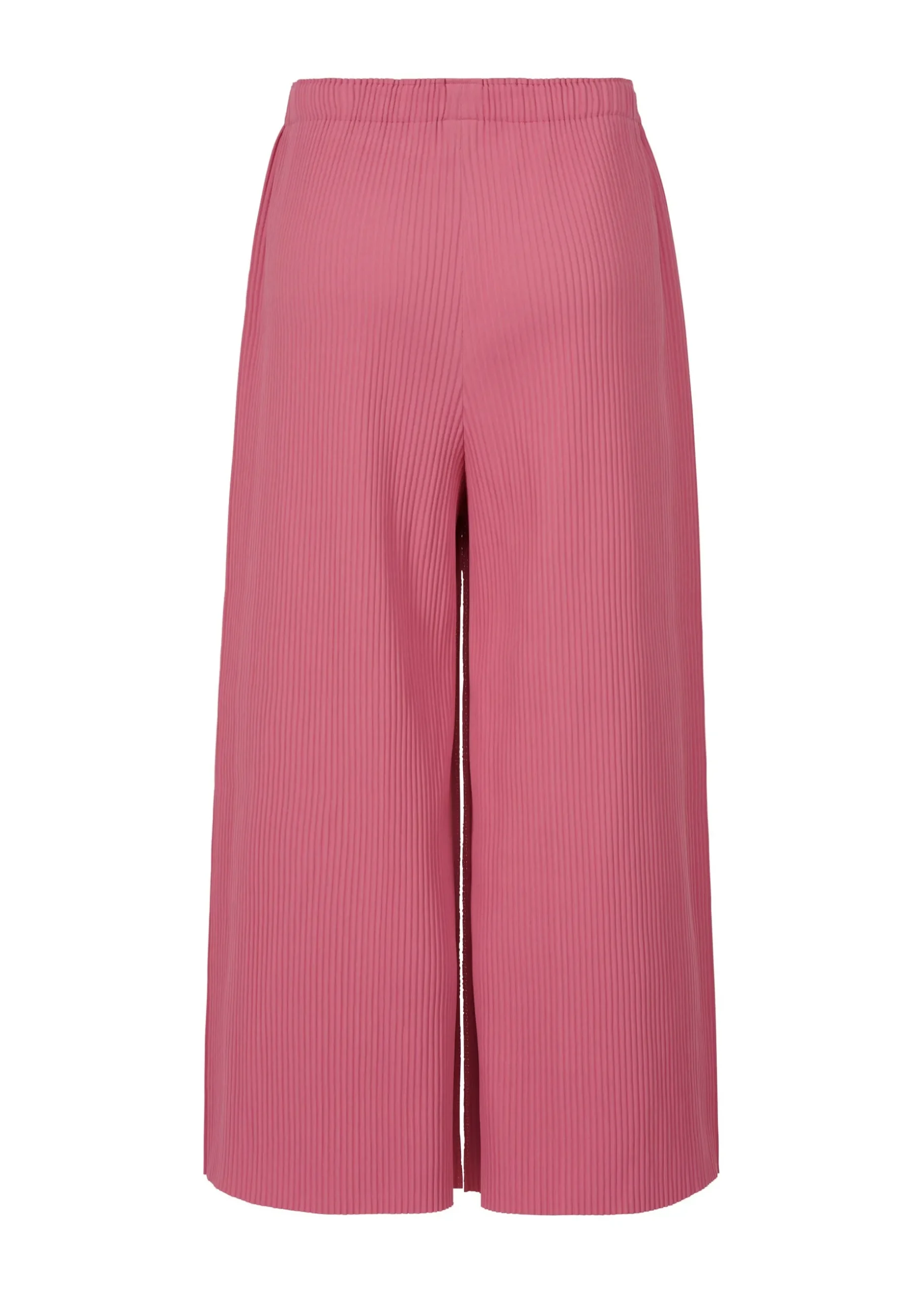 These fine knit, pleated, wide pants are characterized by their lightweight, soft feel and feature pleats applied to knit material made with stretchy, thin, soft yarn. There are pockets on both sides.
