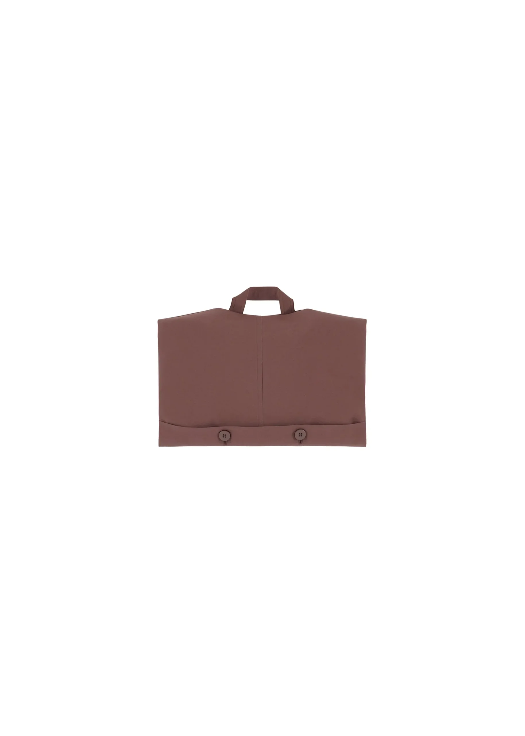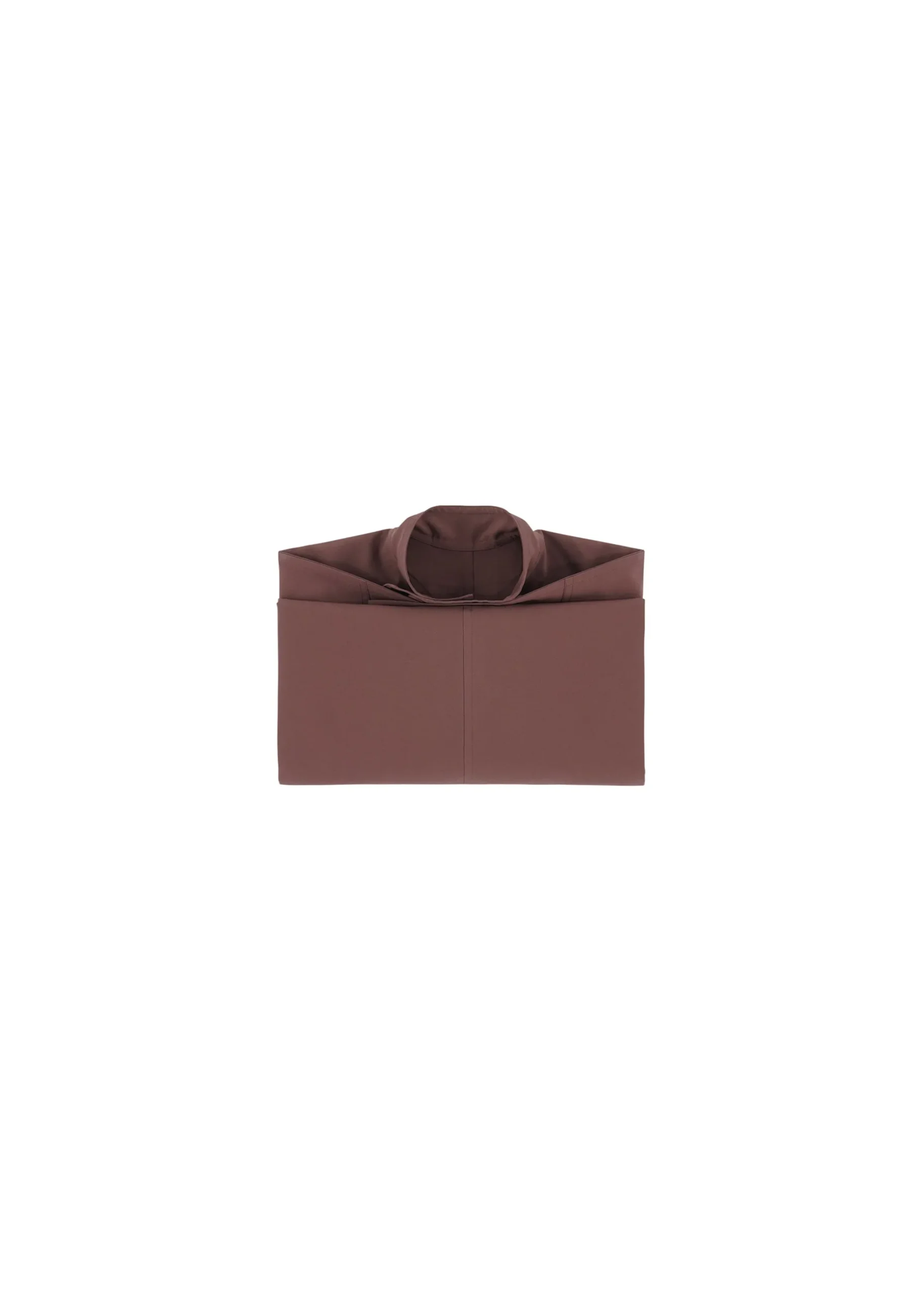 FLAT is crafted from plant-derived polyester yarn, ensuring wrinkle resistance. This innovative design explores the transformation of three-dimensional shapes into flat surfaces through pressed lines, which can be conveniently folded into a pocket within the hem for easy storage. When worn, FLAT highlights structural edges while conforming to the body’s natural contours.
