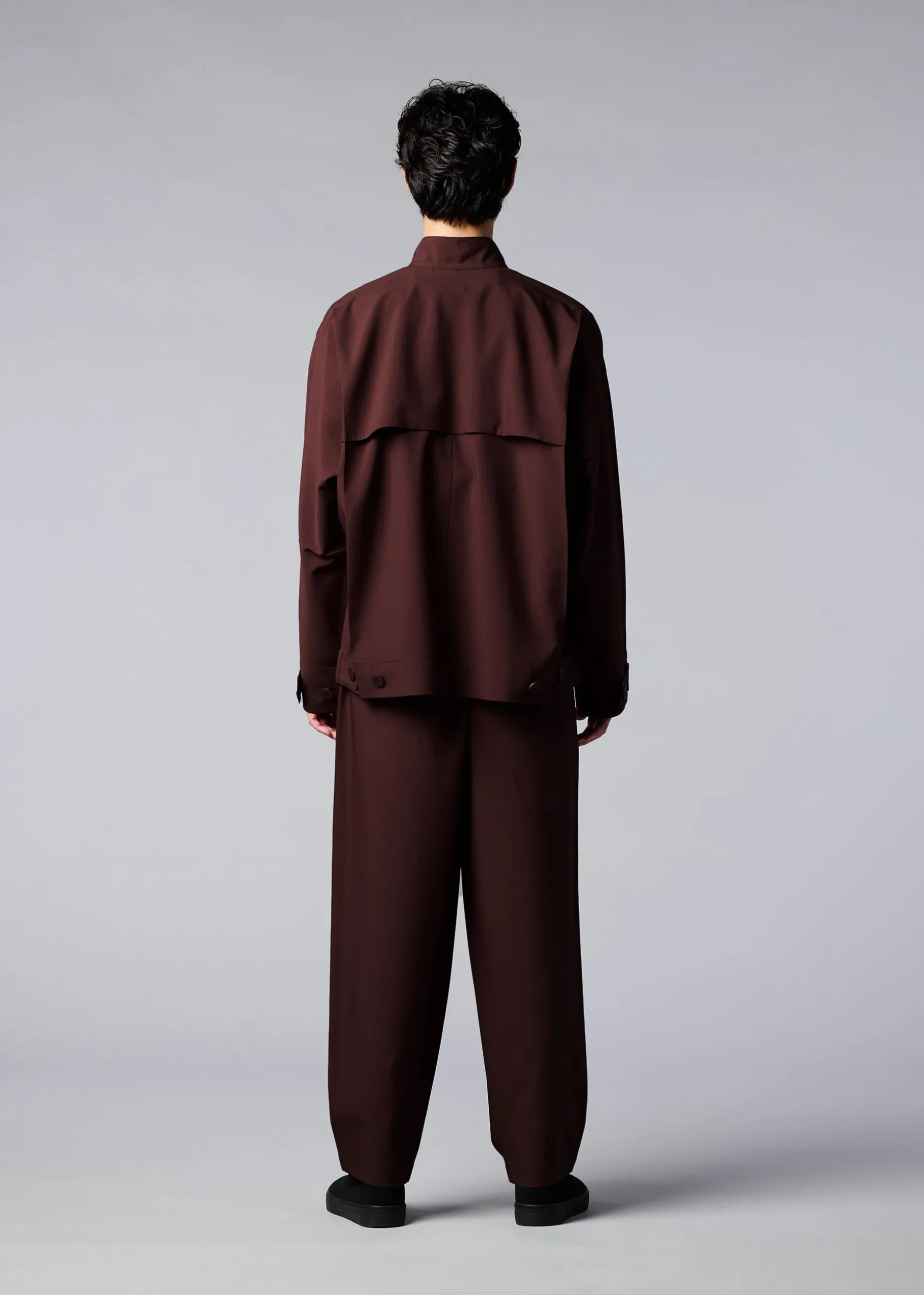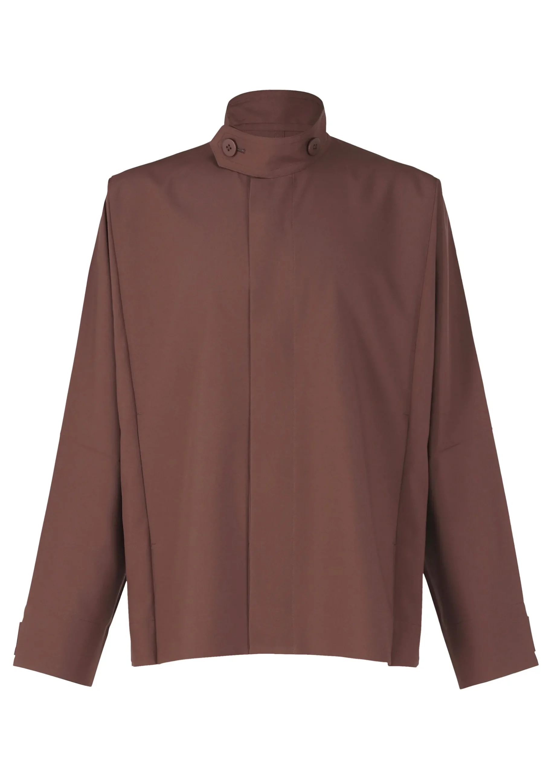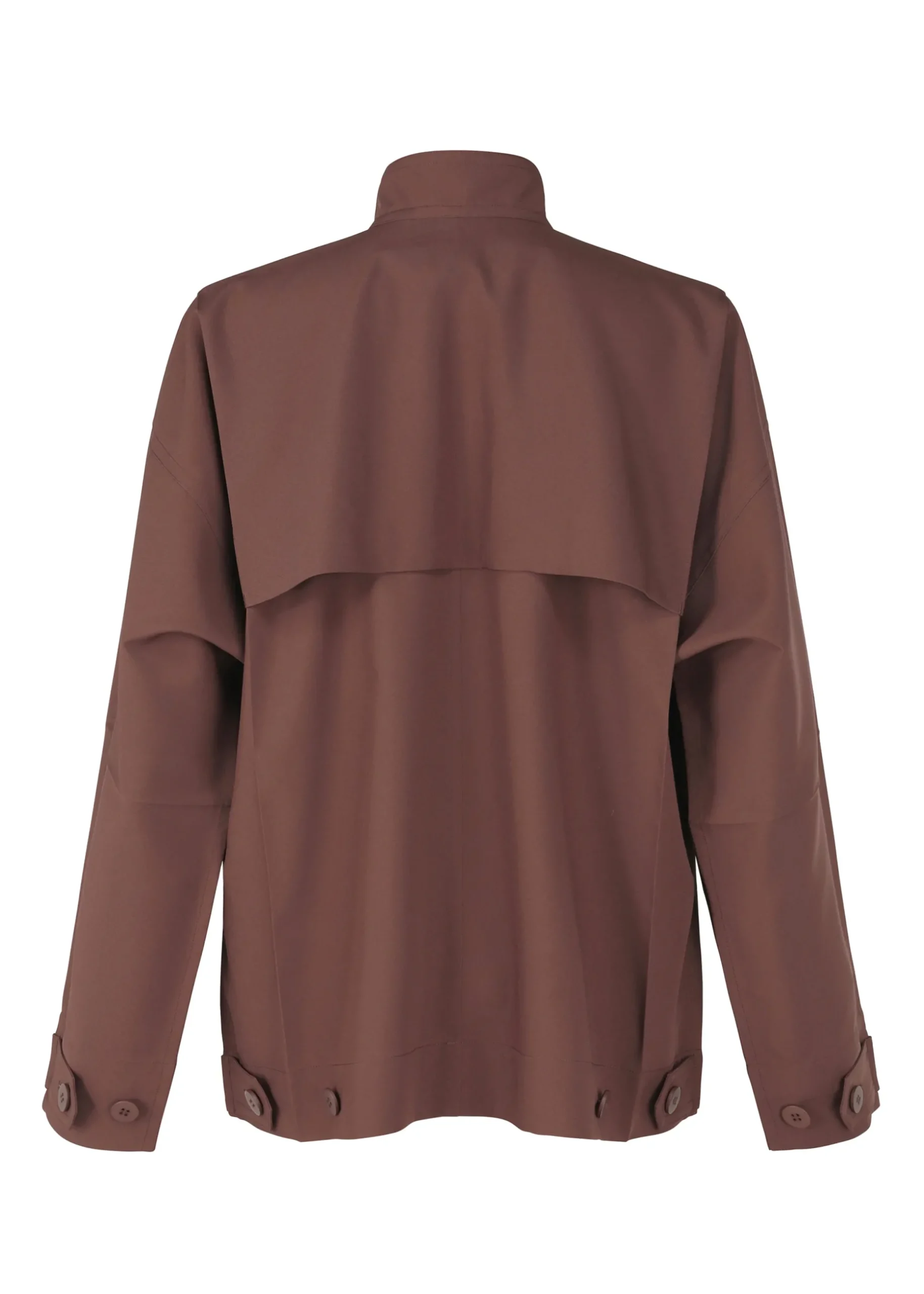 This jacket has a straight, tailored fit with a high buttoned collar, dolman sleeves, and two side pockets. It has buttons at the hems to create a cinched shape if desired. The coat can be folded to fit inside the pocket at the back of the hem for compact carrying.
