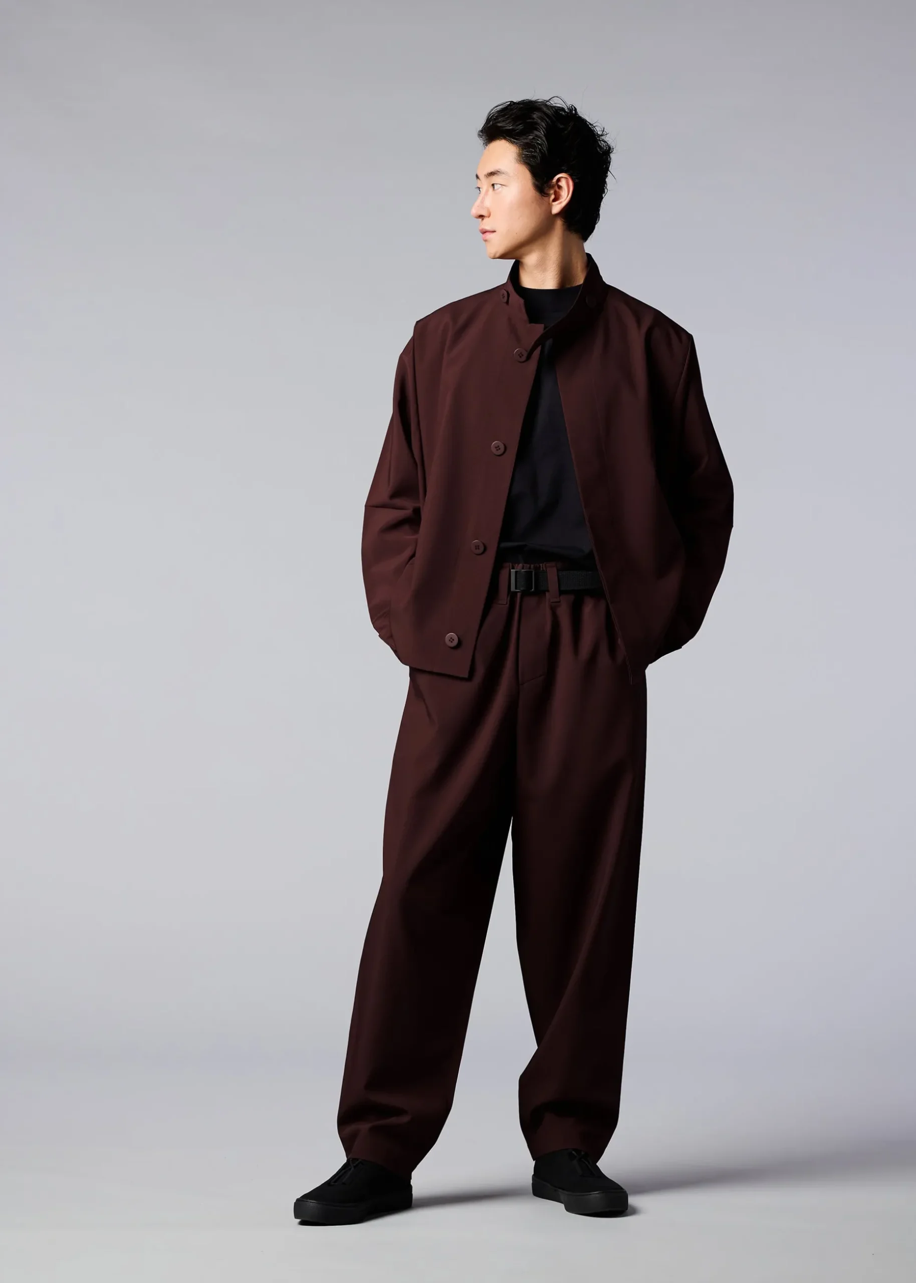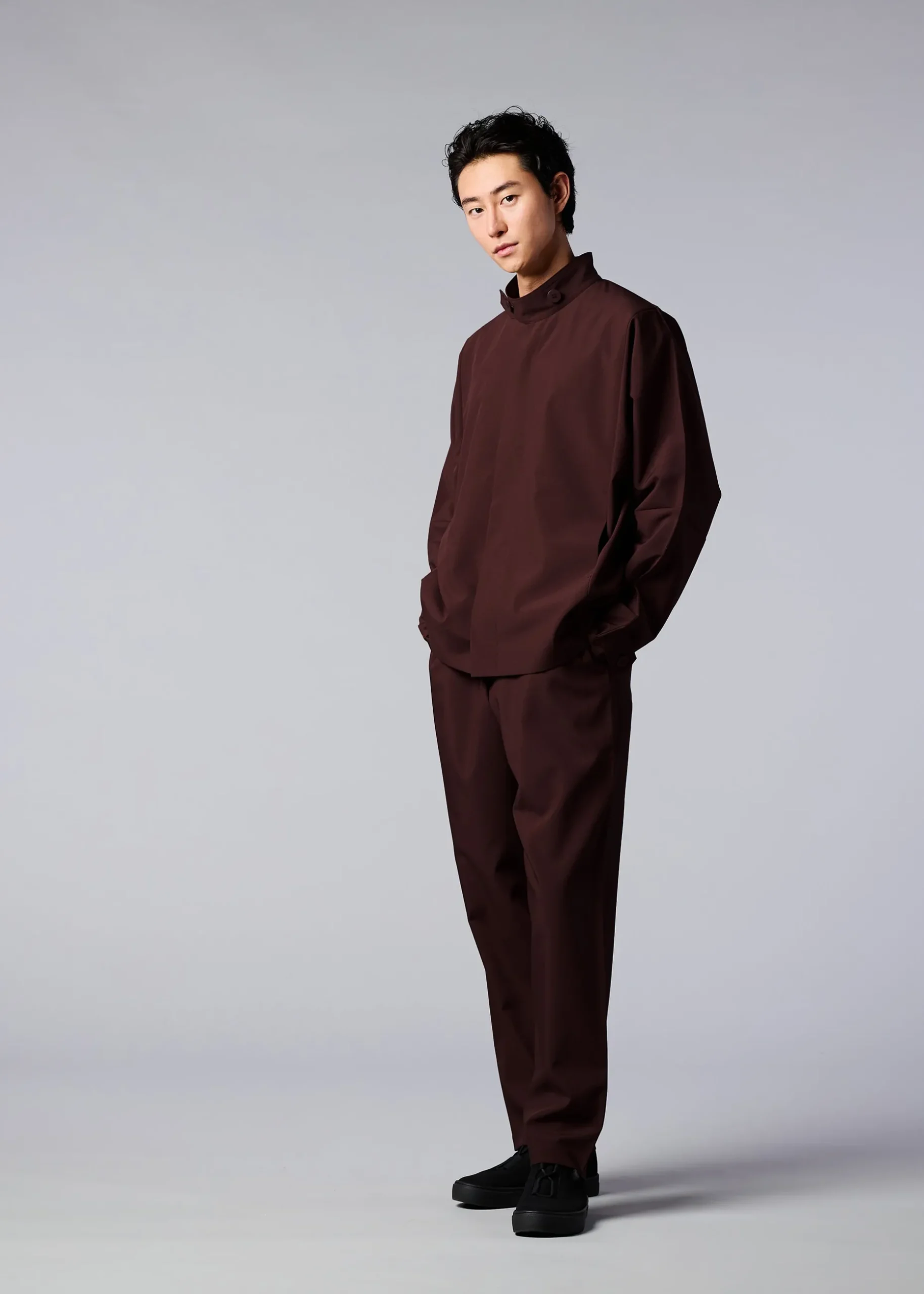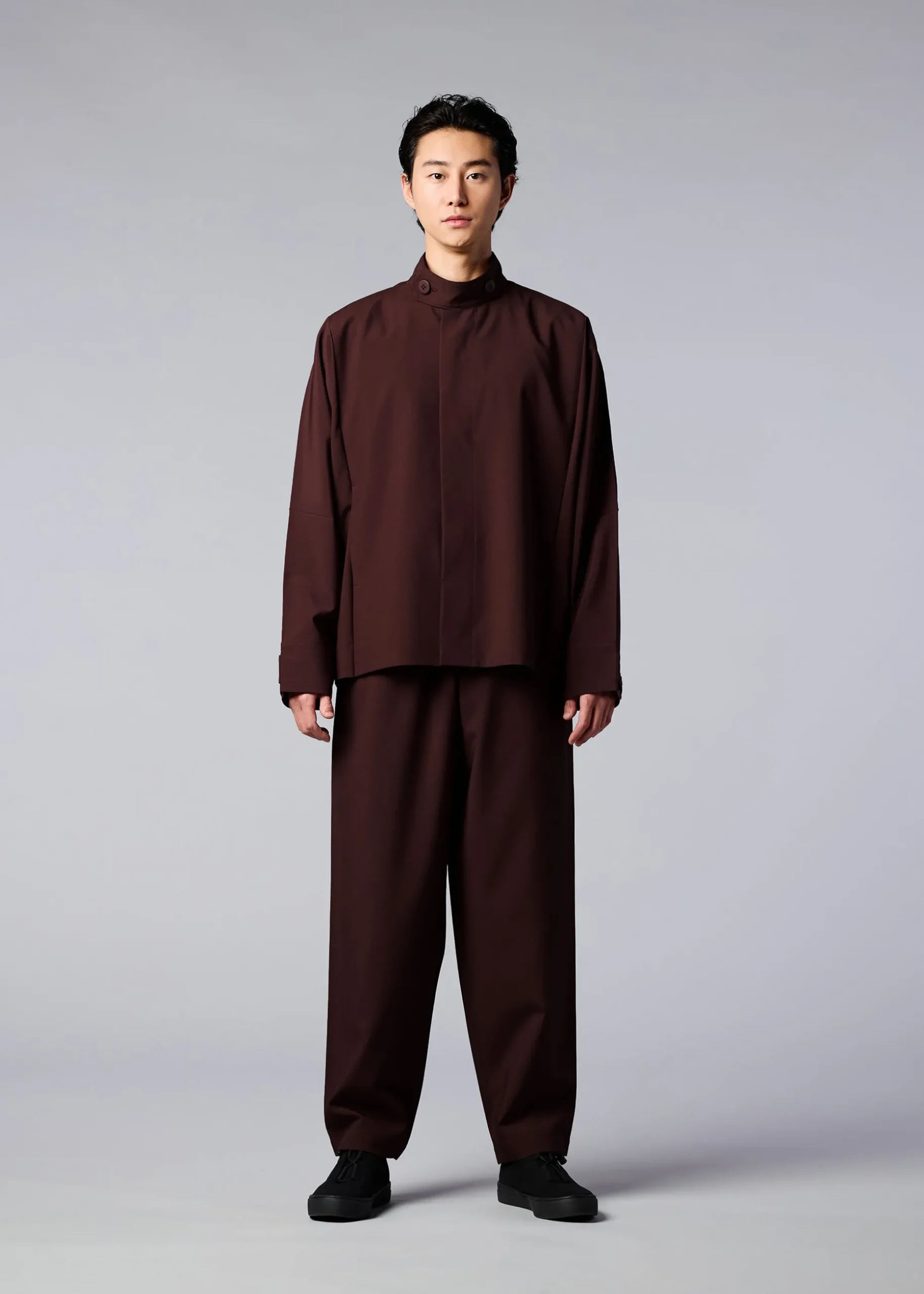 This jacket has a straight, tailored fit with a high buttoned collar, dolman sleeves, and two side pockets. It has buttons at the hems to create a cinched shape if desired. The coat can be folded to fit inside the pocket at the back of the hem for compact carrying.