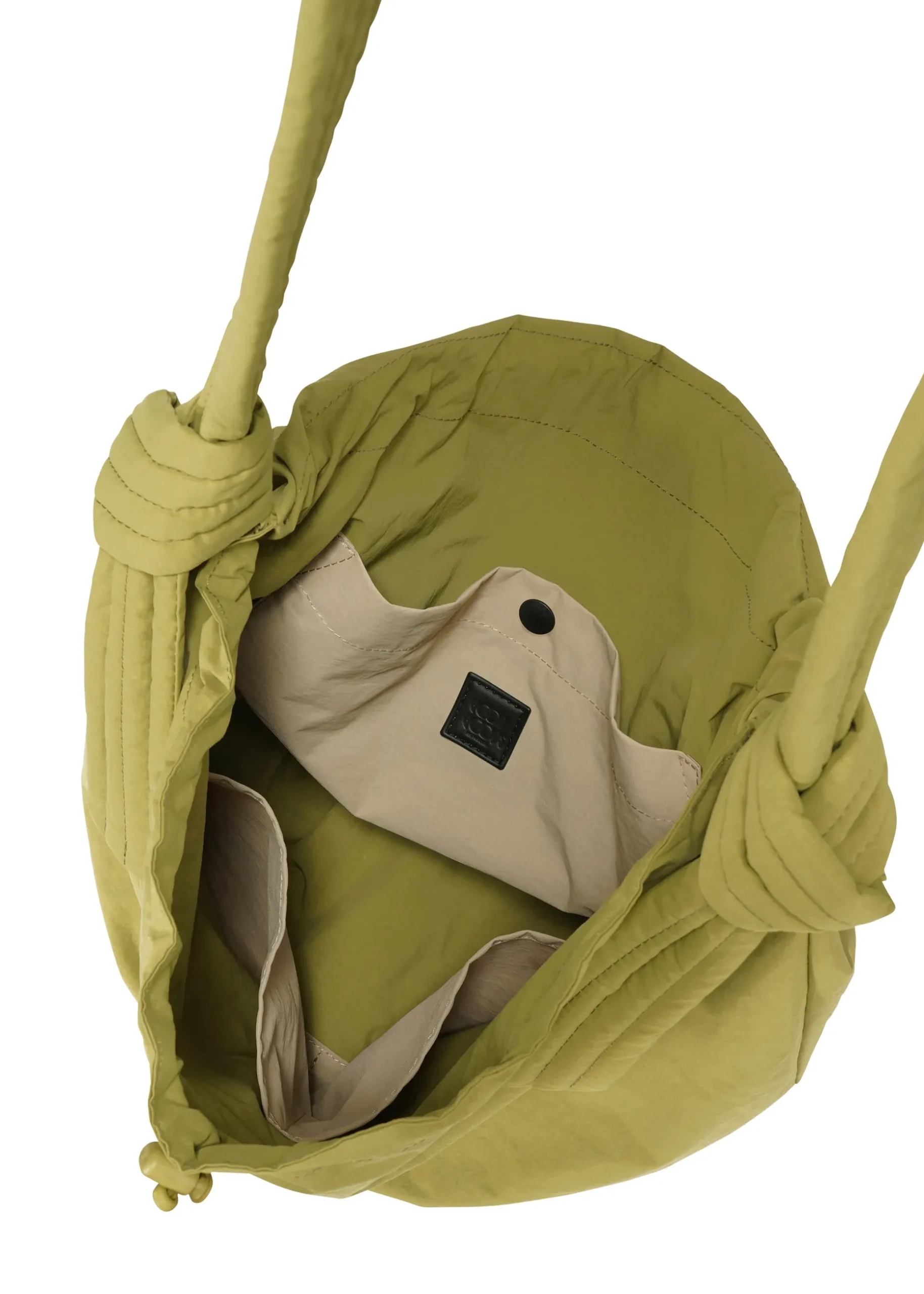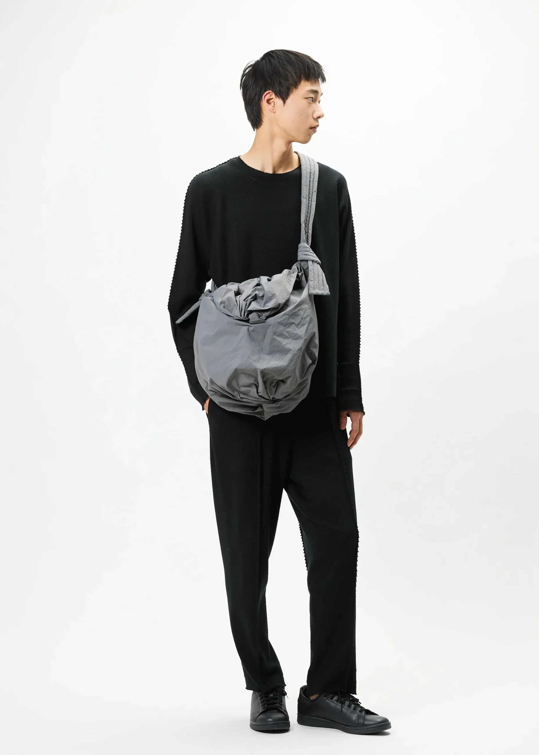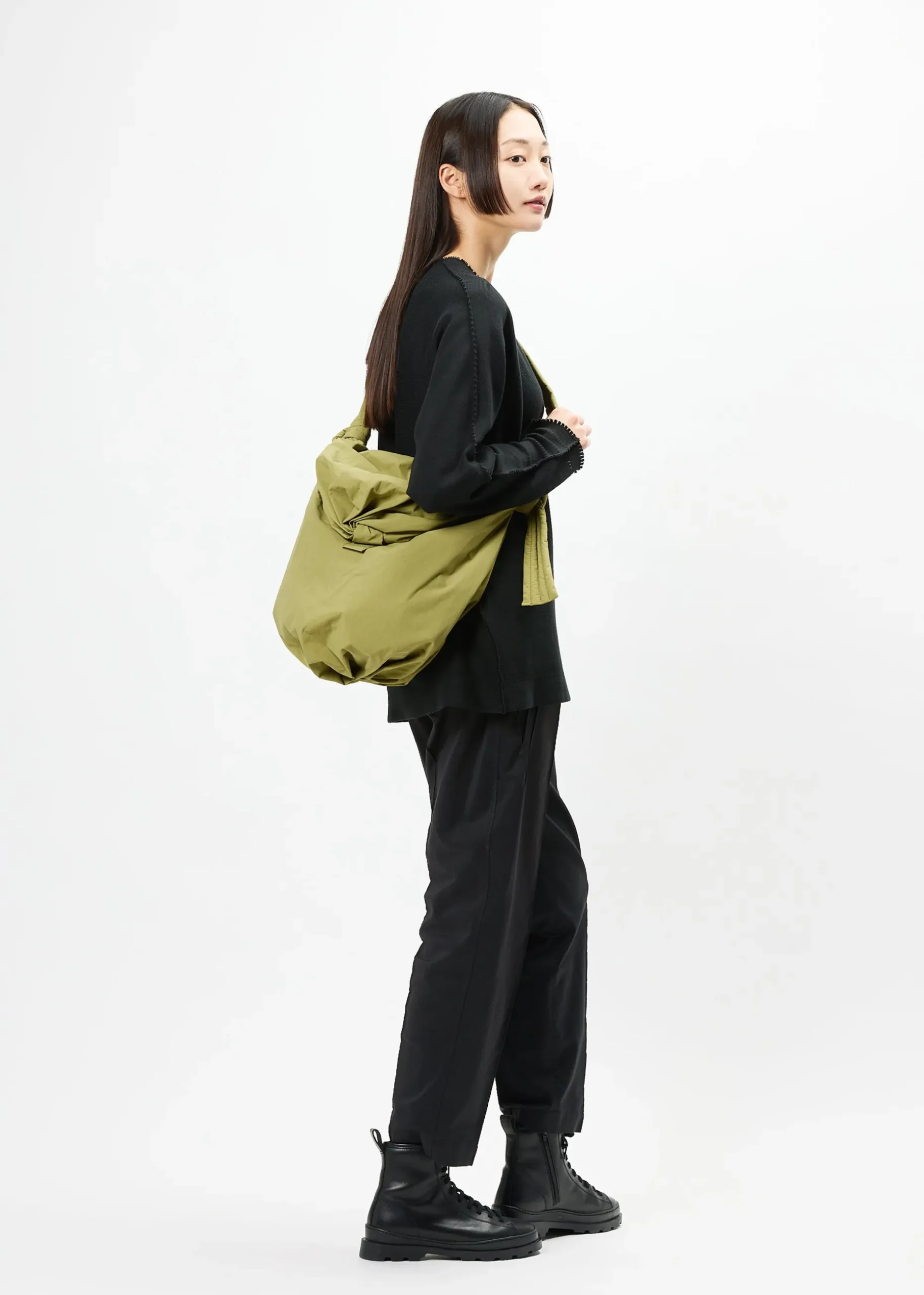 A lightweight and soft shoulder bag that gently hugs your body. It is a simple yet well-thought-out design that involves twisting and sewing together a single rectangular piece of fabric. The pattern, which uses even the smallest pieces of fabric as parts and eliminates waste, was inspired by Noragi and Monpe. Made from recycled nylon fabric dyed using natural ingredients.