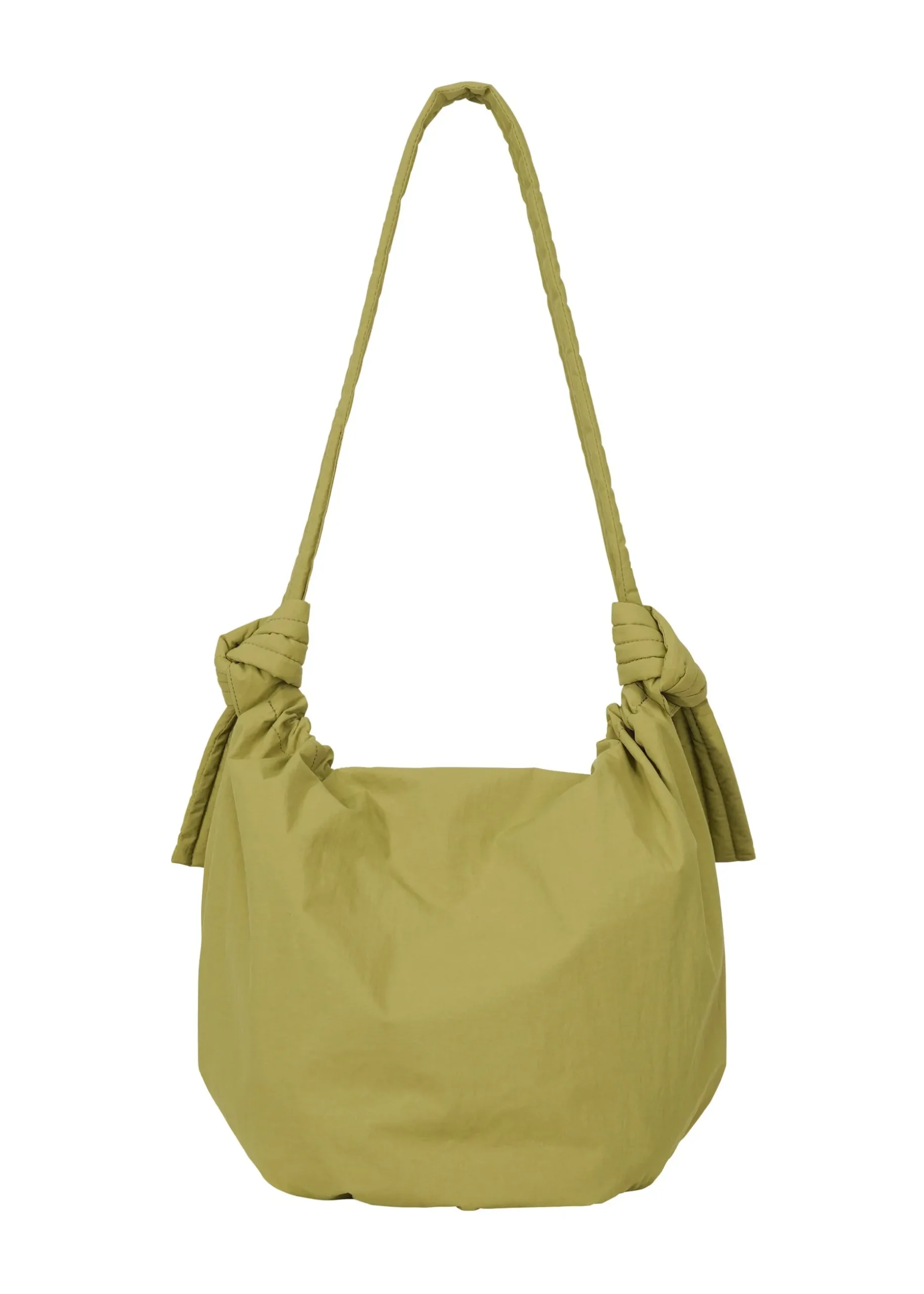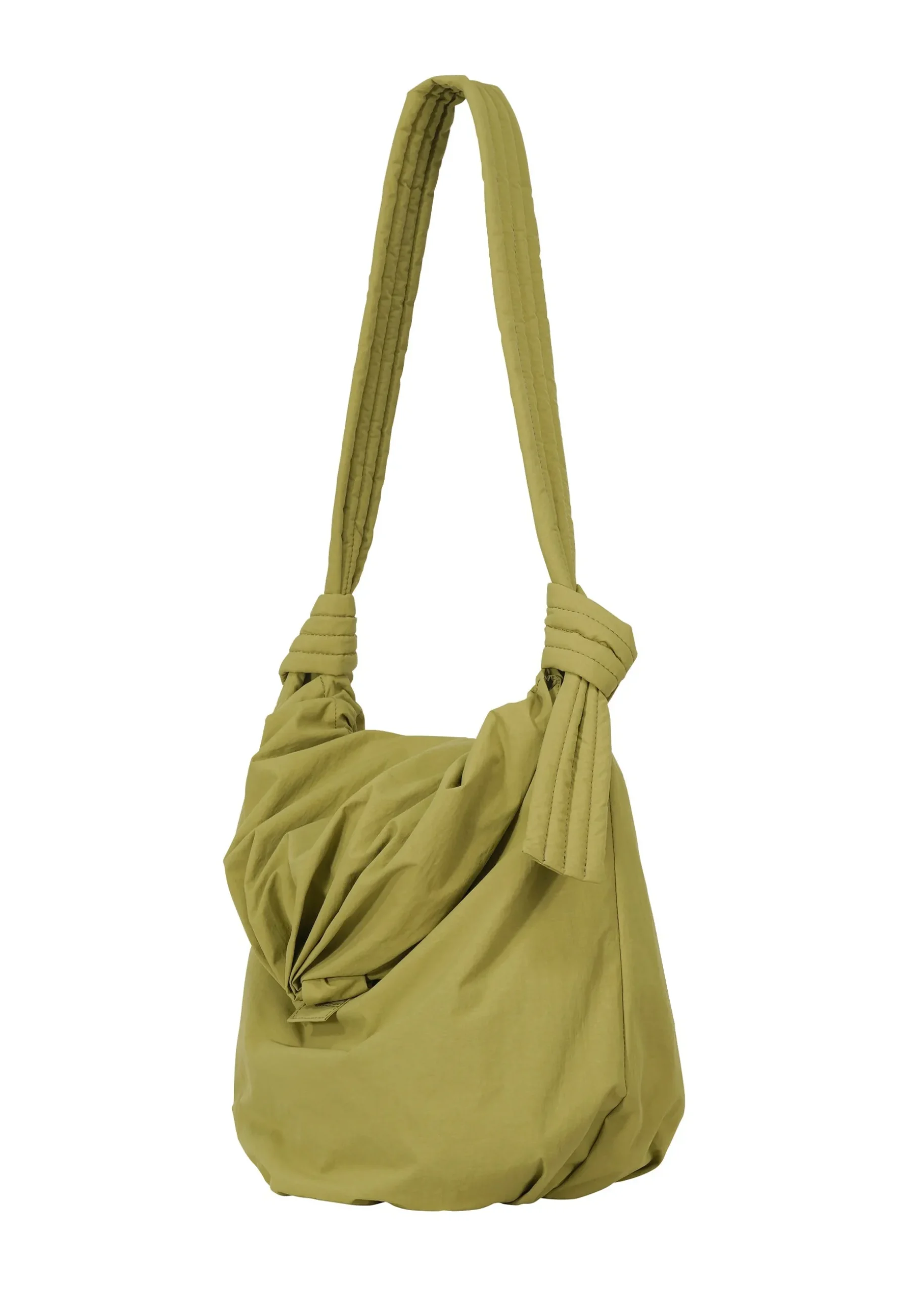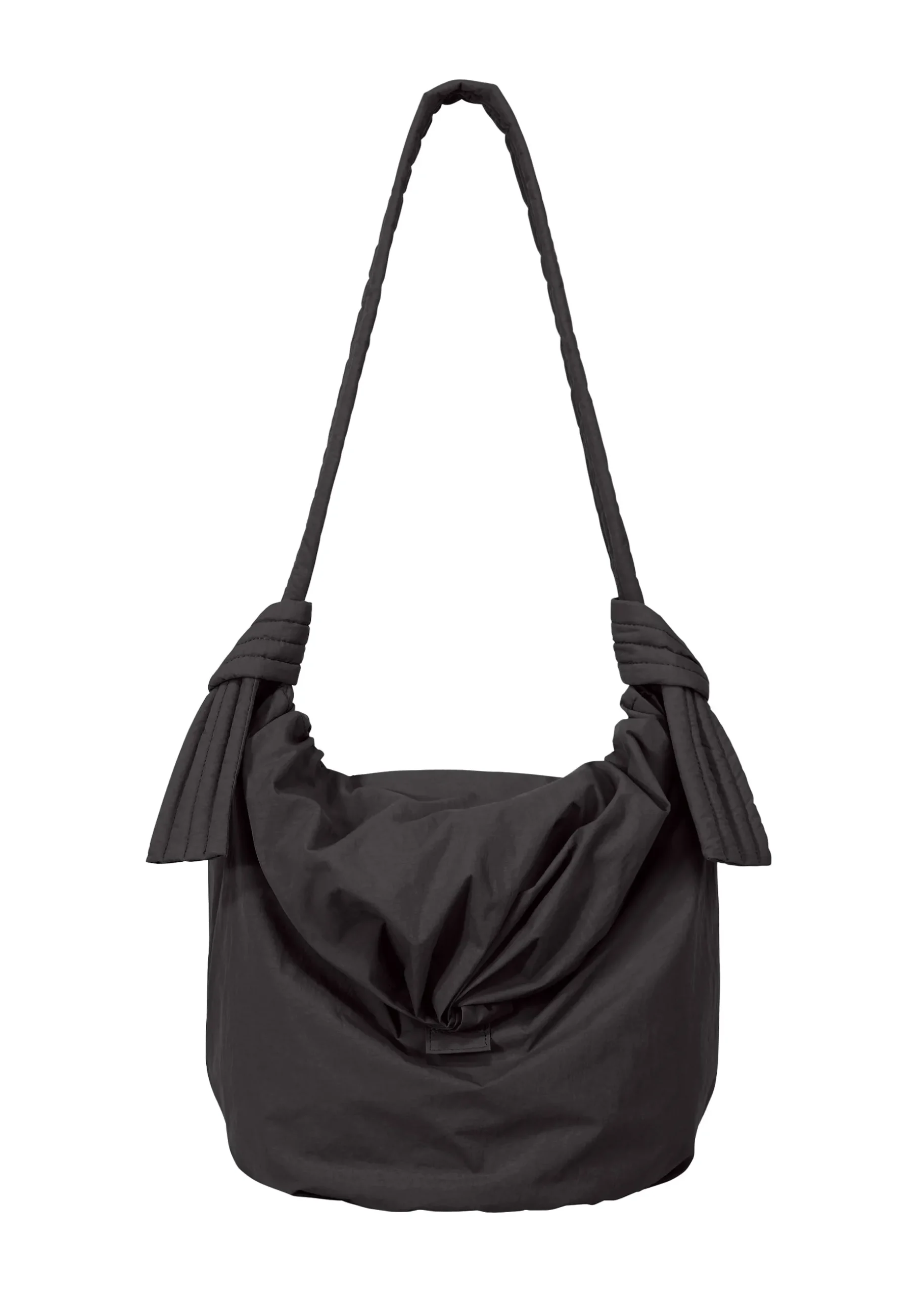 A lightweight and soft shoulder bag that gently hugs your body. It is a simple yet well-thought-out design that involves twisting and sewing together a single rectangular piece of fabric. The pattern, which uses even the smallest pieces of fabric as parts and eliminates waste, was inspired by Noragi and Monpe. Made from recycled nylon fabric dyed using natural ingredients.