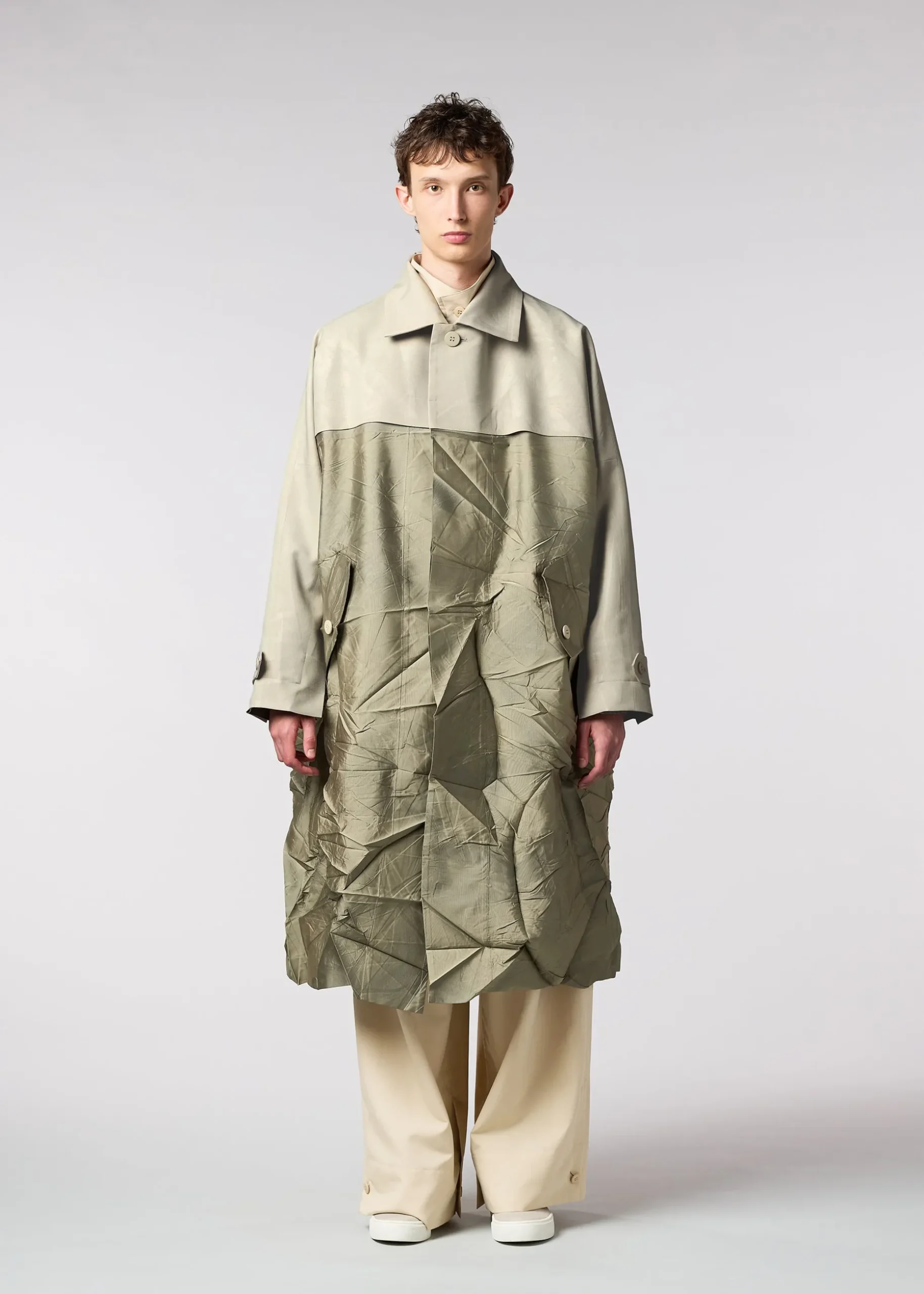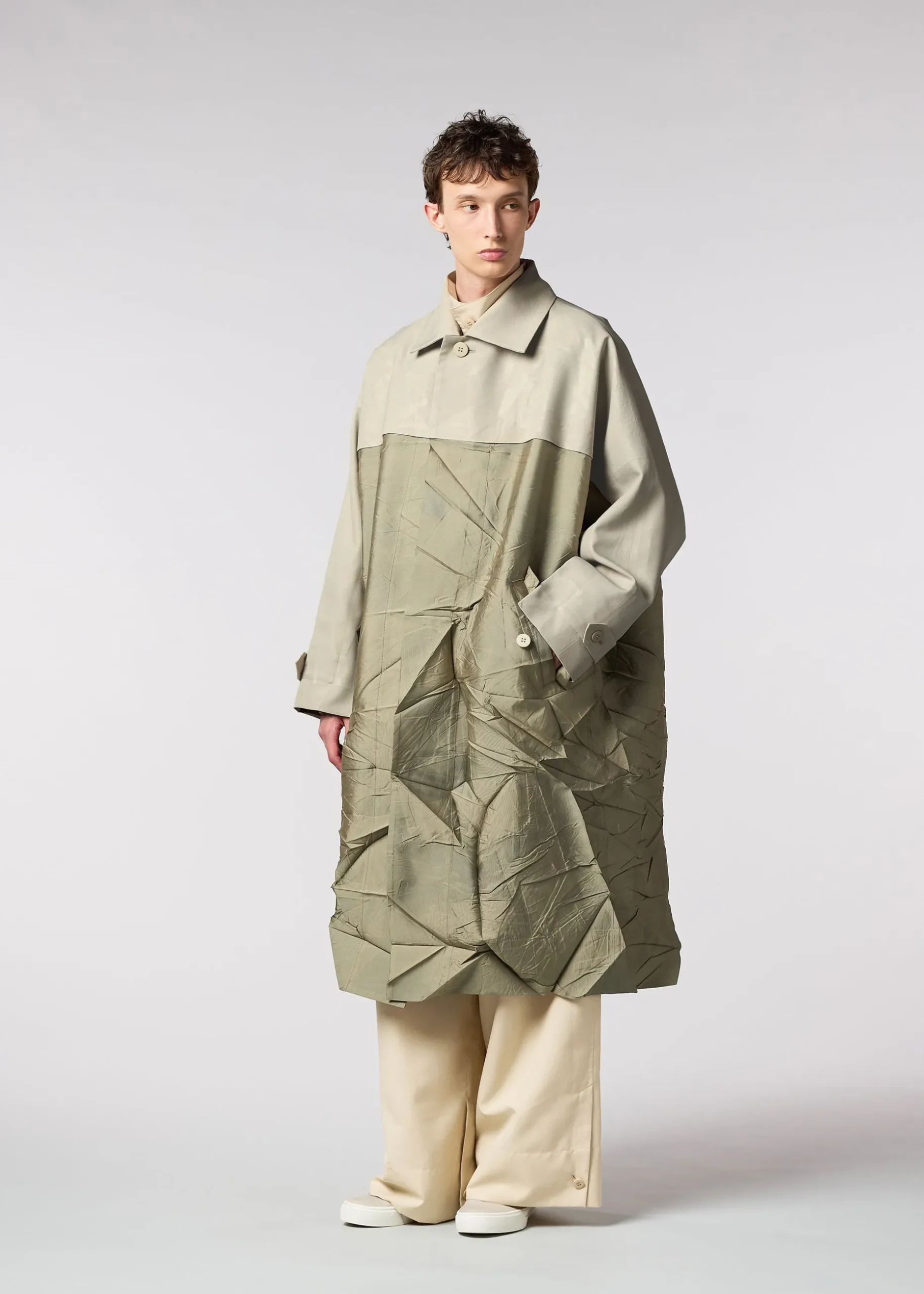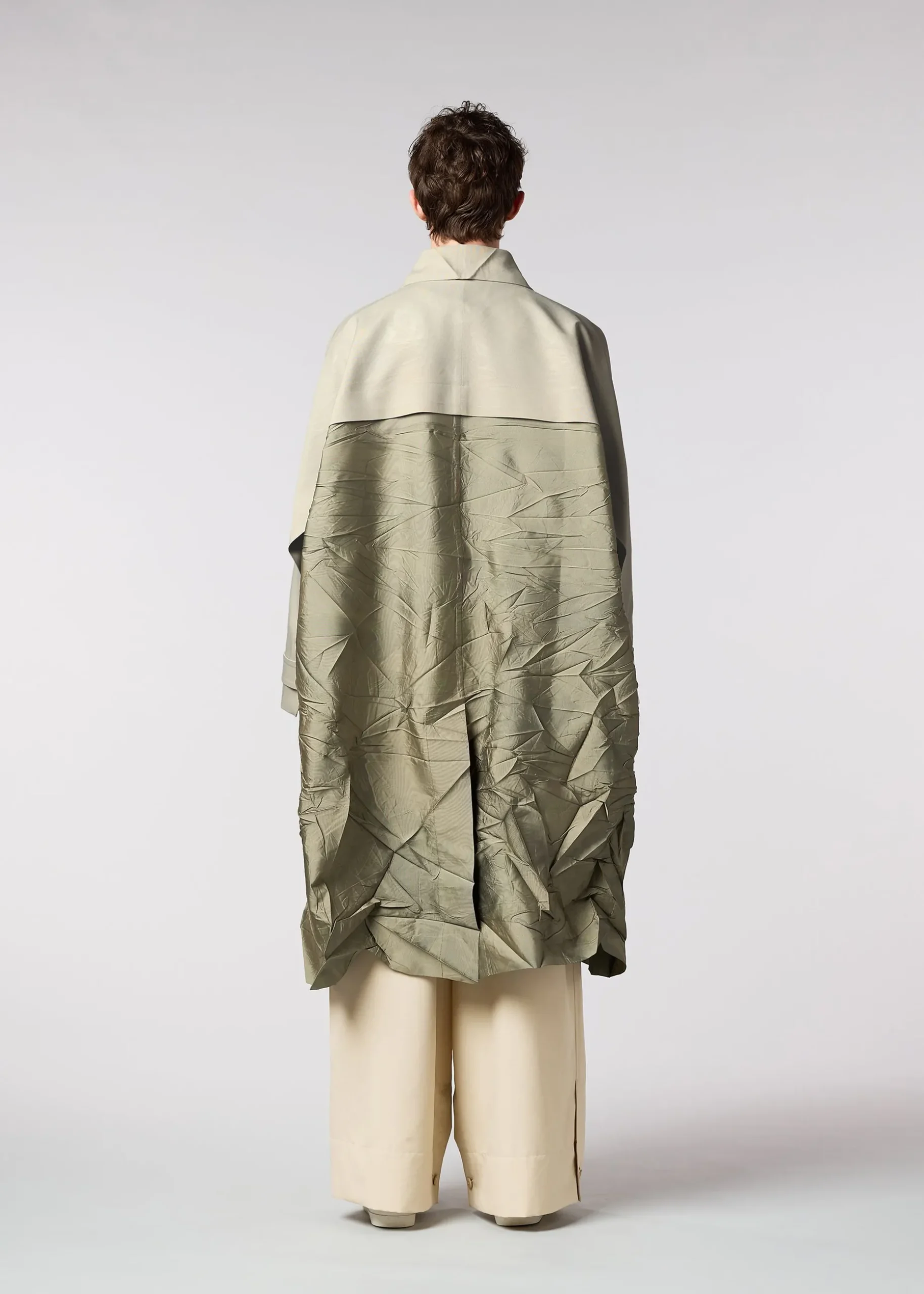 A coat that features a contrast between matte, flat areas and shiny, randomly wrinkled areas. The other parts are folded randomly to fit inside the flat upper body, and the shape is created by pressing.