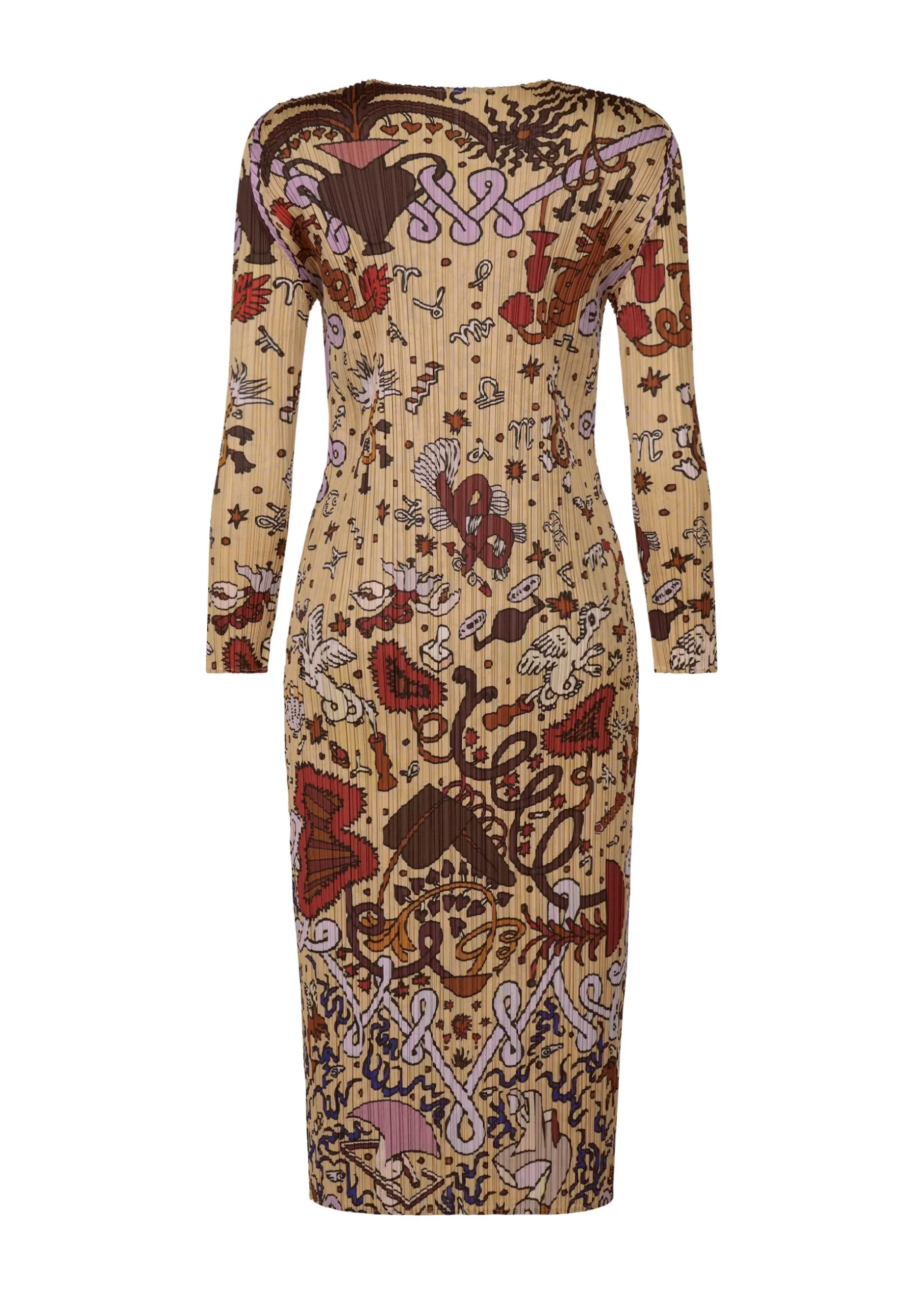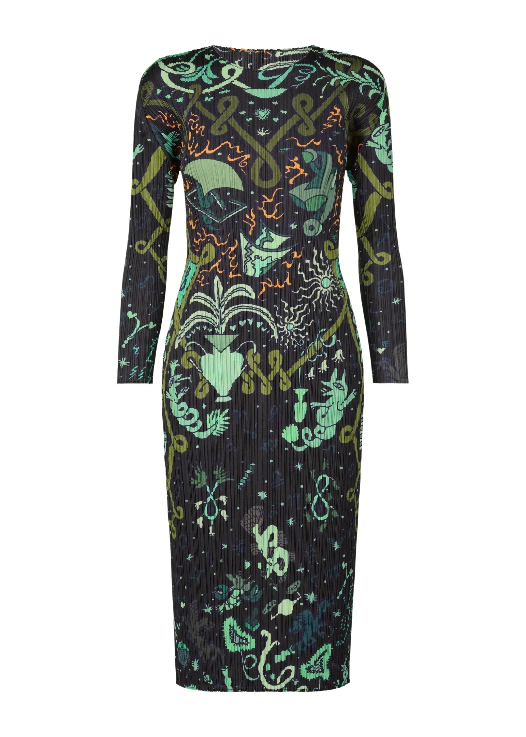 This round-neck, long-sleeved dress has a print that depicts exciting imaginary scenery in outer space.