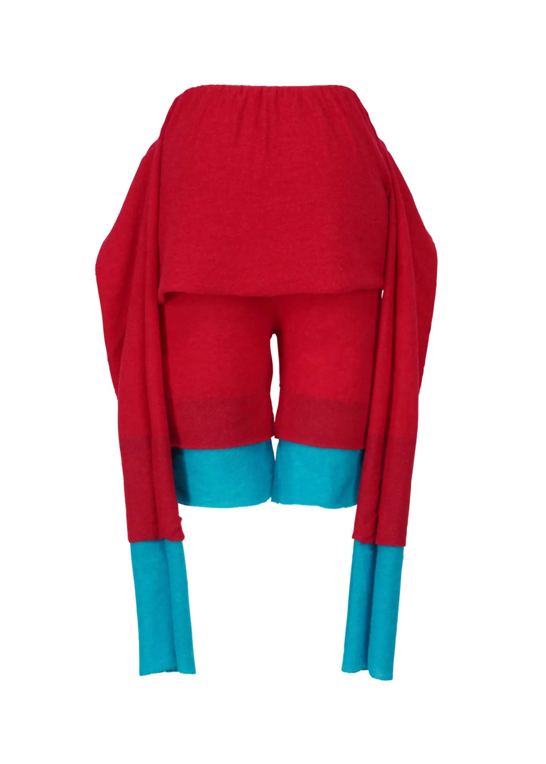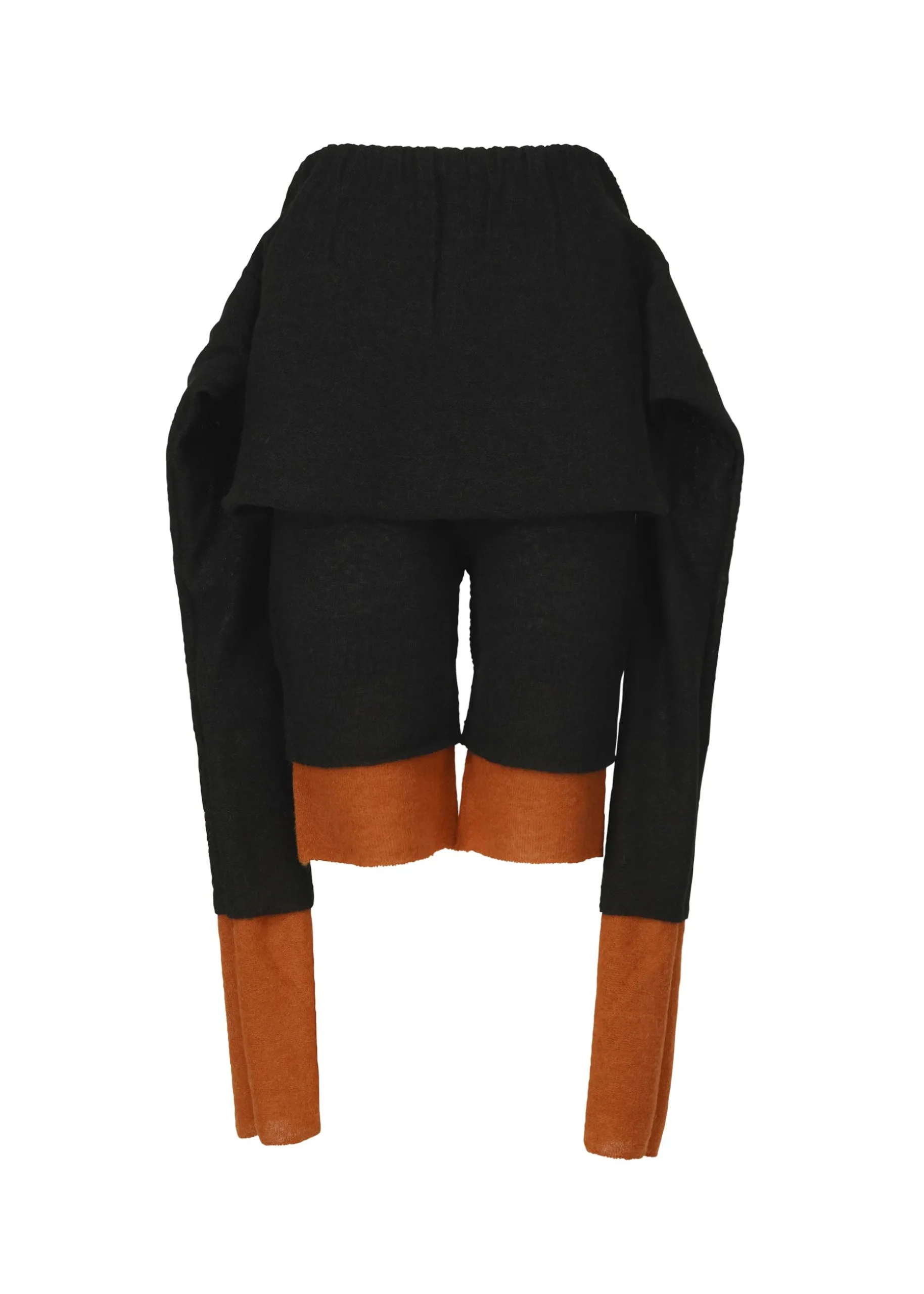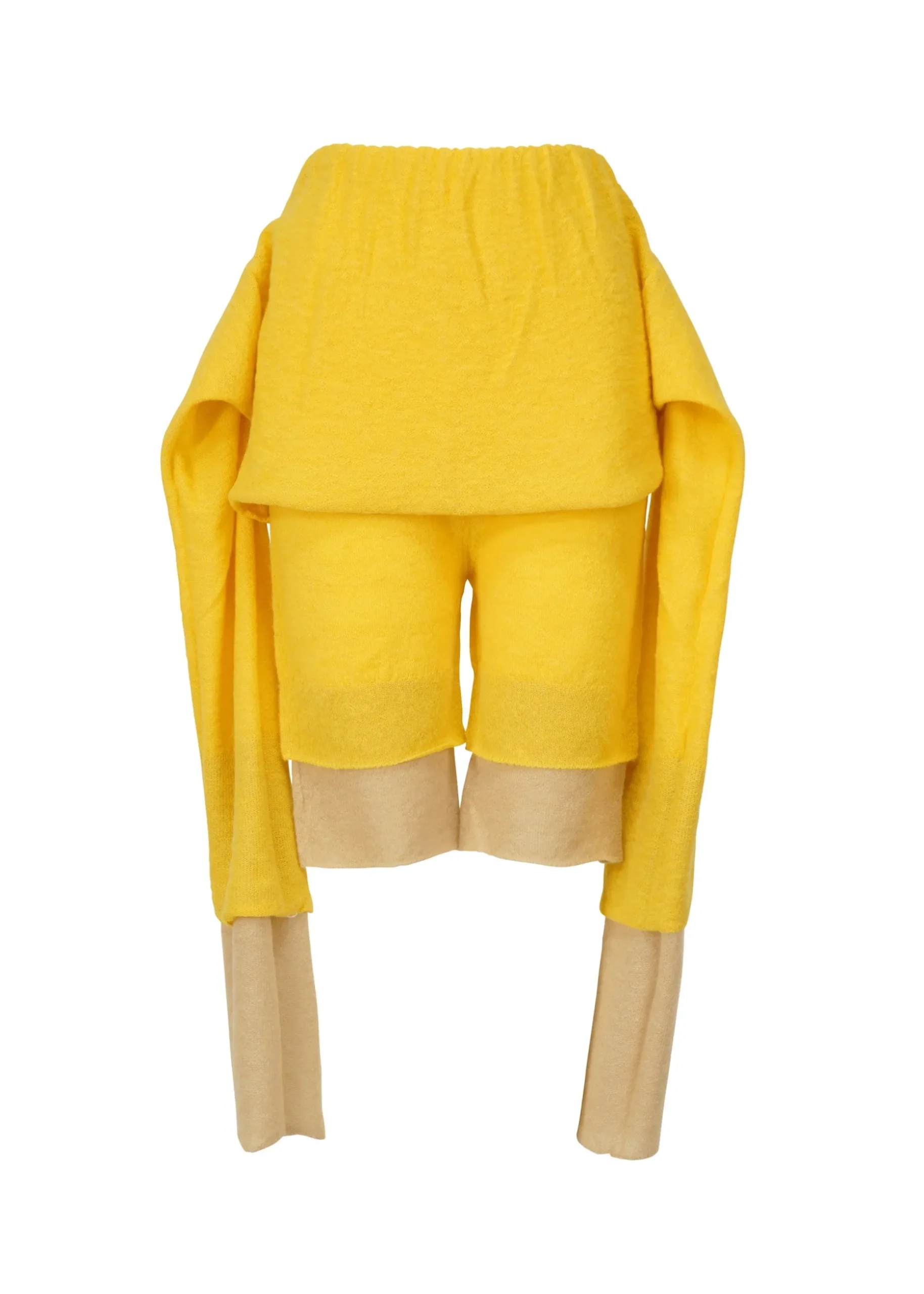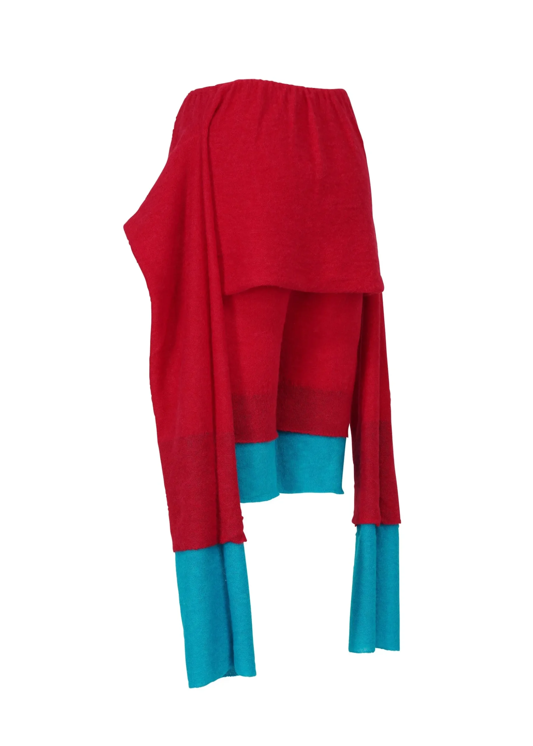 These non-sewn knit shorts are based on the concept of layering colors and feature an eye-catching dual color scheme expressed through a double-layered knit design. The design has layers of different colors and lengths stacked vertically, allowing you to enjoy a layered style with a single piece of knit clothing. The warm, soft feel of the fabric and versatile styling options make this an appealing item.