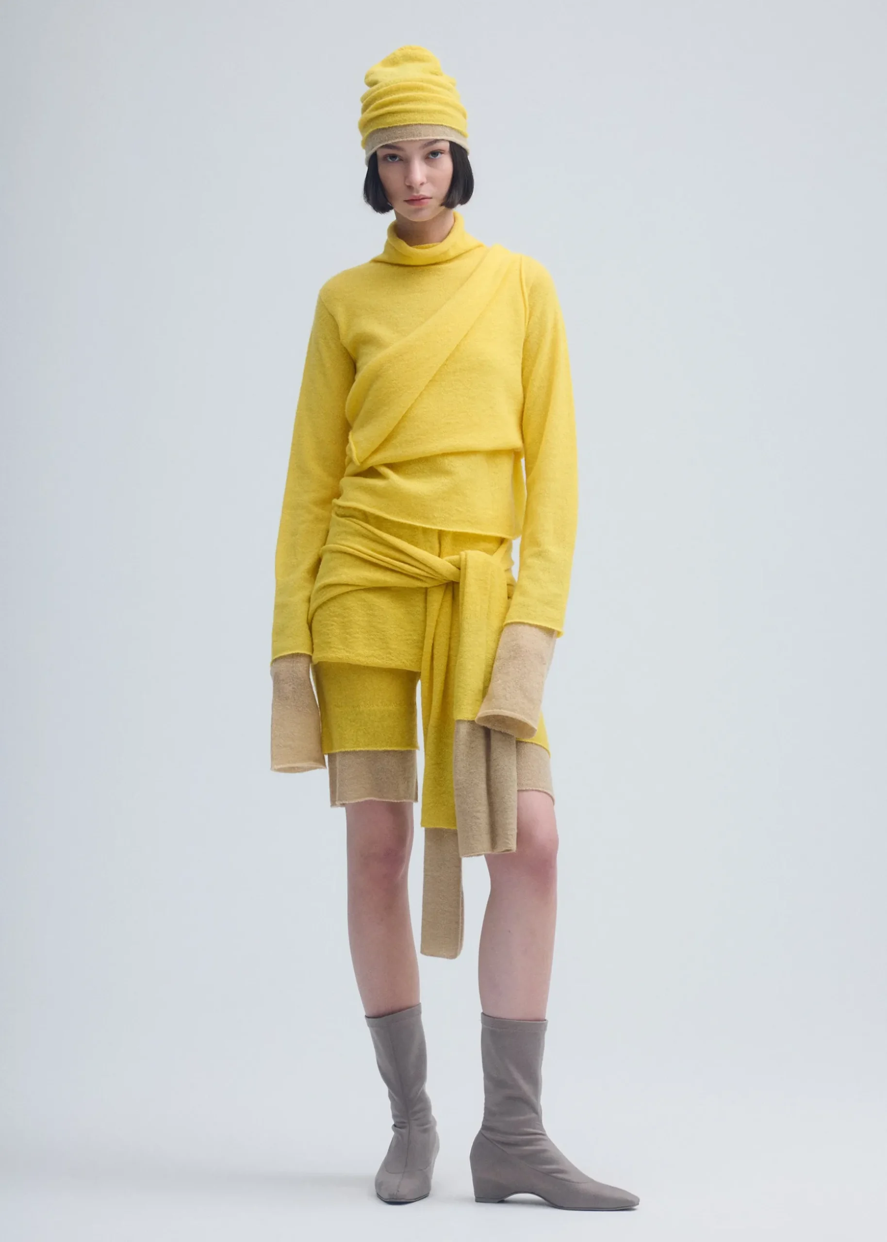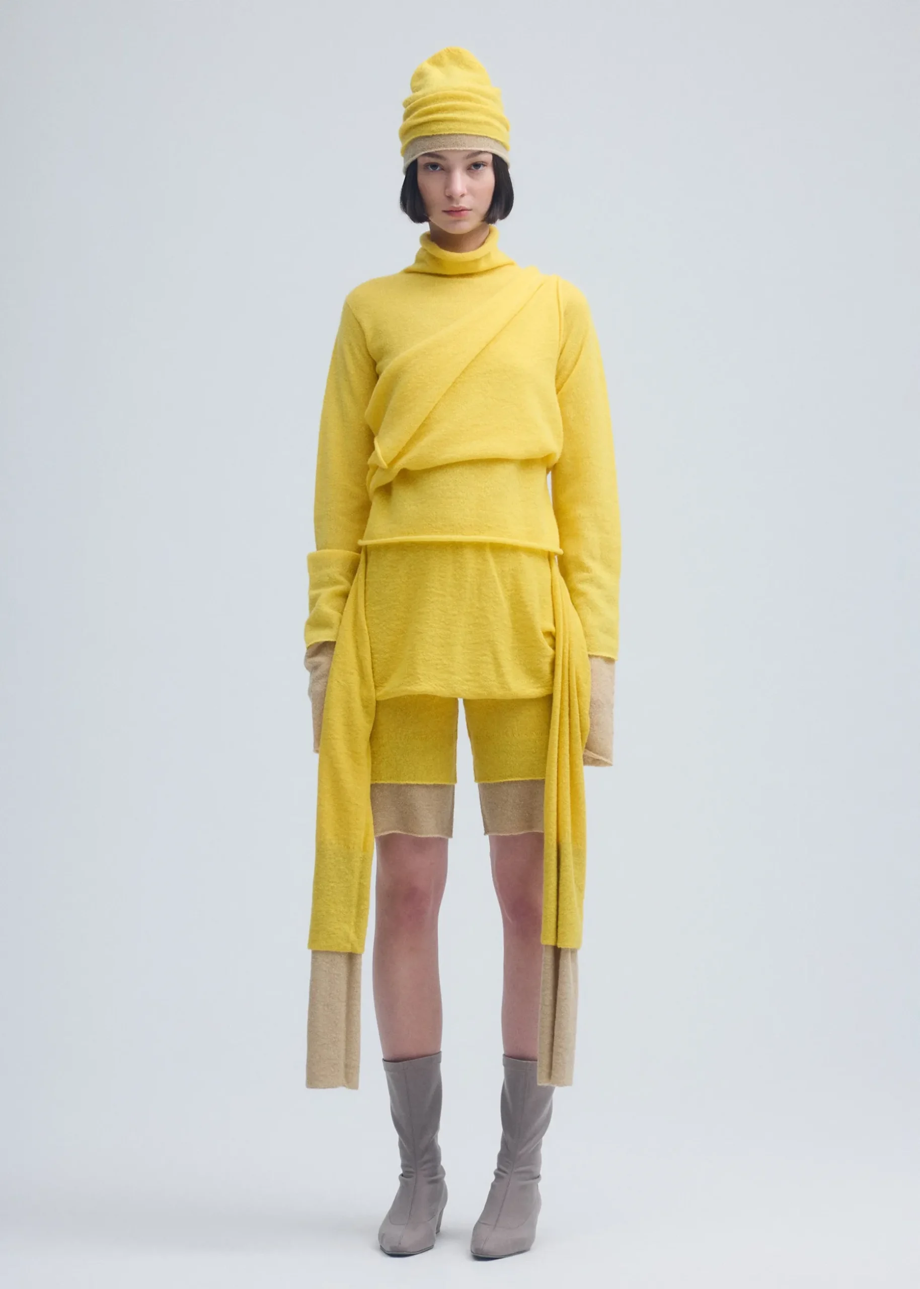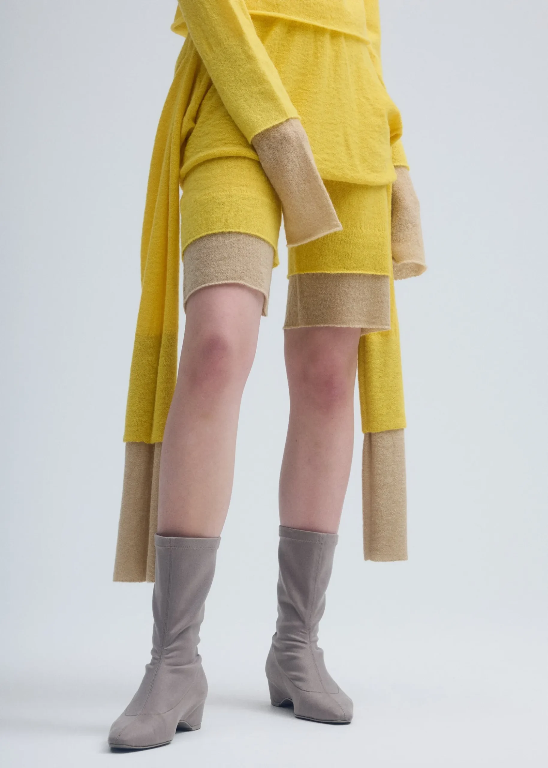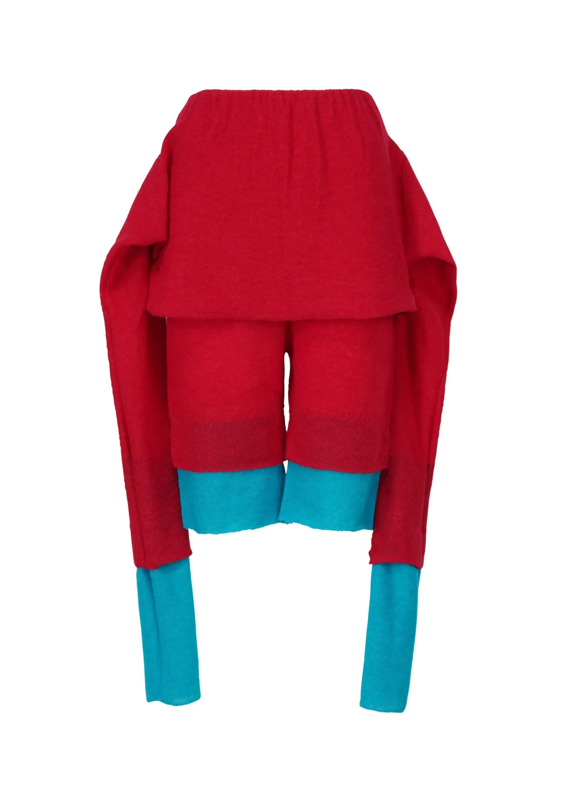 These non-sewn knit shorts are based on the concept of layering colors and feature an eye-catching dual color scheme expressed through a double-layered knit design. The design has layers of different colors and lengths stacked vertically, allowing you to enjoy a layered style with a single piece of knit clothing. The warm, soft feel of the fabric and versatile styling options make this an appealing item.