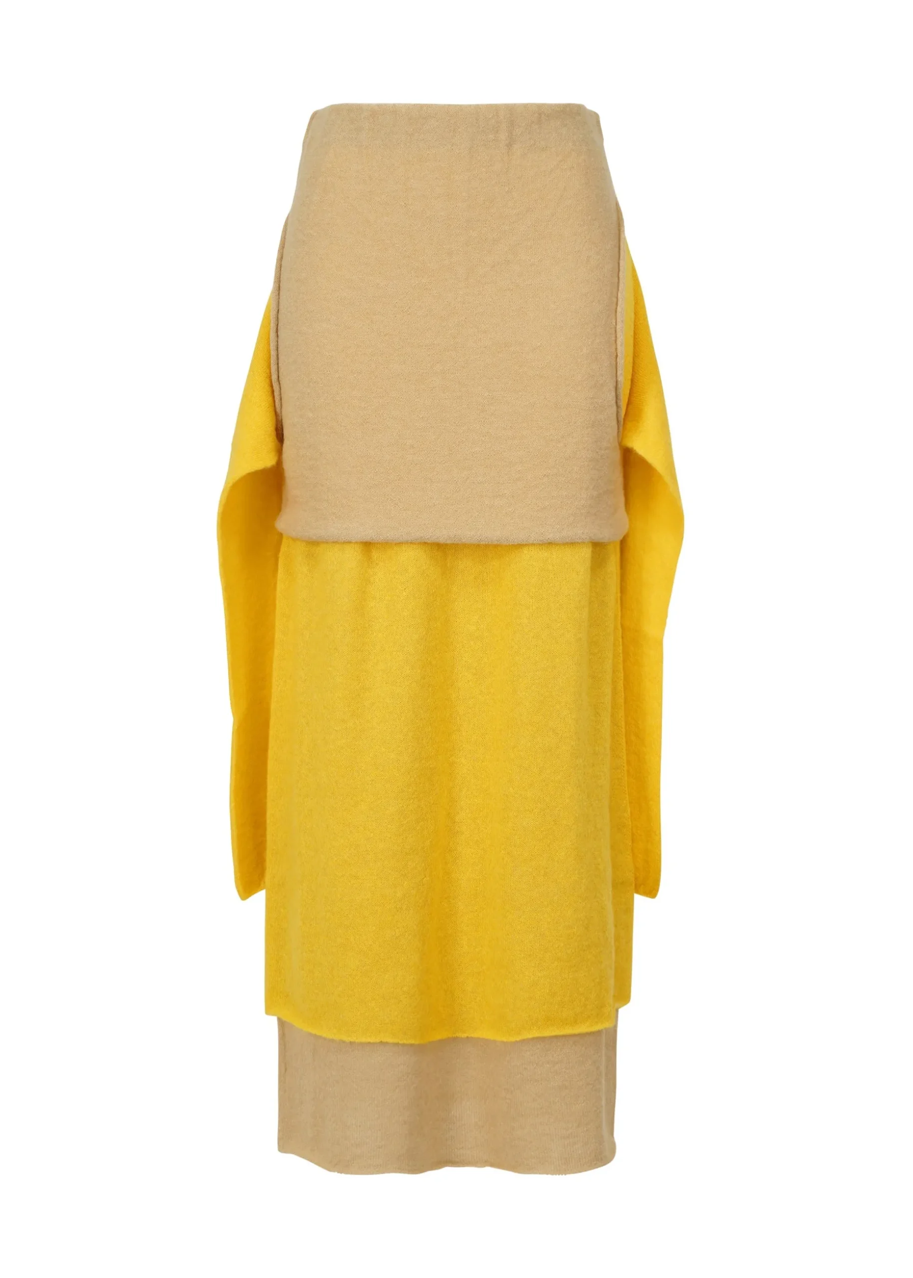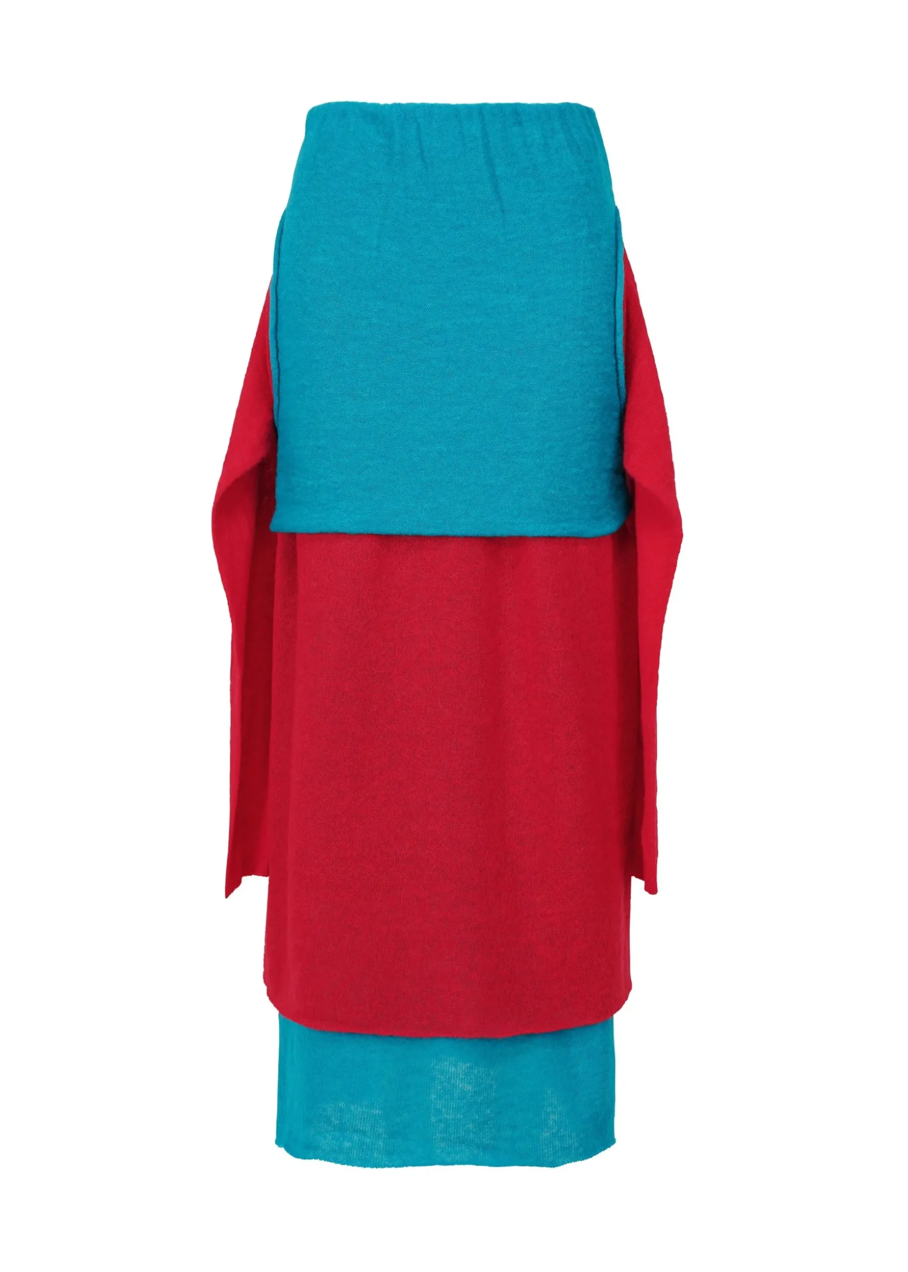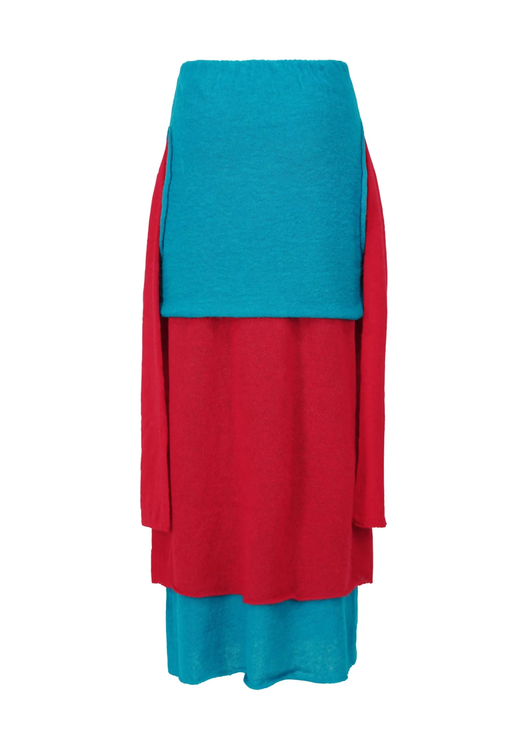 This non-sewn knit skirt is based on the concept of layering colors and features an eye-catching dual color scheme expressed through a double-layered knit design. The design has layers of different colors and lengths stacked vertically, allowing you to enjoy a layered style with a single piece of knit clothing. The warm, soft feel of the fabric and versatile styling options make this an appealing item.