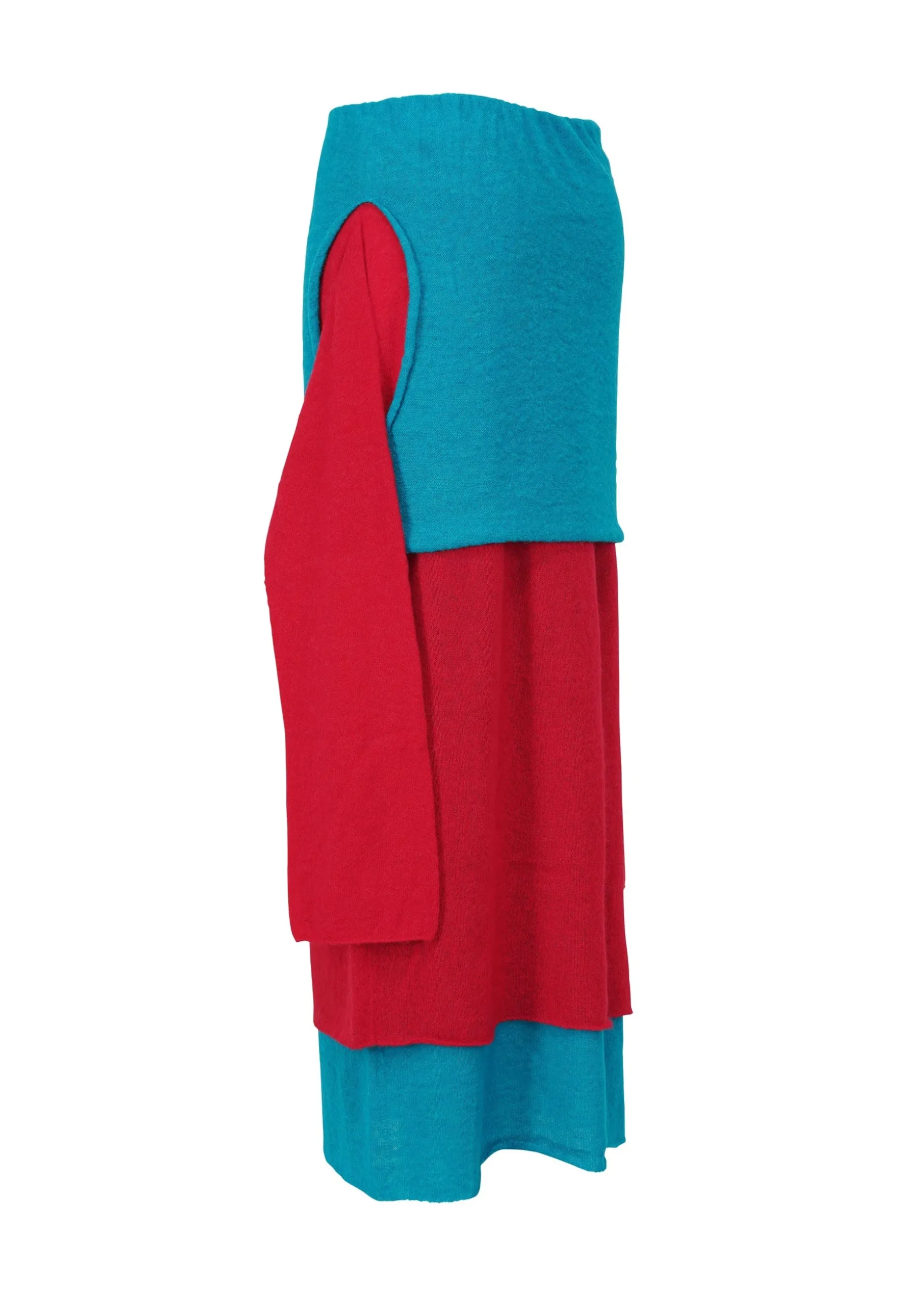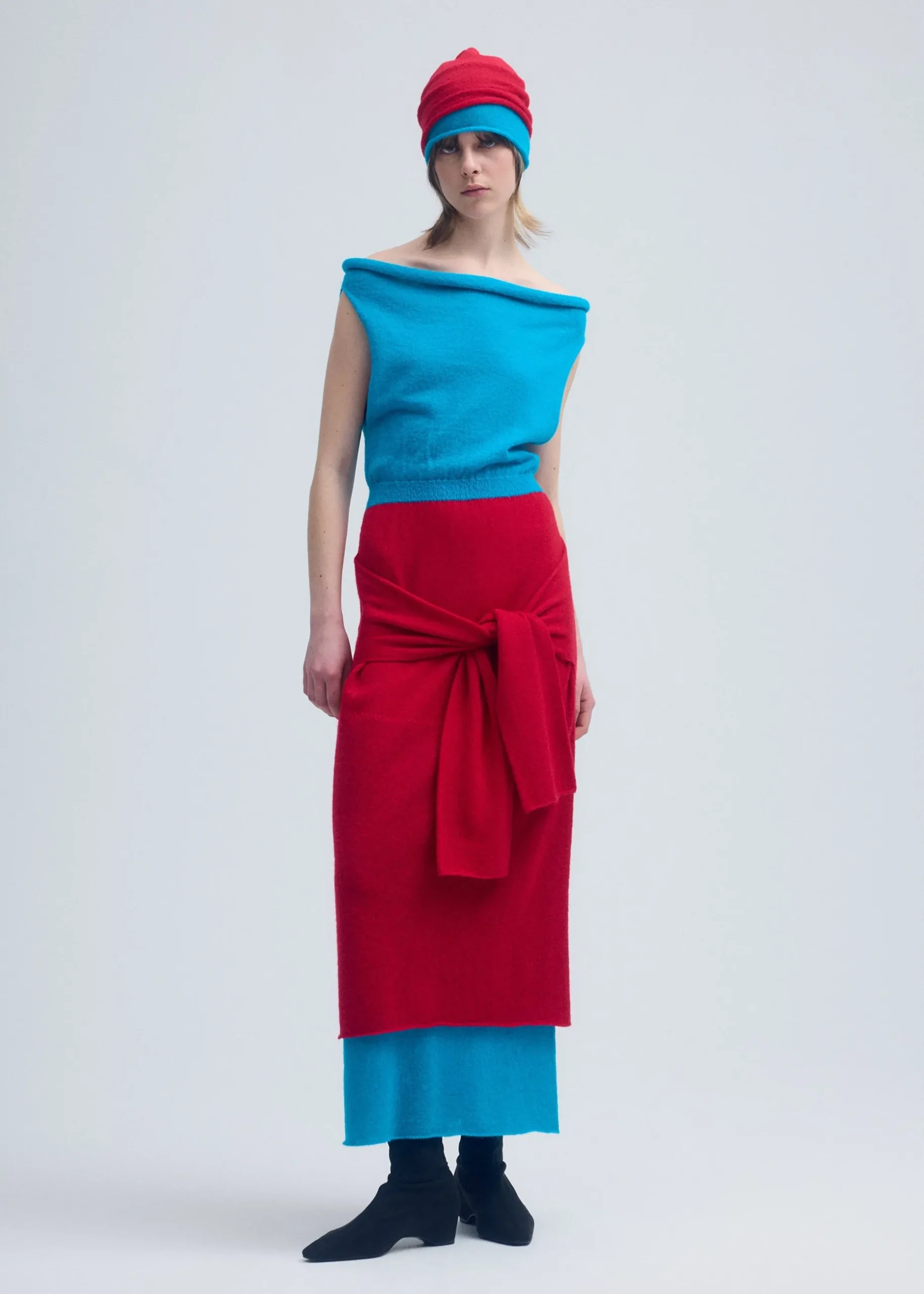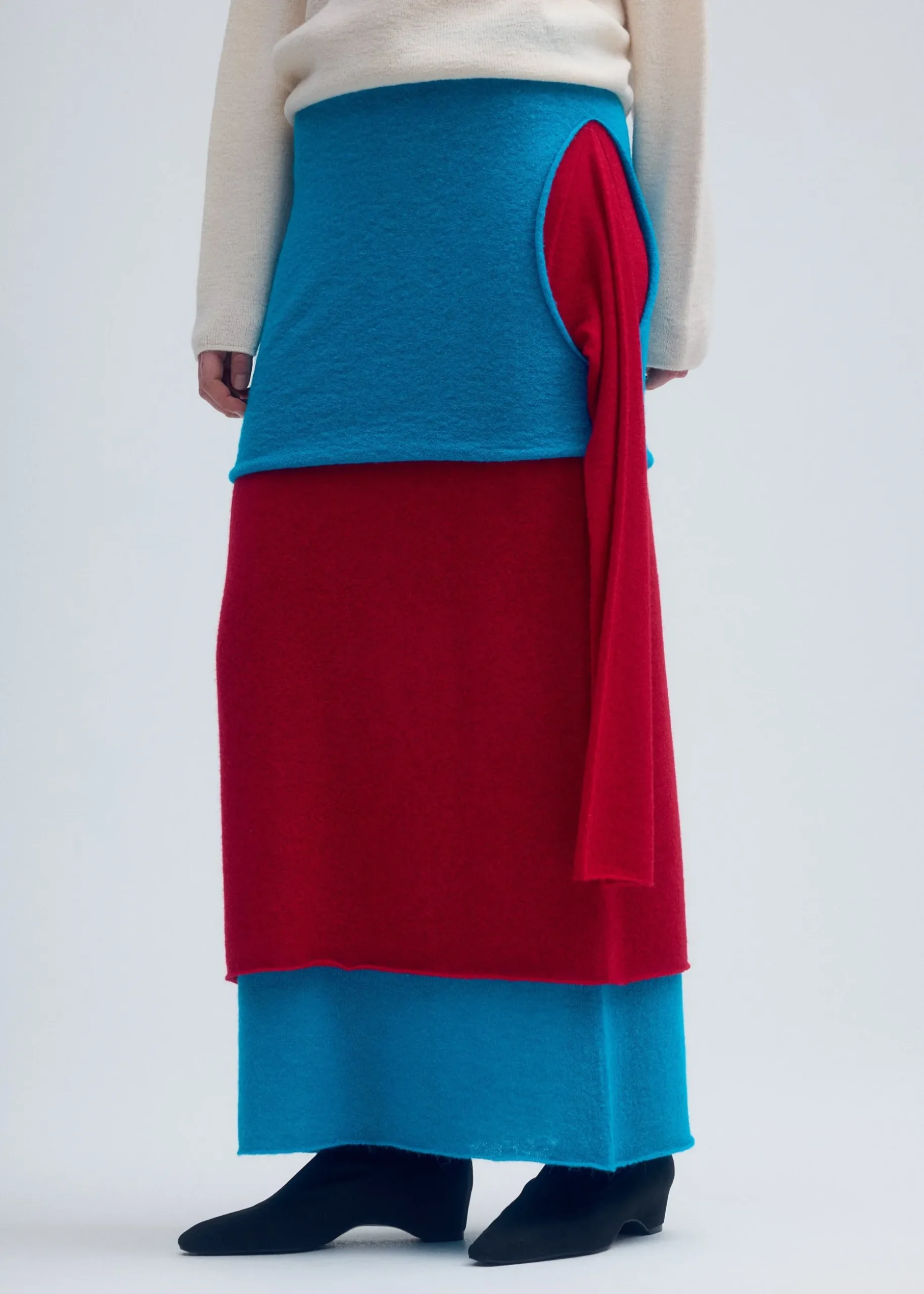 This non-sewn knit skirt is based on the concept of layering colors and features an eye-catching dual color scheme expressed through a double-layered knit design. The design has layers of different colors and lengths stacked vertically, allowing you to enjoy a layered style with a single piece of knit clothing. The warm, soft feel of the fabric and versatile styling options make this an appealing item.