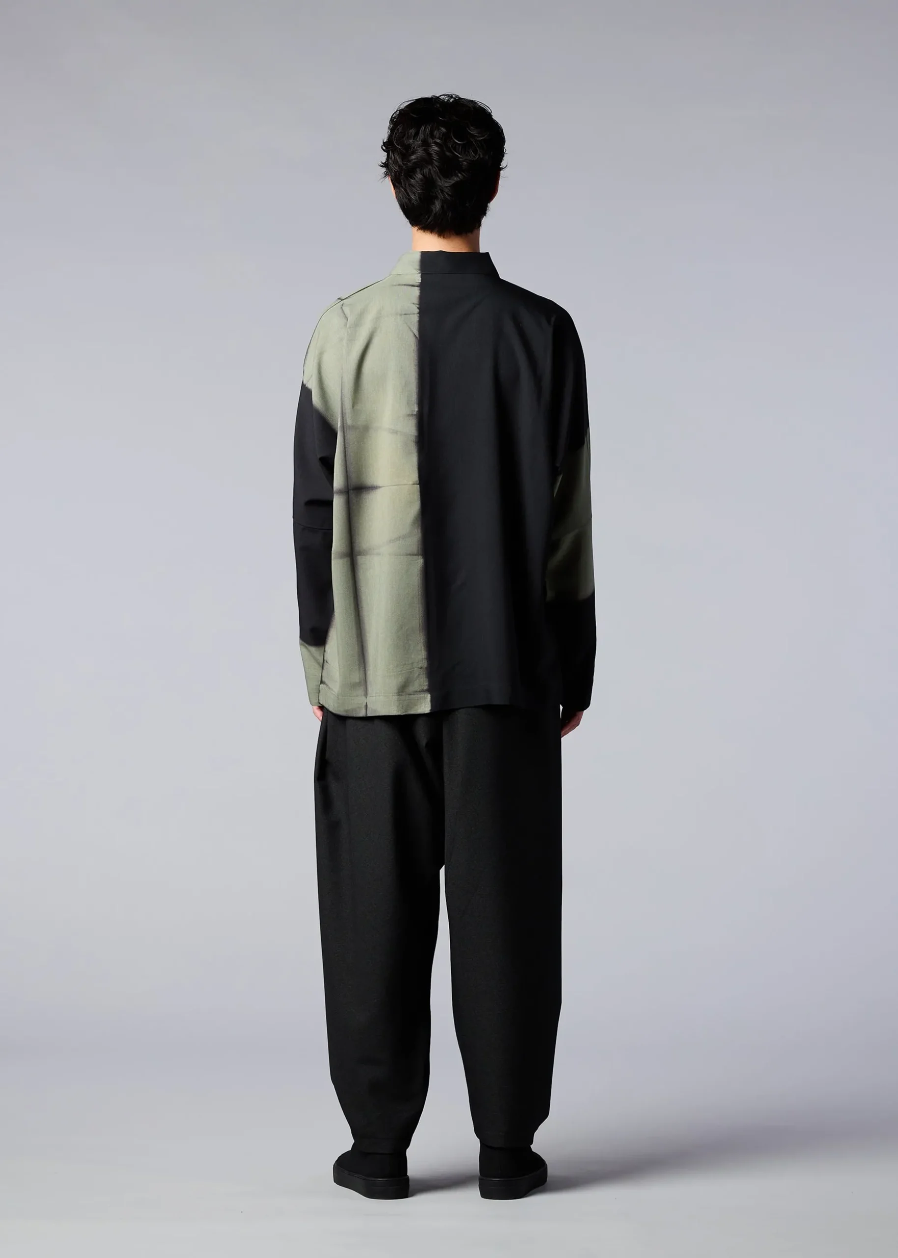 This long-sleeved, double-weave shirt has a soft feel and smooth texture. It is finished with an intricate yet powerful beautiful pattern using the Roketsu-zome dyeing technique, in which the item is dyed while separating the wax by hand. It is made with simple cuts for a linear silhouette that accentuates the pattern.