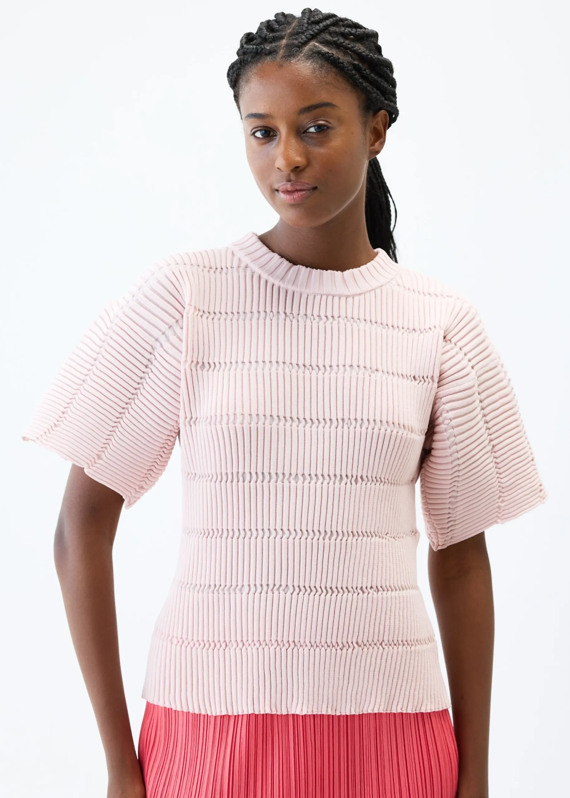 This round-neck, short-sleeved knit features regular pleats with its knitting structure. It is made with recycled polyester in pursuit of fluffy softness. It is characterized by the folded look of the front that flutters when worn.