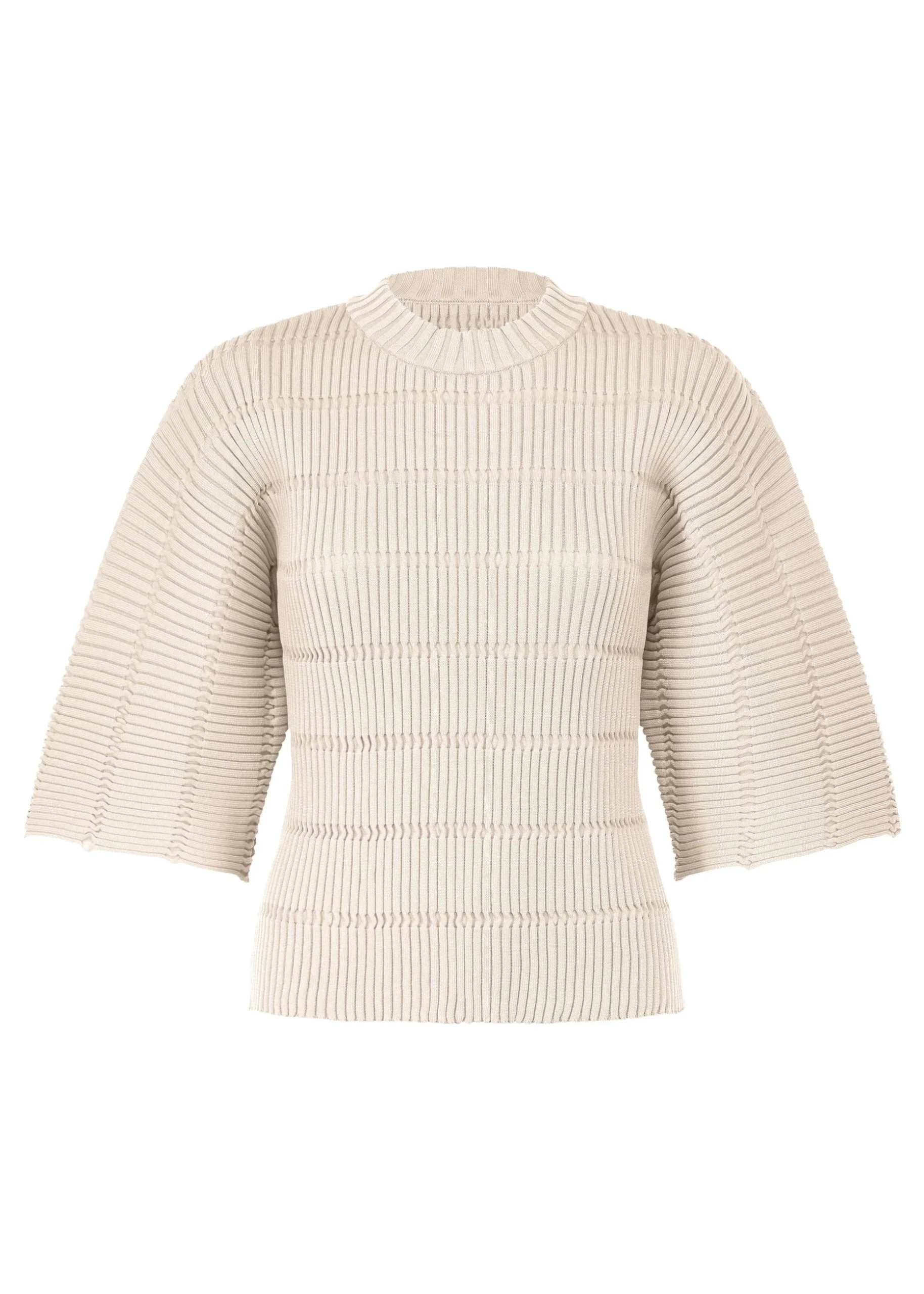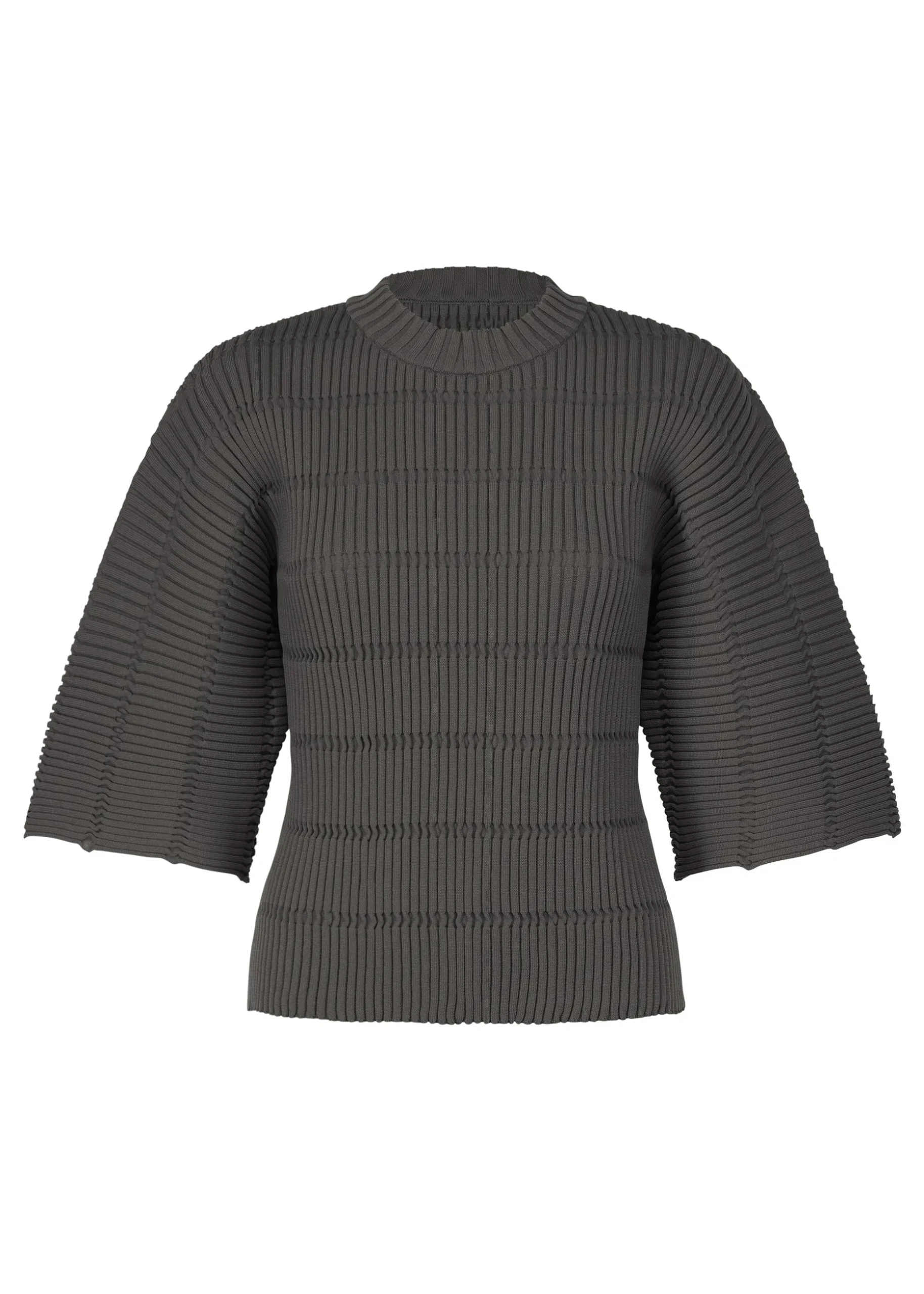 This mock-neck knit expresses regular pleats with its knitting structure. It is made with recycled polyester in pursuit of fluffy softness. It is characterized by the folded look of the front that flutters when worn.