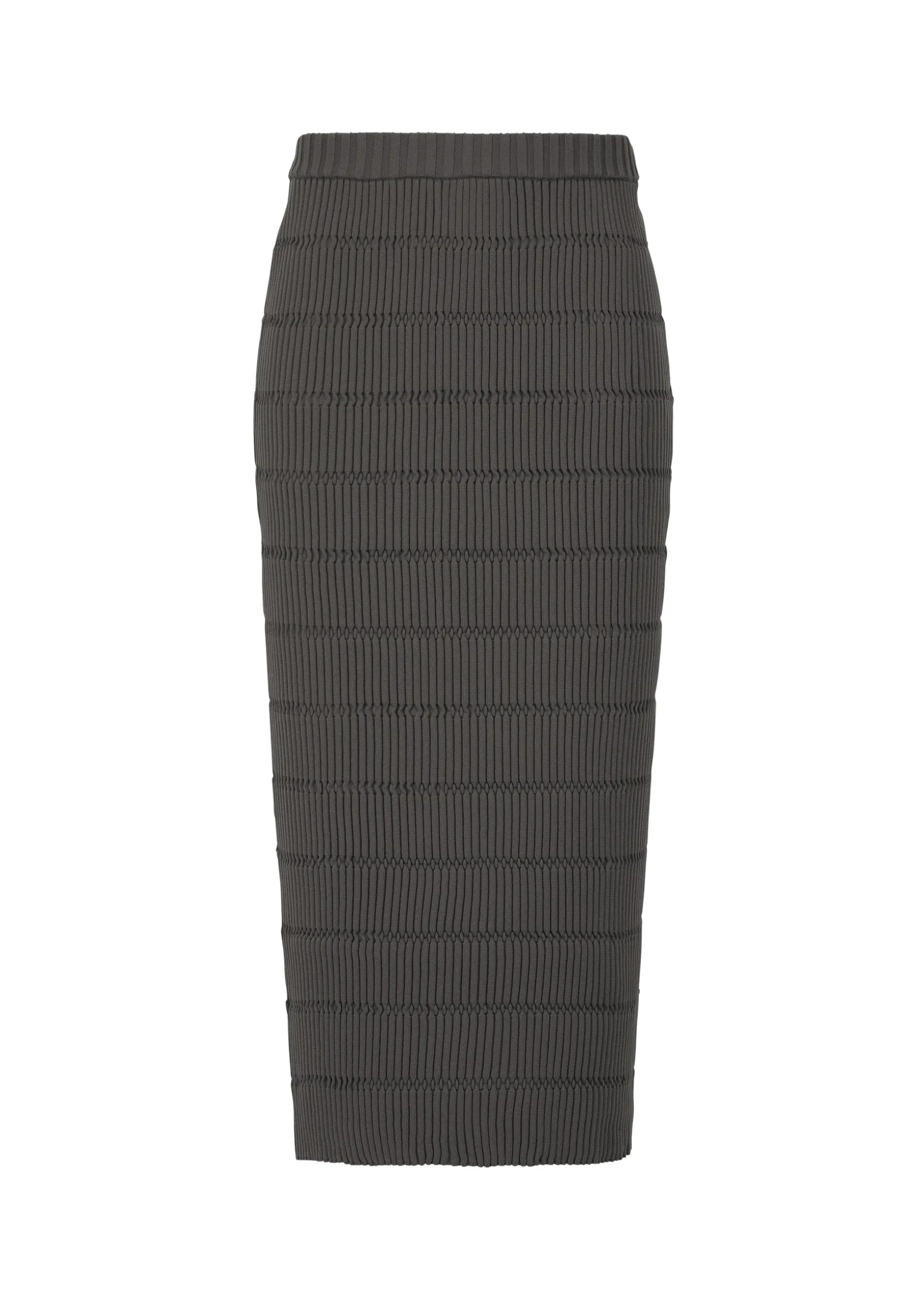 This knit skirt expresses regular pleats with its knitting structure. It is made with recycled polyester in pursuit of fluffy softness. It is characterized by the folded look of the front that flutters when worn.
