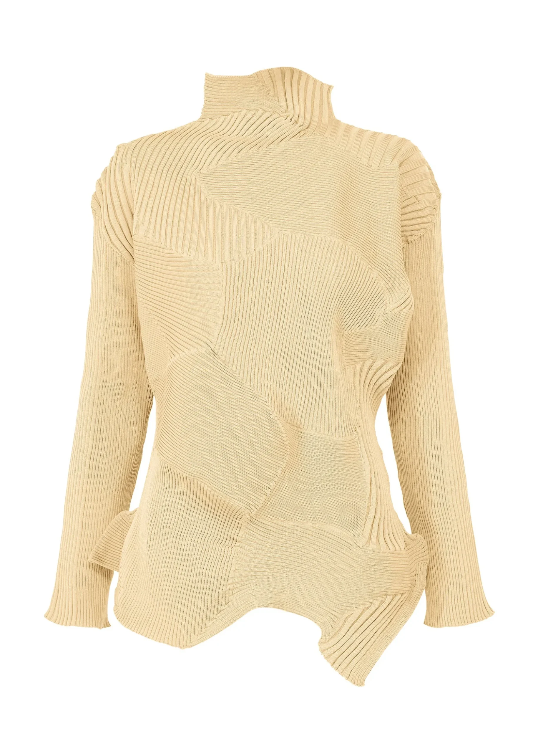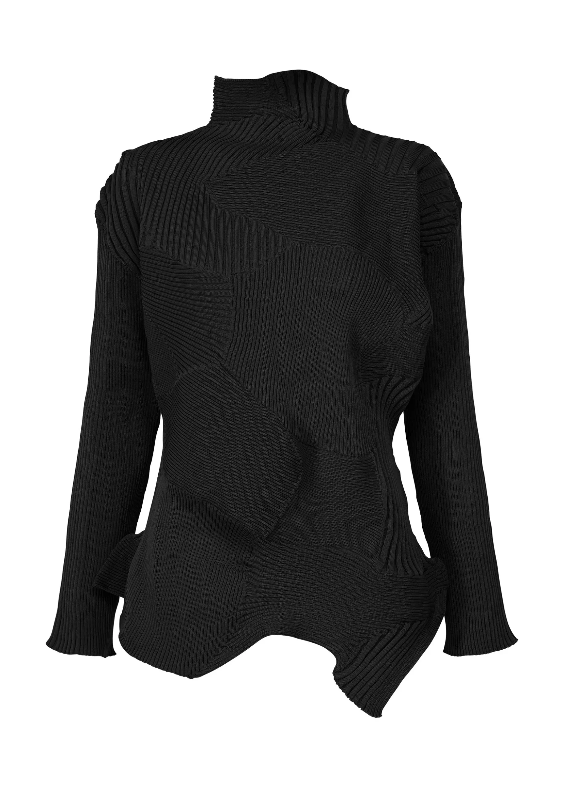 This knit long-sleeved top with an uneven feel is knitted by combining different textures as if kneading clay together. It is characterized by the curves and depth of form created by combining different knitting structures in a linear pattern.