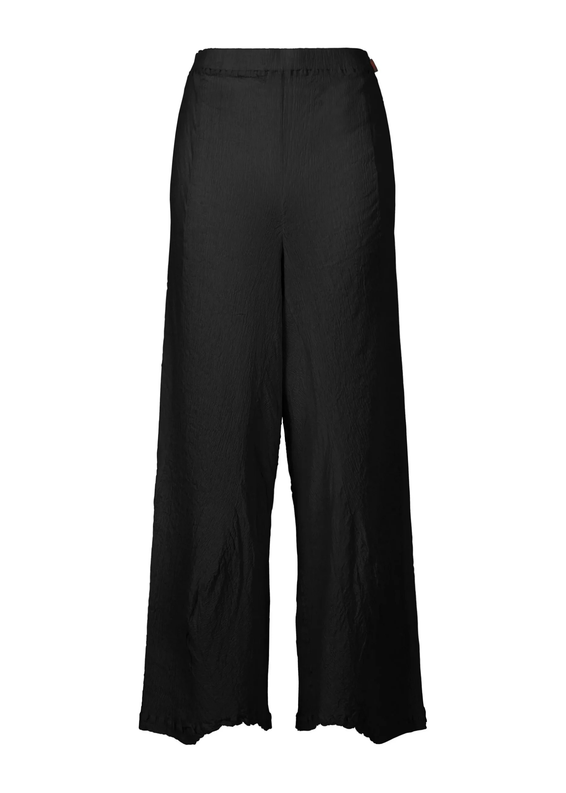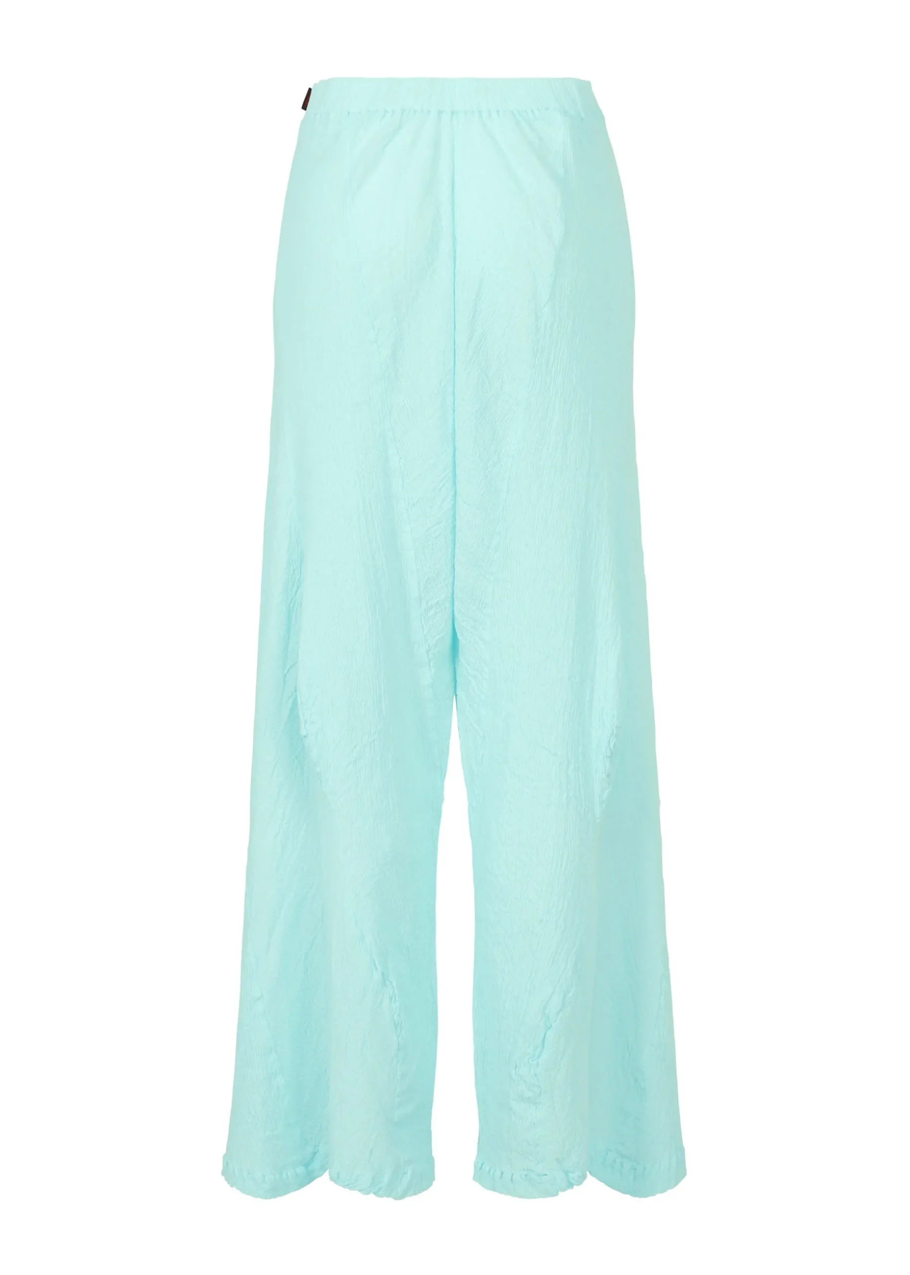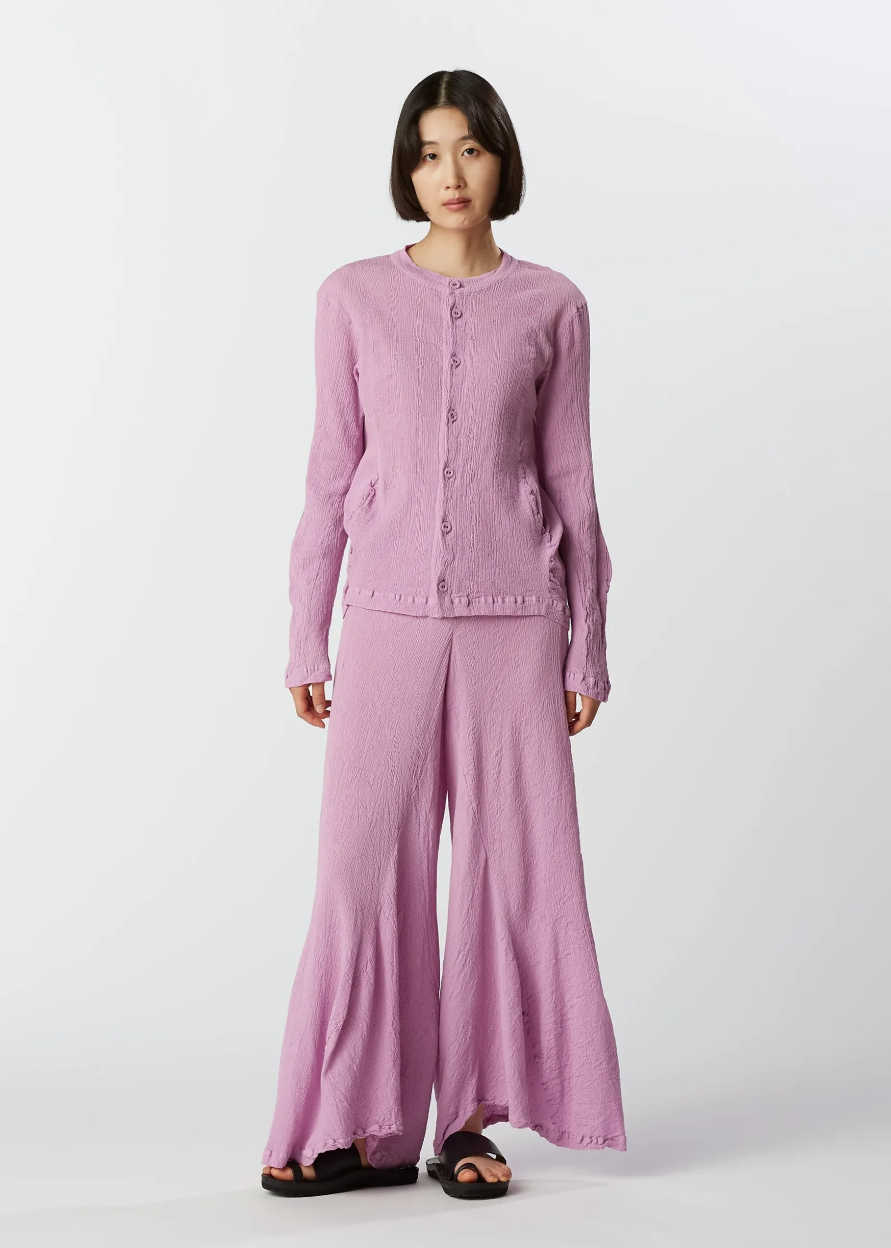 KYO CHIJIMI pants are characterized by their light and supple feel. We use ultra-fine cotton threads that are twisted even more than normal, highly twisted threads, and are woven using looms unique to the production area. By joining multiple parts in a curved shape, we created a silhouette with wavy movement.