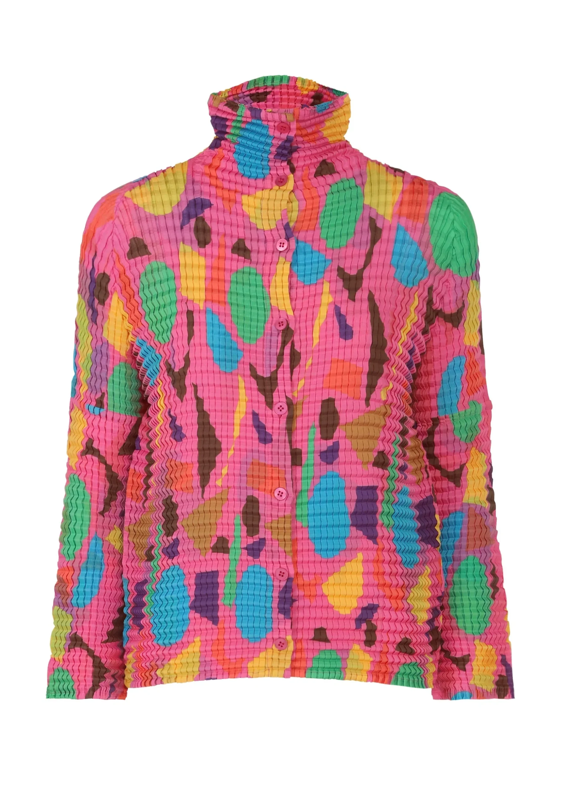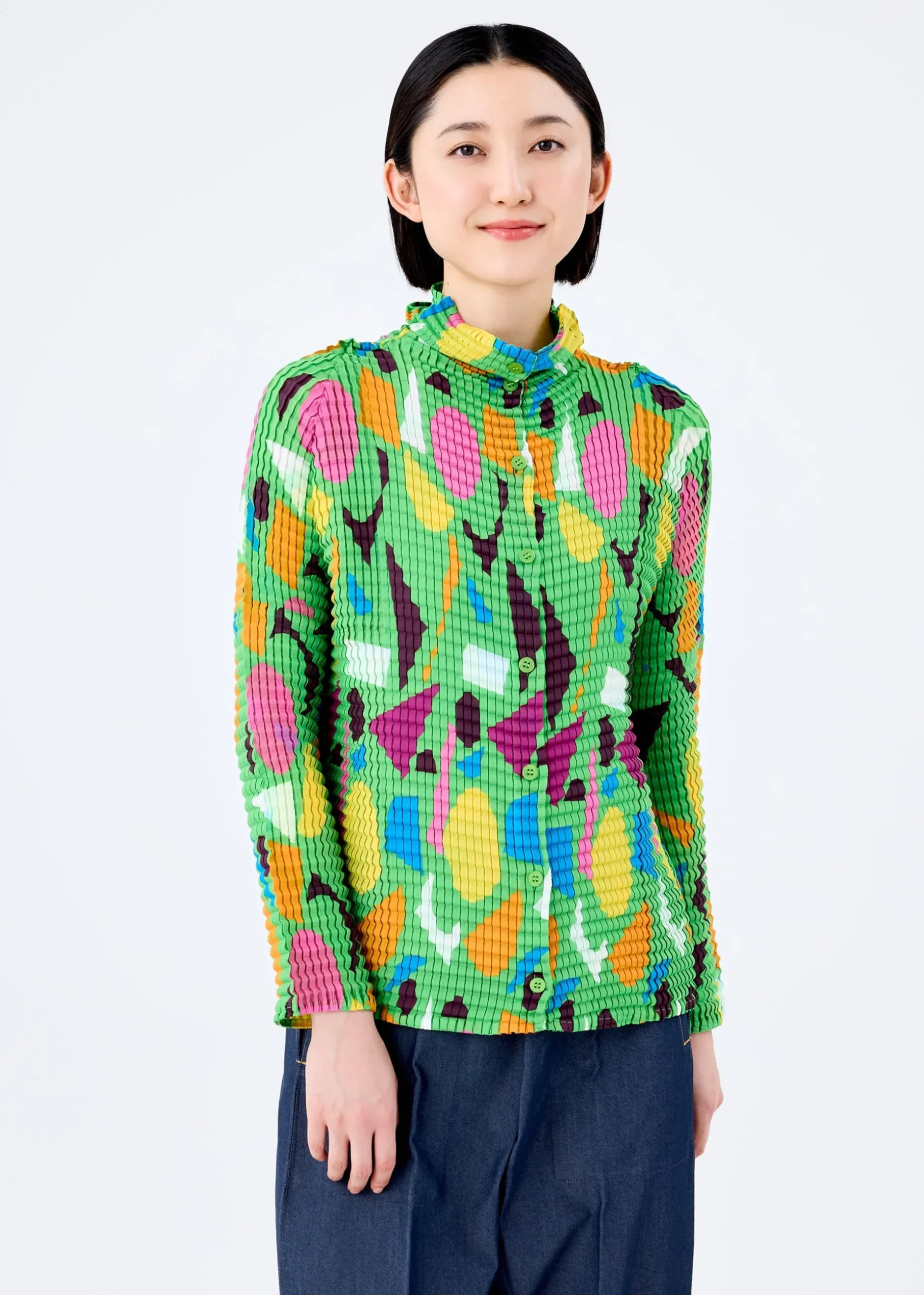 This long-sleeved cardigan has a relaxed silhouette with vertical and horizontal pleats. The playful pattern, which looks like colorful paper that has been cut with scissors and scattered, becomes visible when worn.