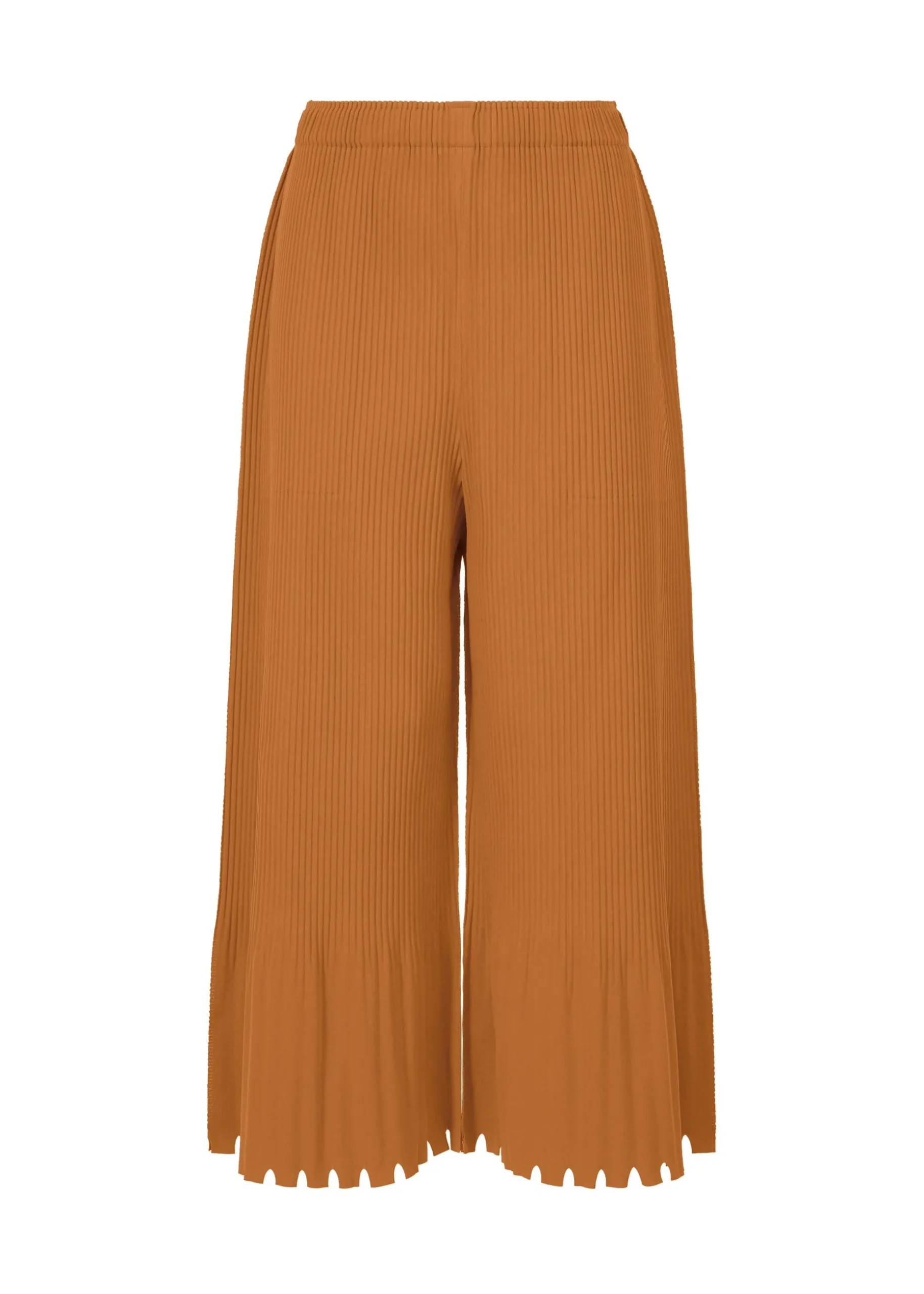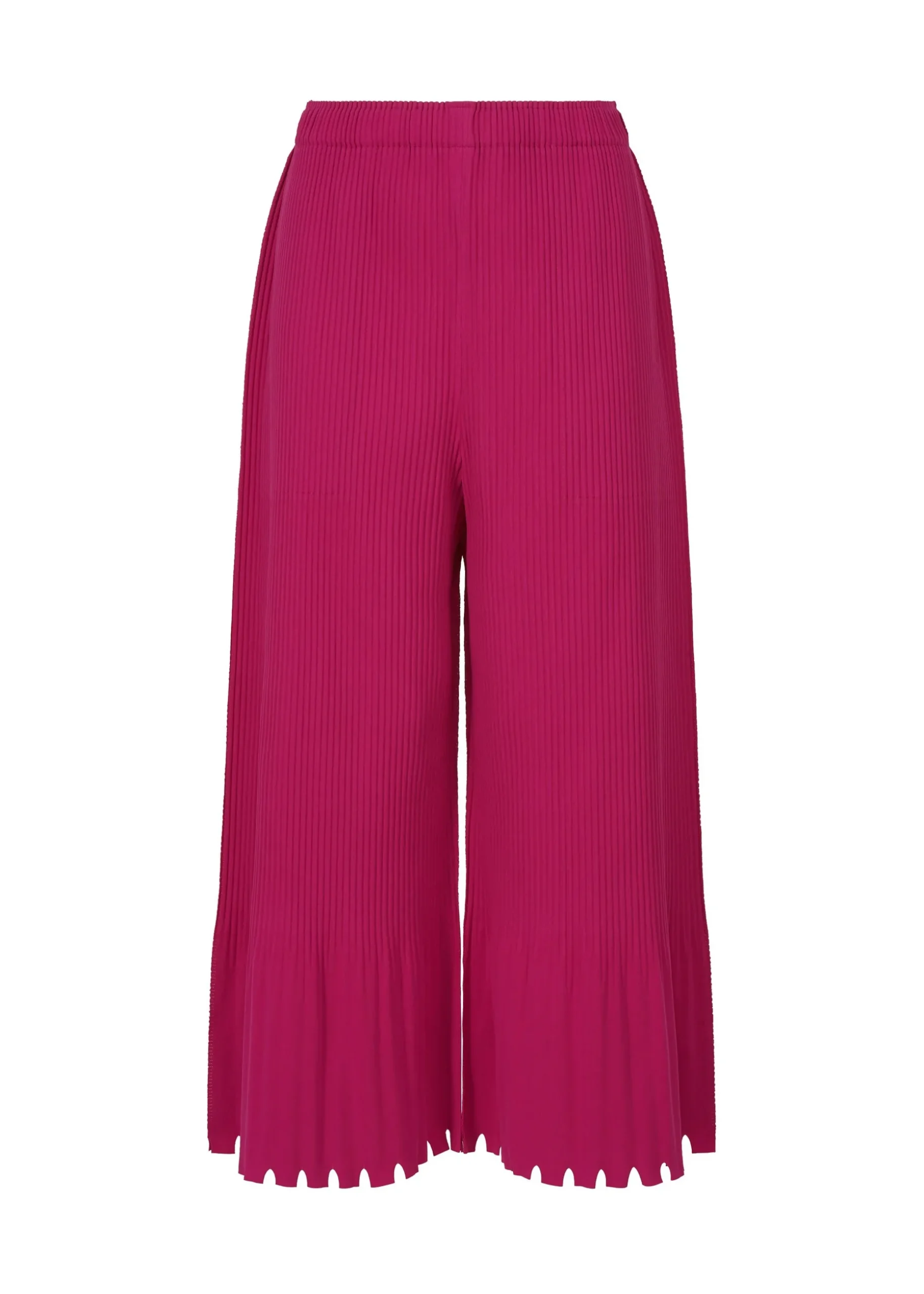 These FINE KNIT PLEATS wide pants are characterized by their lightweight, soft feel and feature pleats applied to knit material made with stretchy, thin, soft yarn. The hems feature a Keshi pleat finish, providing an airy, soft look. There are pockets on both sides.