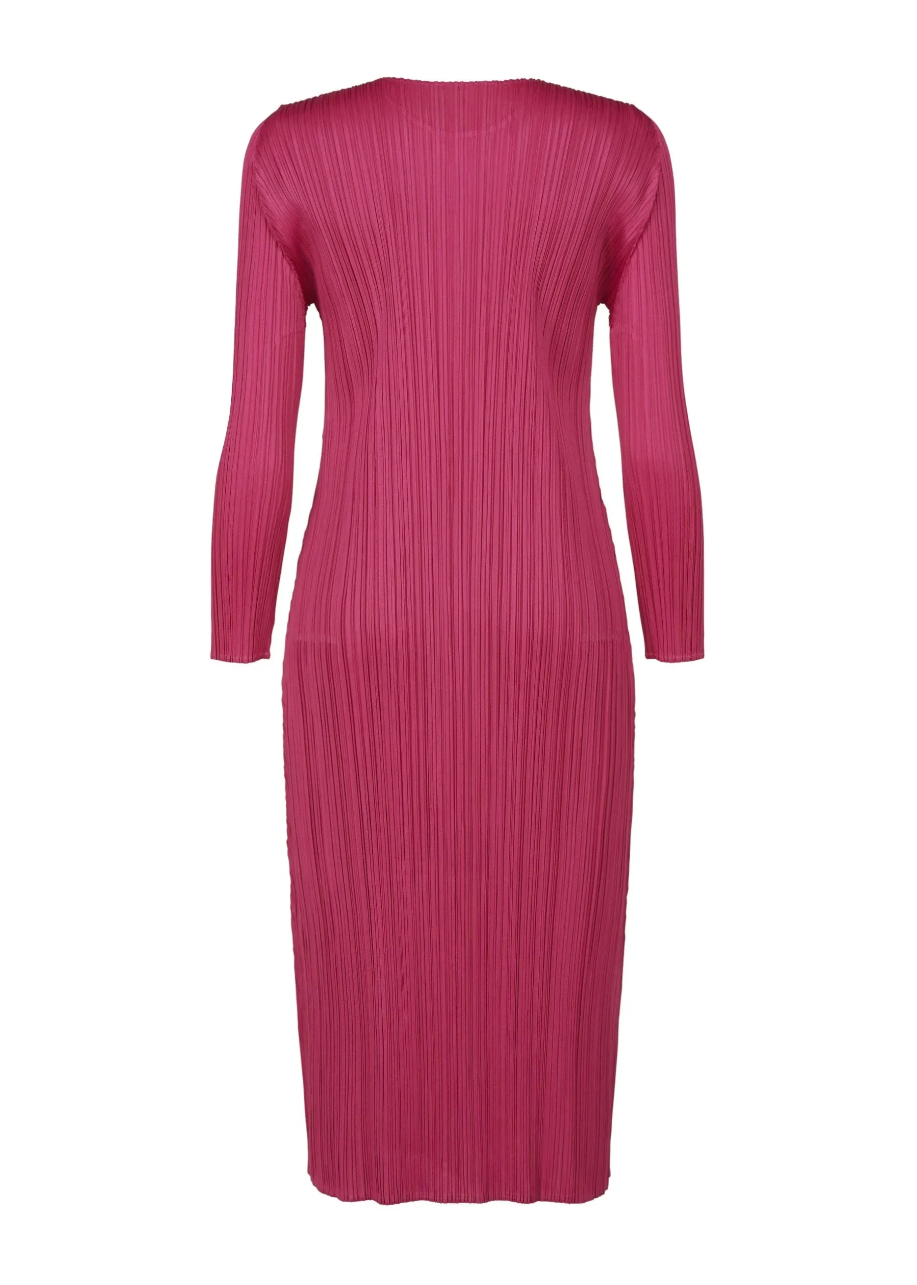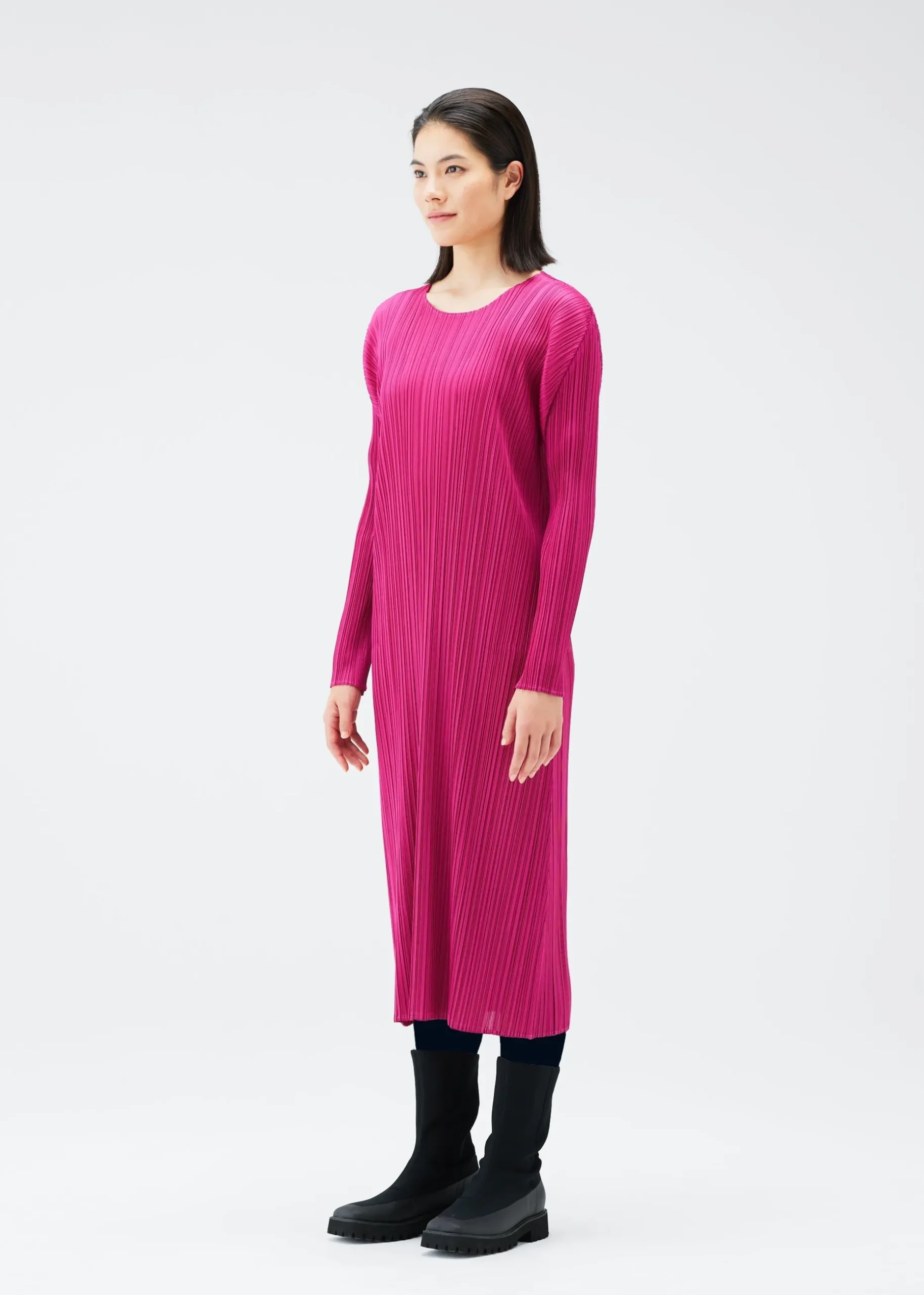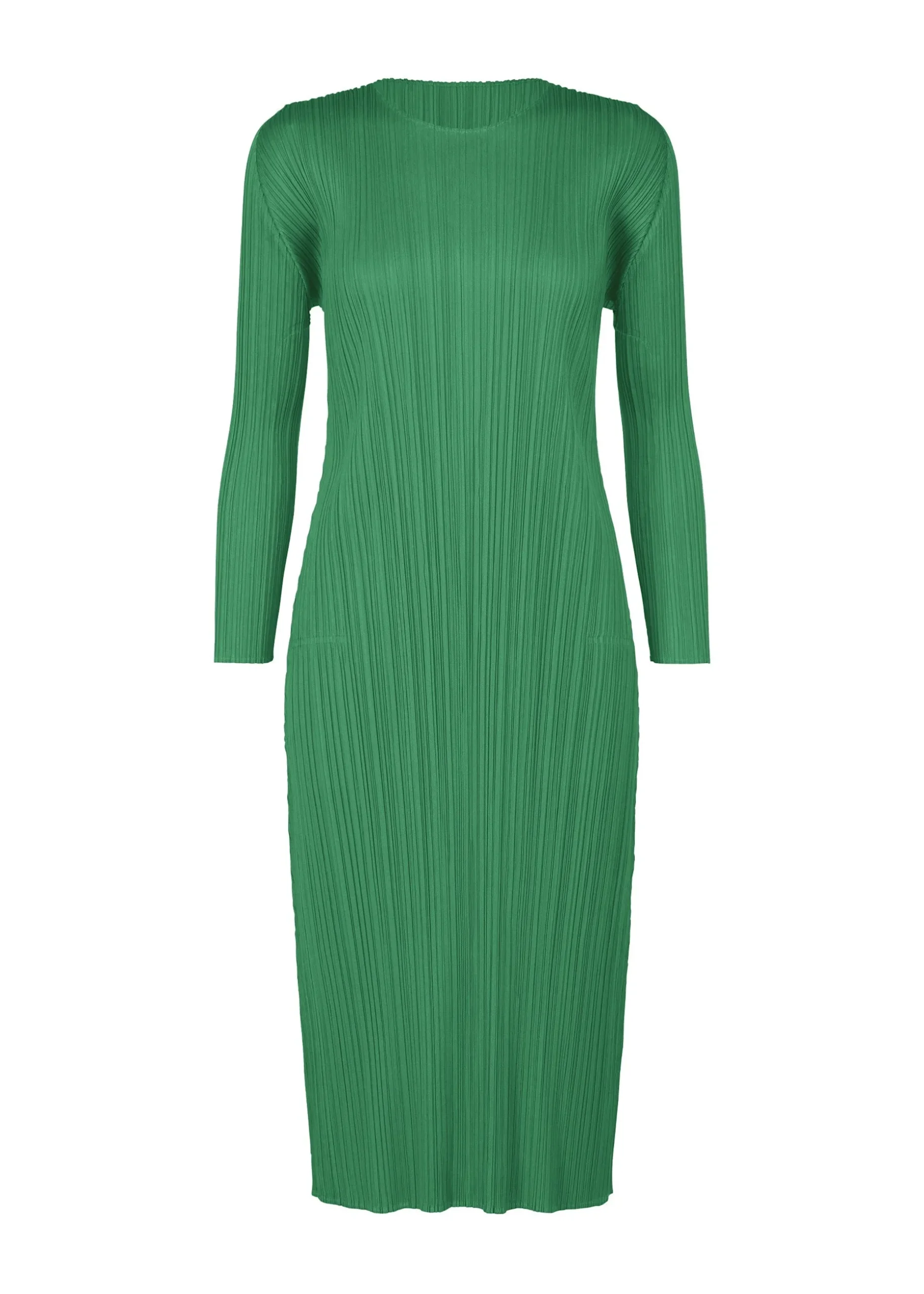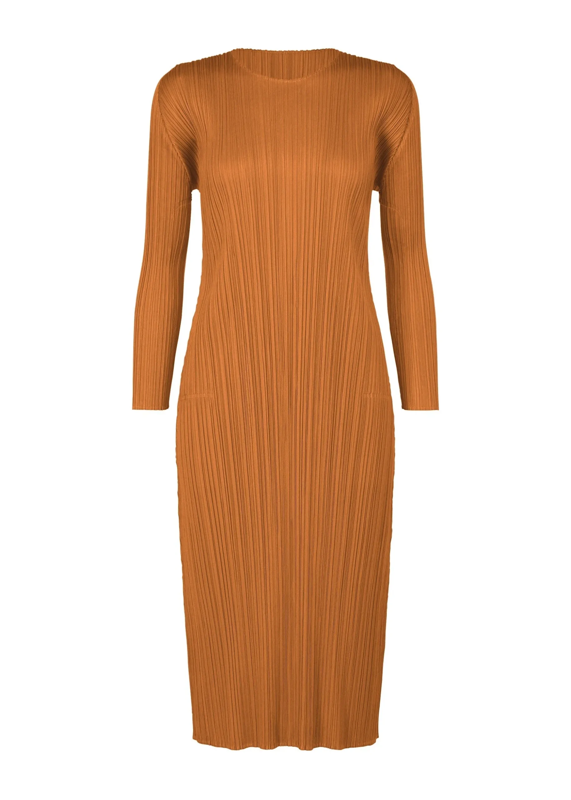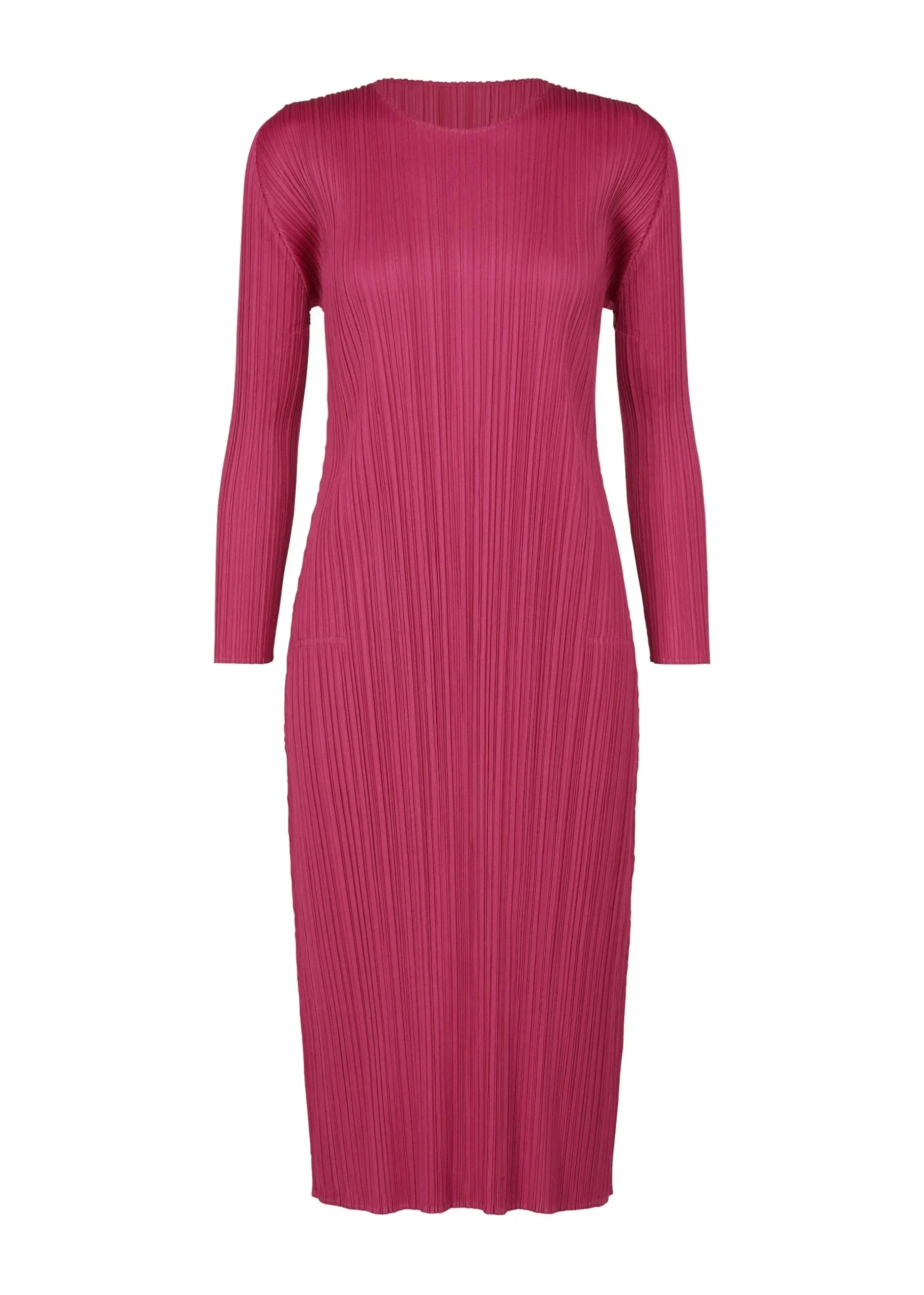 This pleated long sleeve dress has a relaxed fit, round neck, and two side pockets.