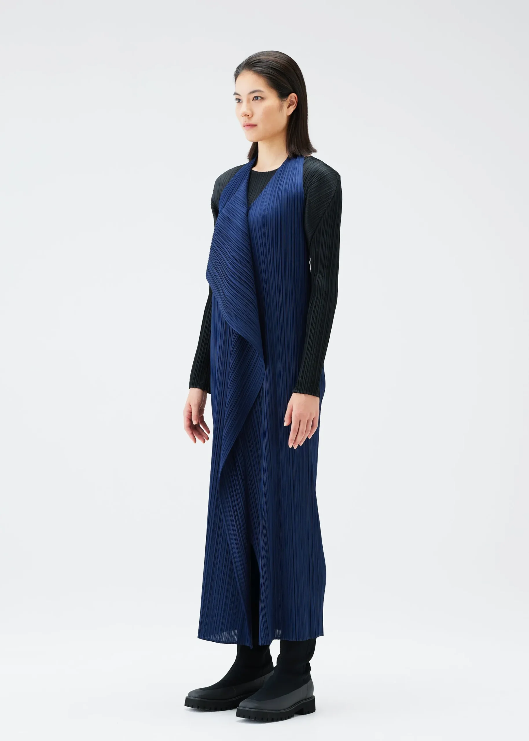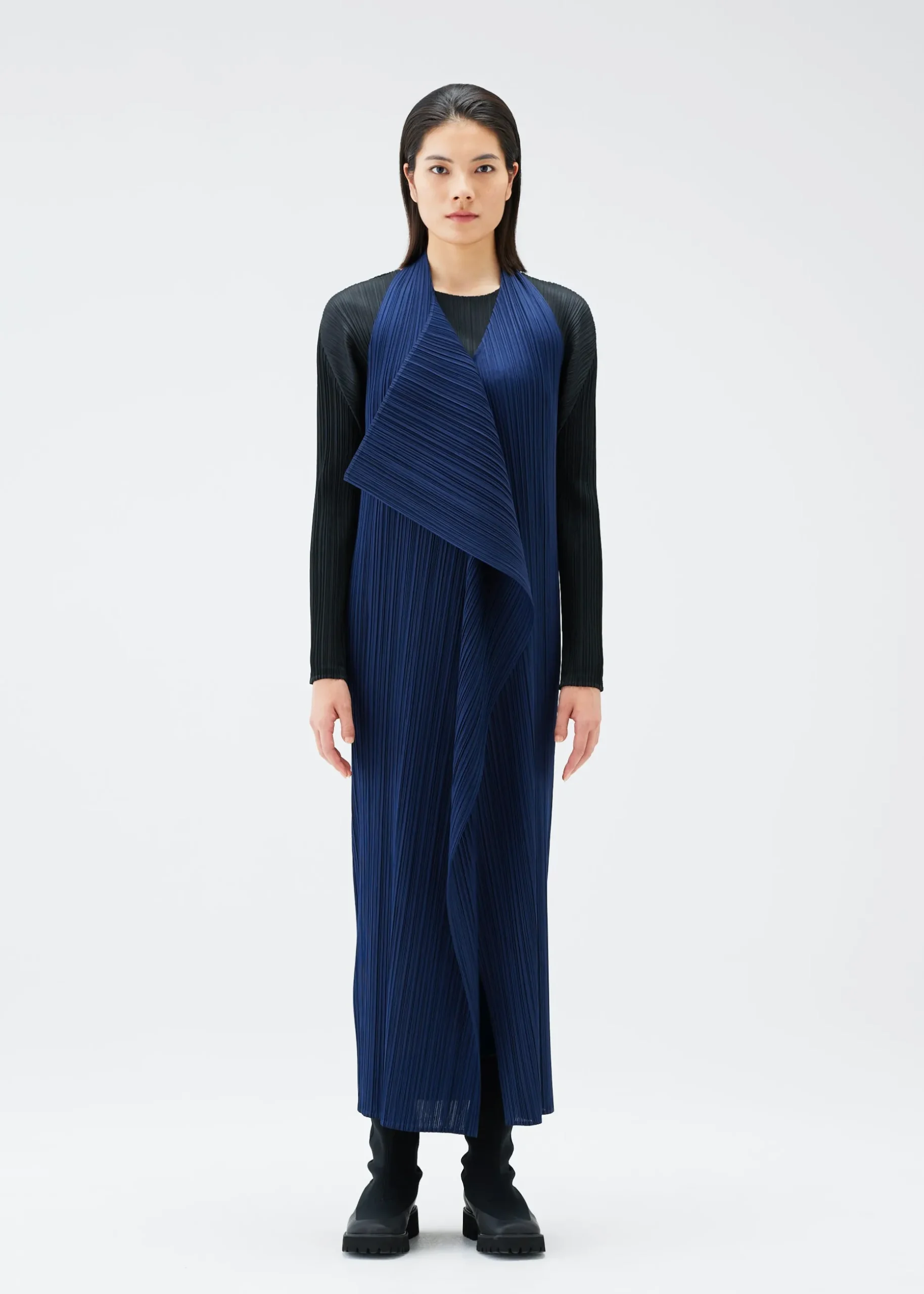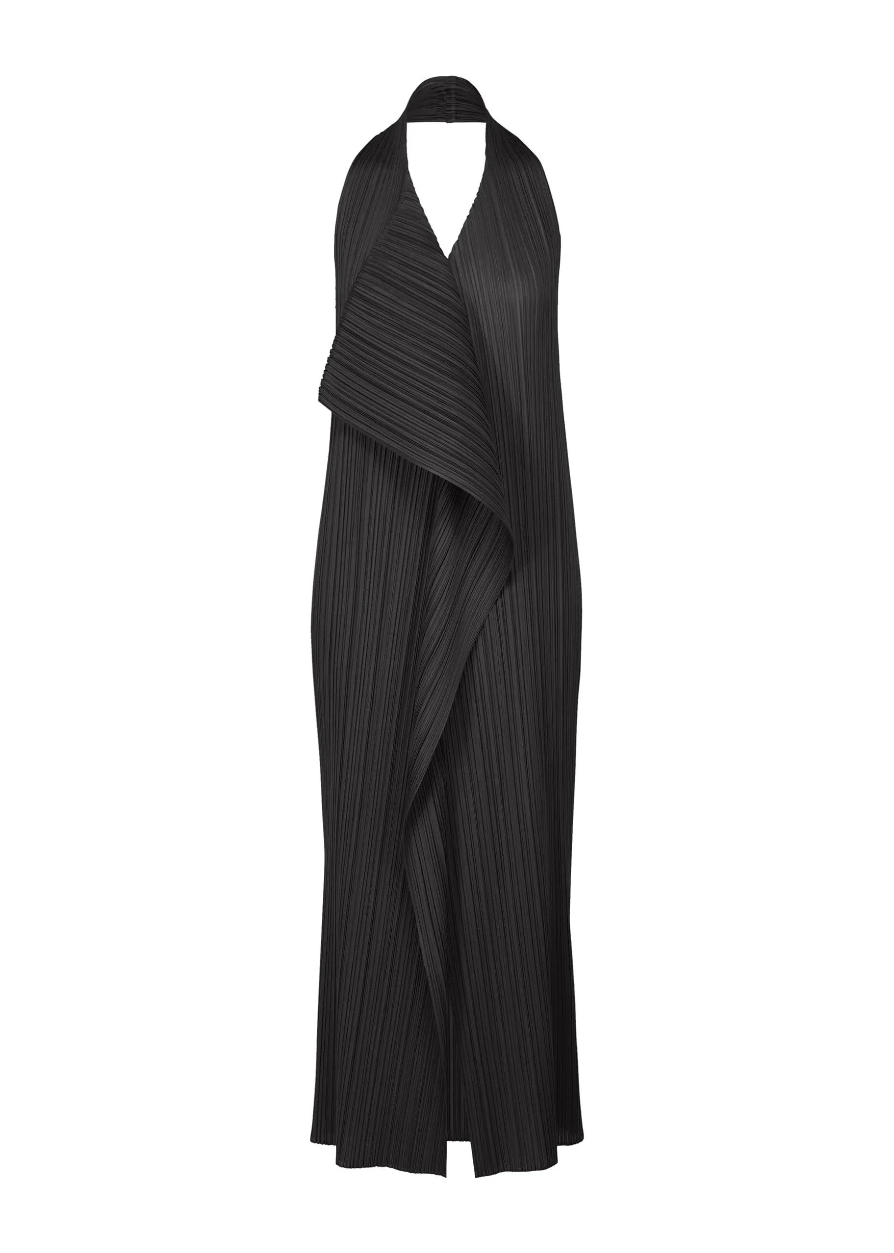 This pleated dress has a halter neck with a folded fabric detail and center slit.