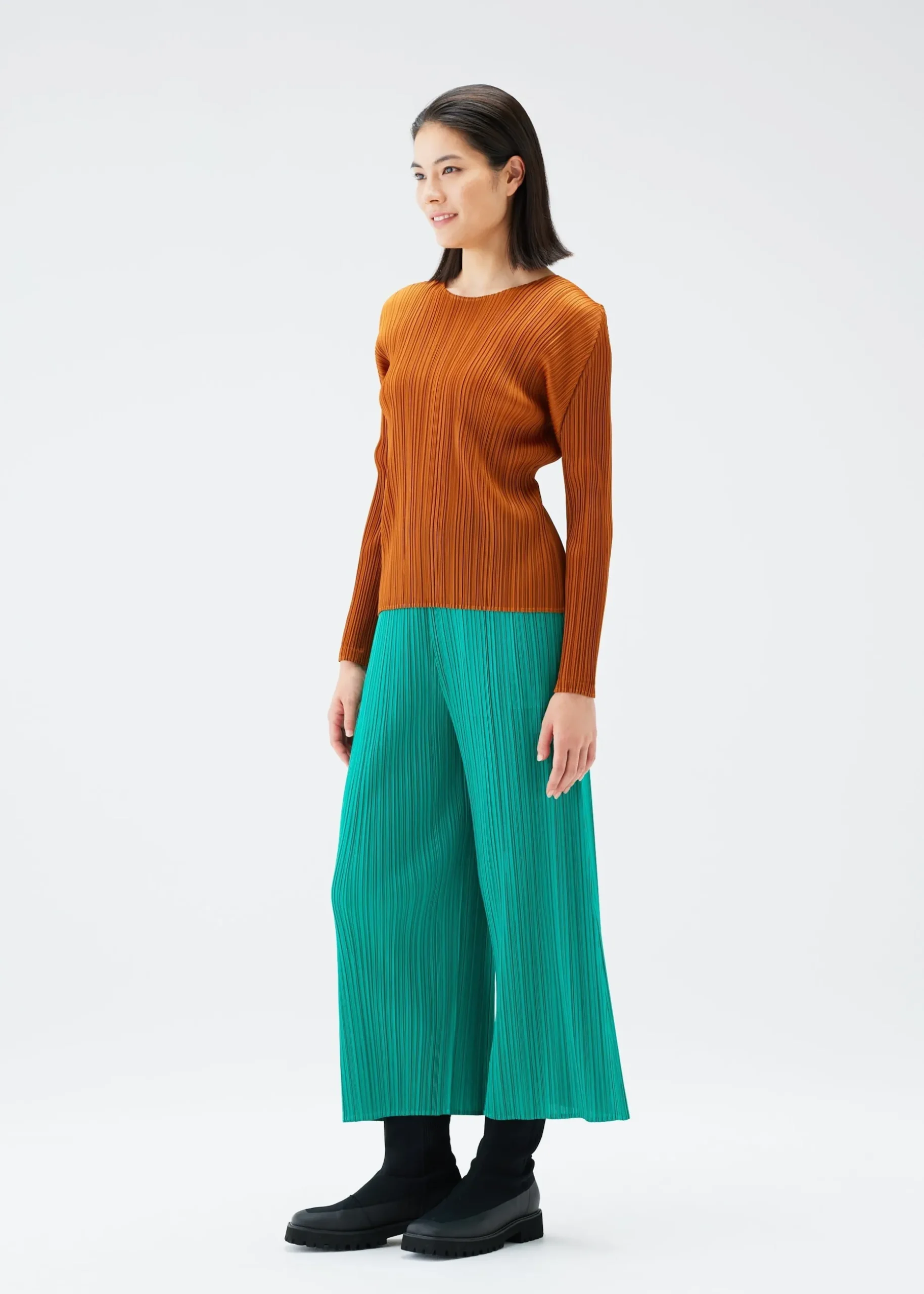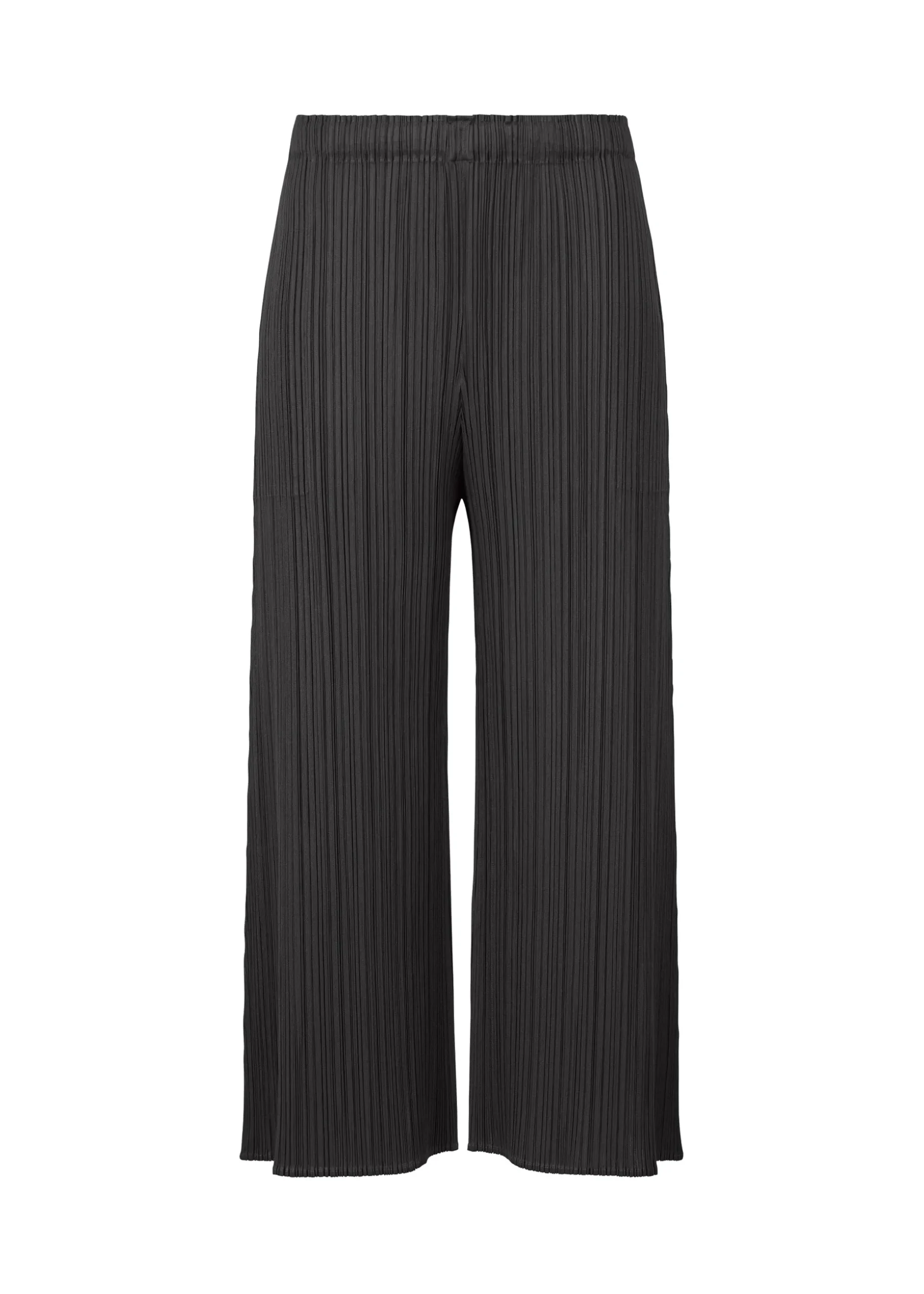 These pleated pants have a wide leg, elastic waist, and two side pockets.