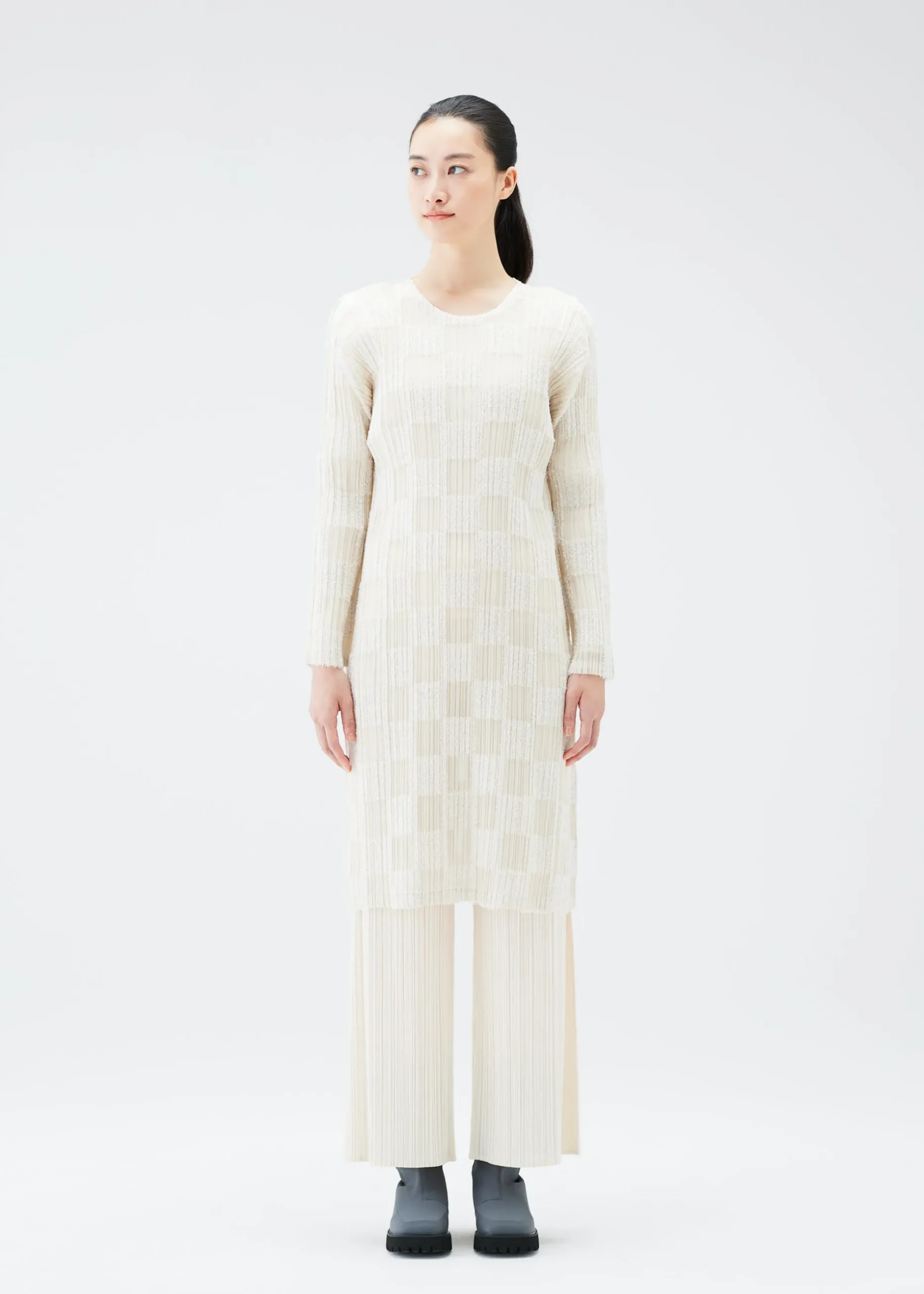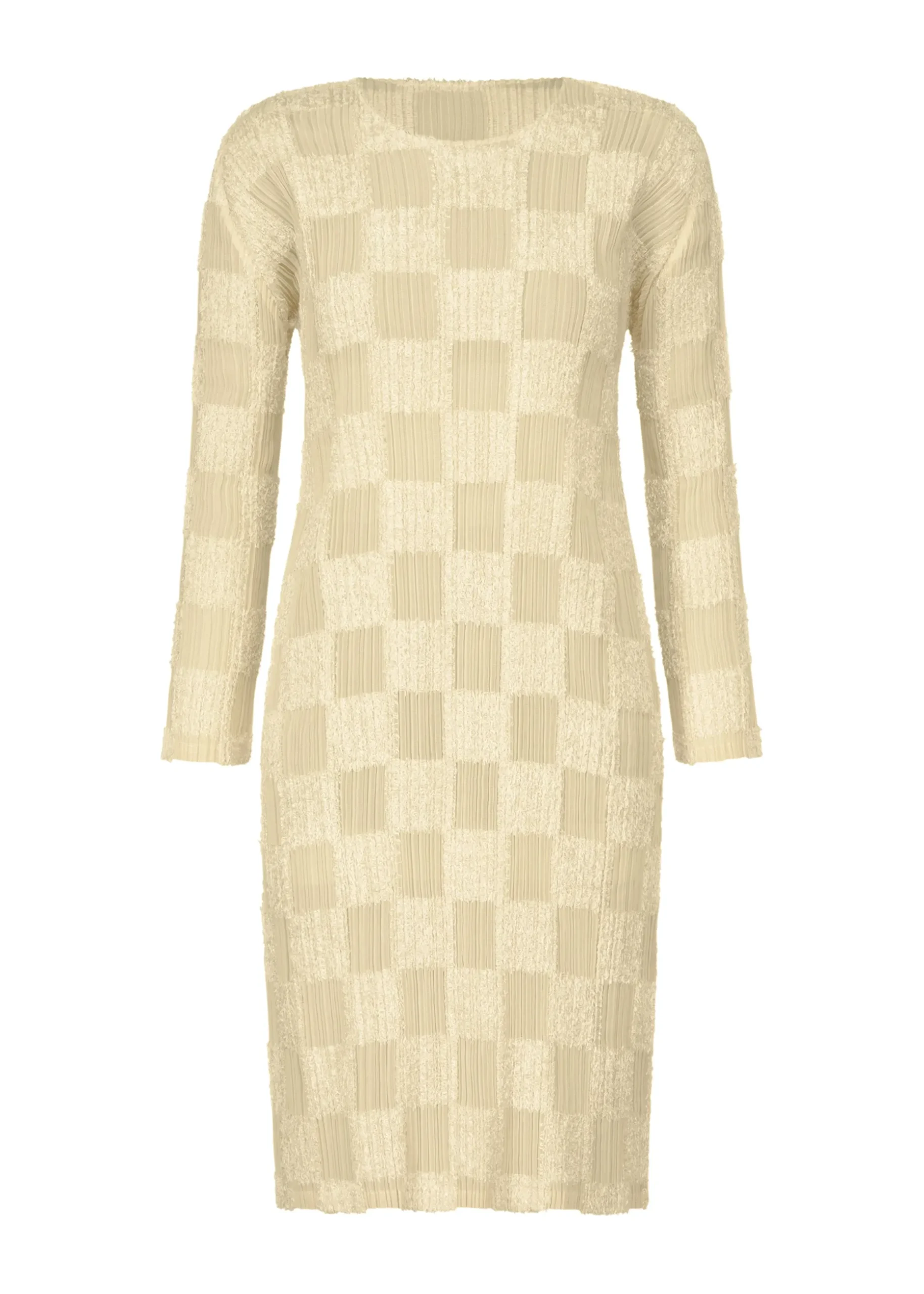 This round-neck, long-sleeved dress is characterized by its plaid pattern with different materials. It is sheer and can be layered with a variety of items.