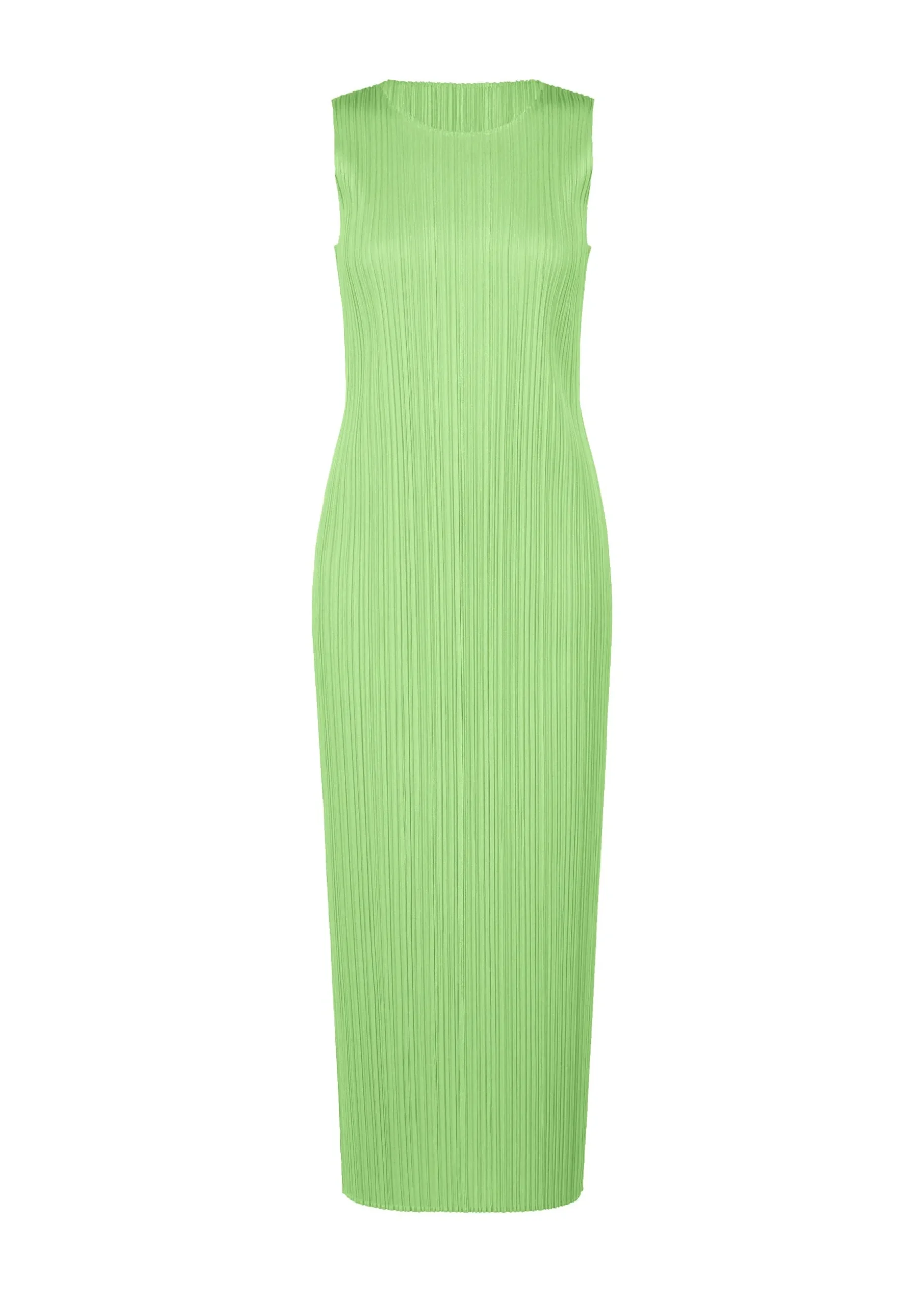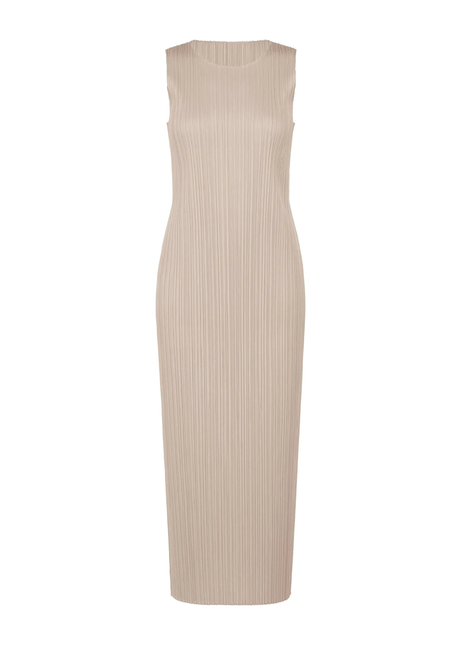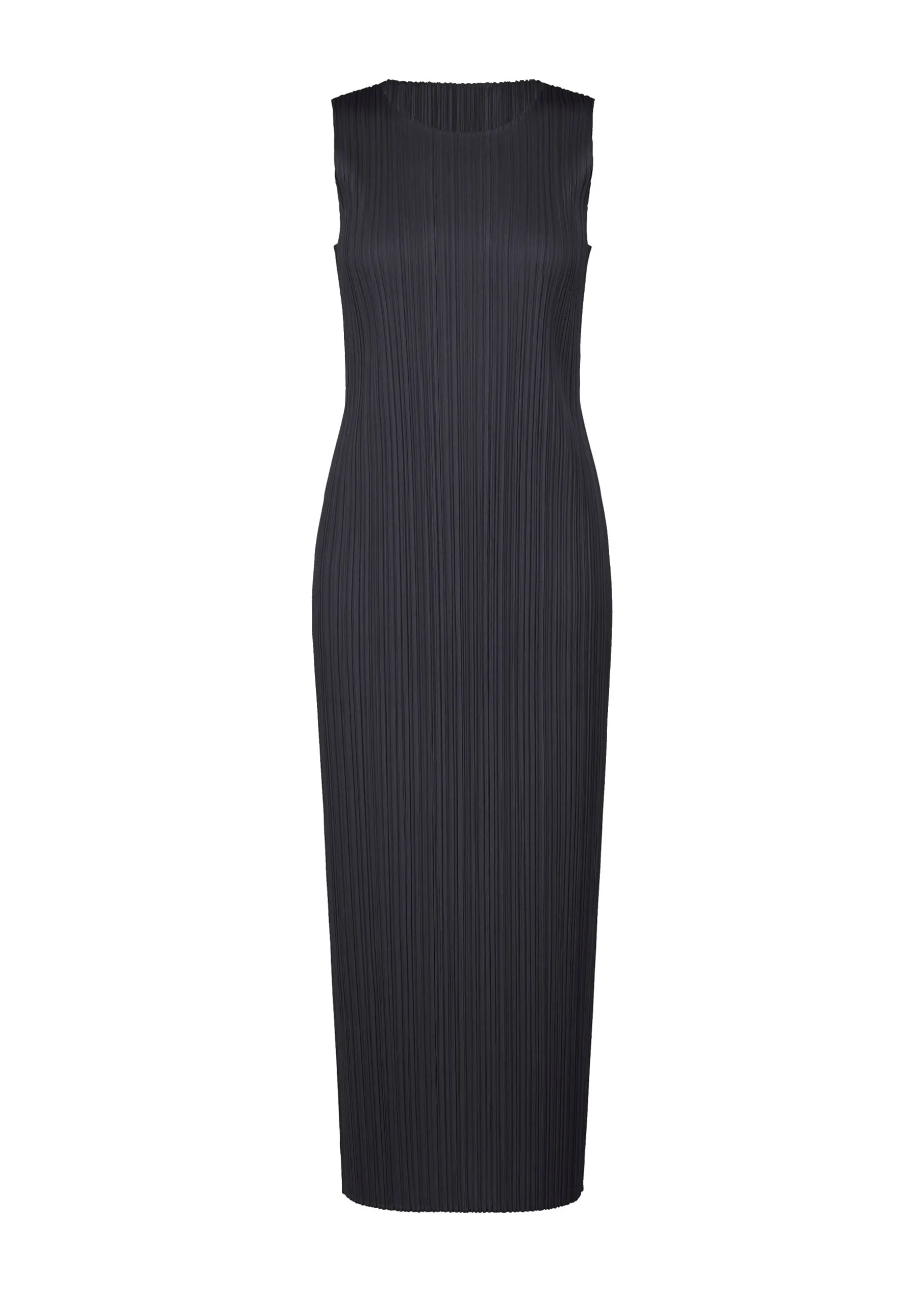 This sleeveless pleated dress has a slim shape, scoop neck, and can be reversed for a straight neck and scoop back.