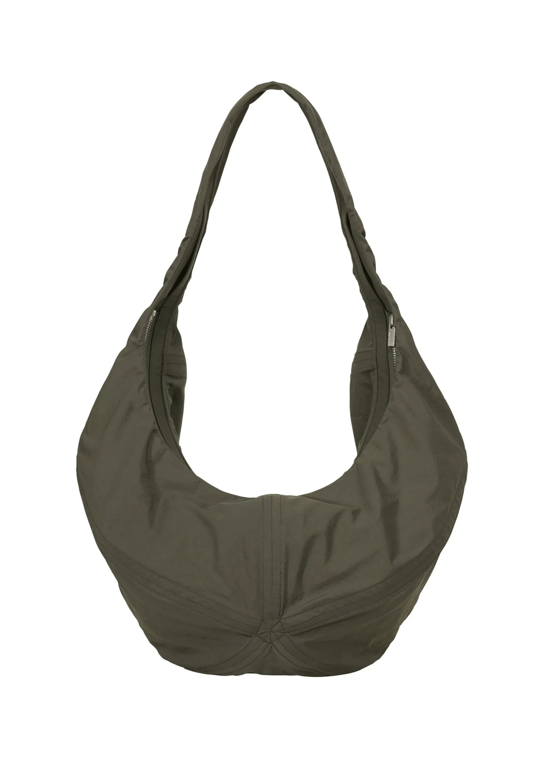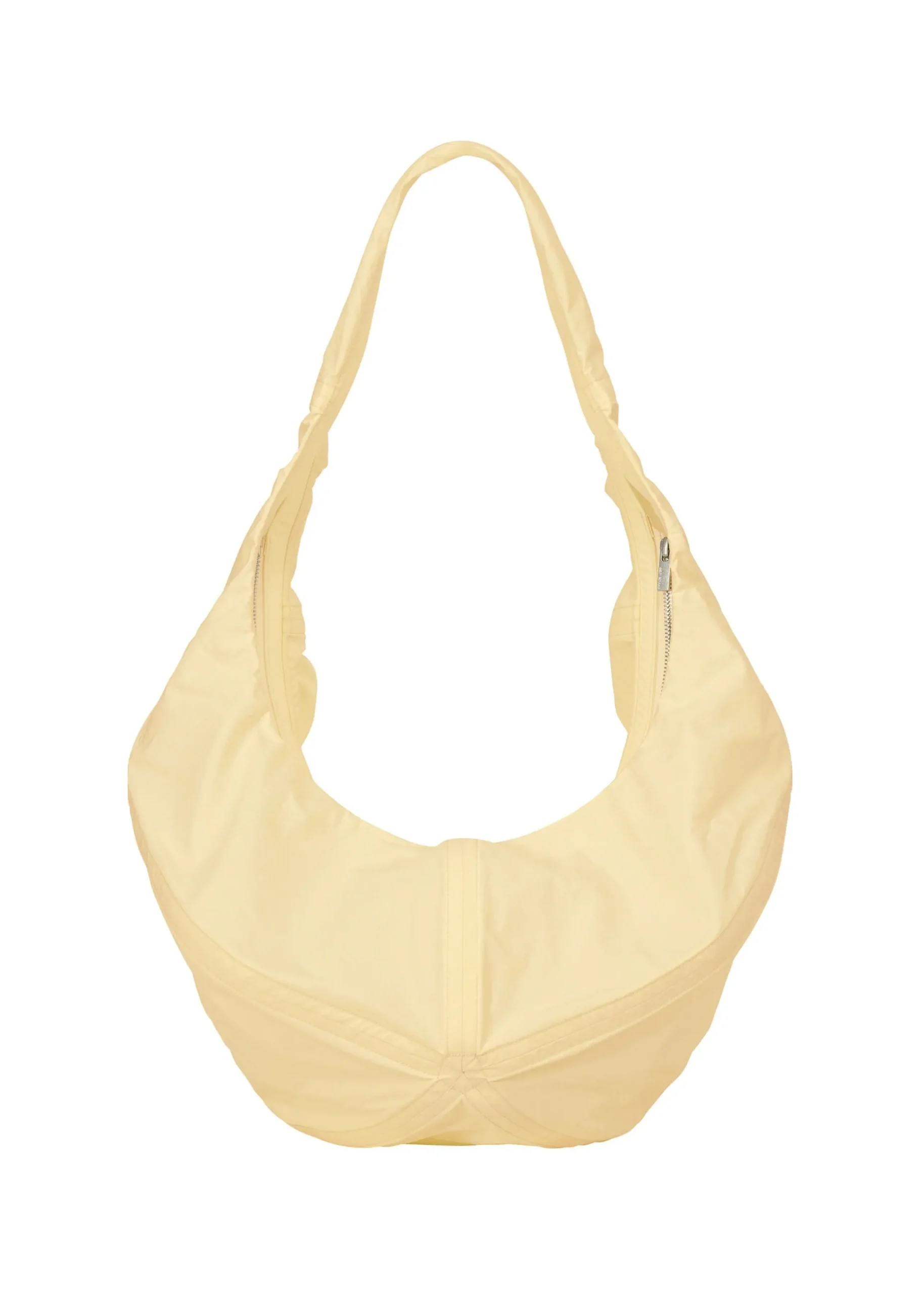 A bag inspired by paper balloons. A special compression process is applied to recycled nylon fabric to create a texture similar to the glassine paper used in paper balloons. The thin, strong fabric is reinforced with an artificial leather core to create a light balloon-like silhouette.