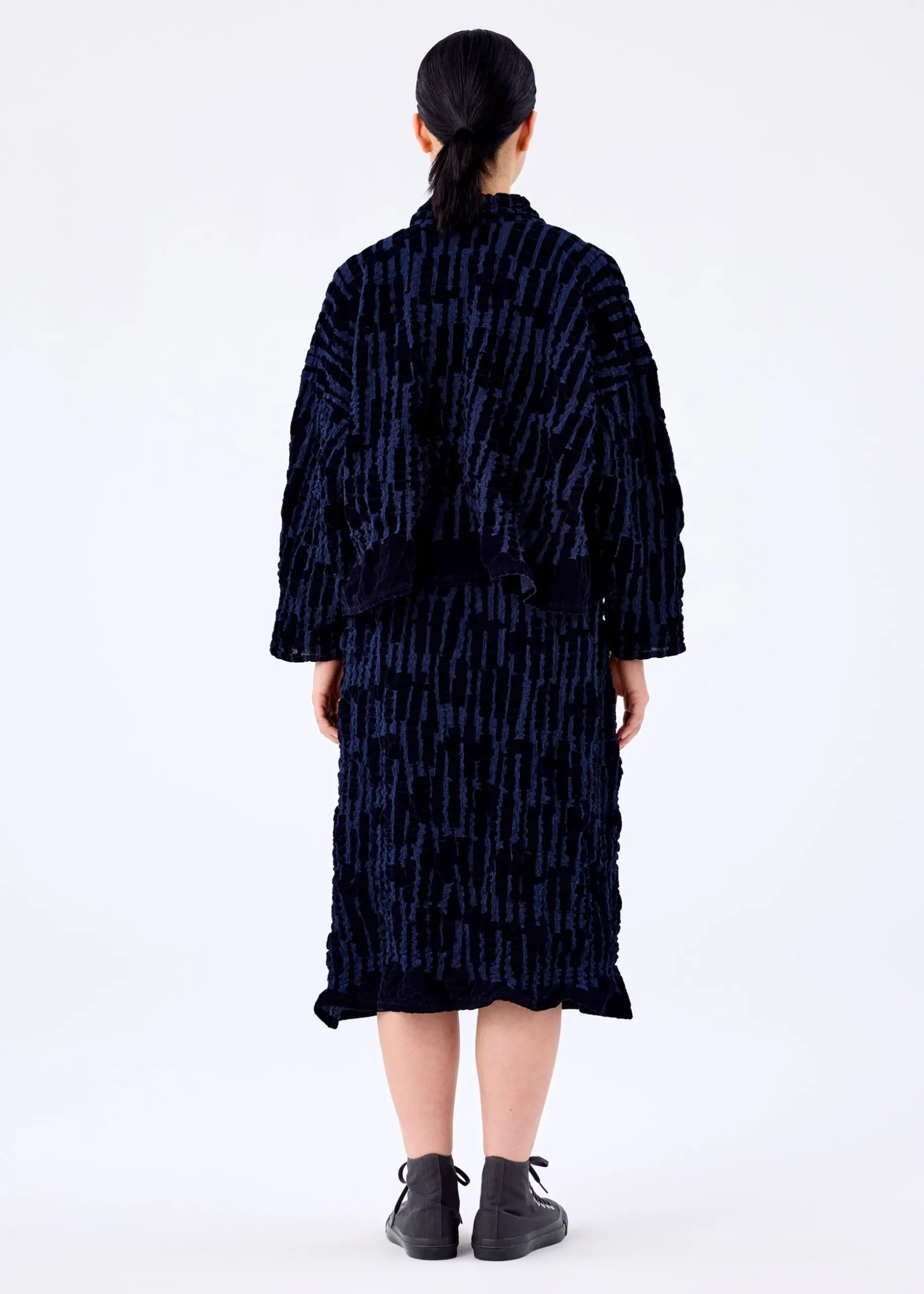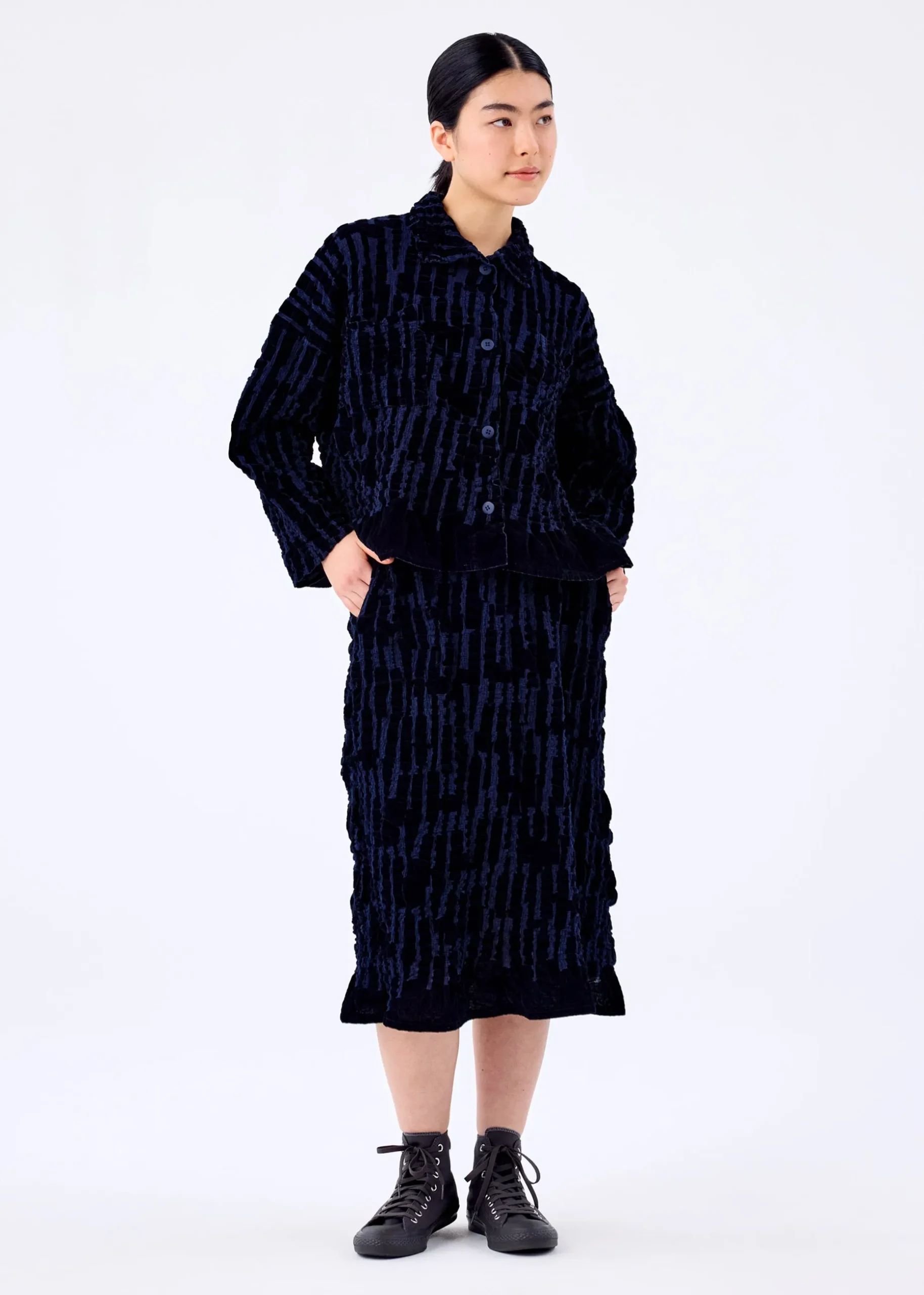 PIANO FLOCKY CAULIFLOWER features comfortable and stretchy silhouettes with a texture inspired by piano keys and frilled details at the hems.