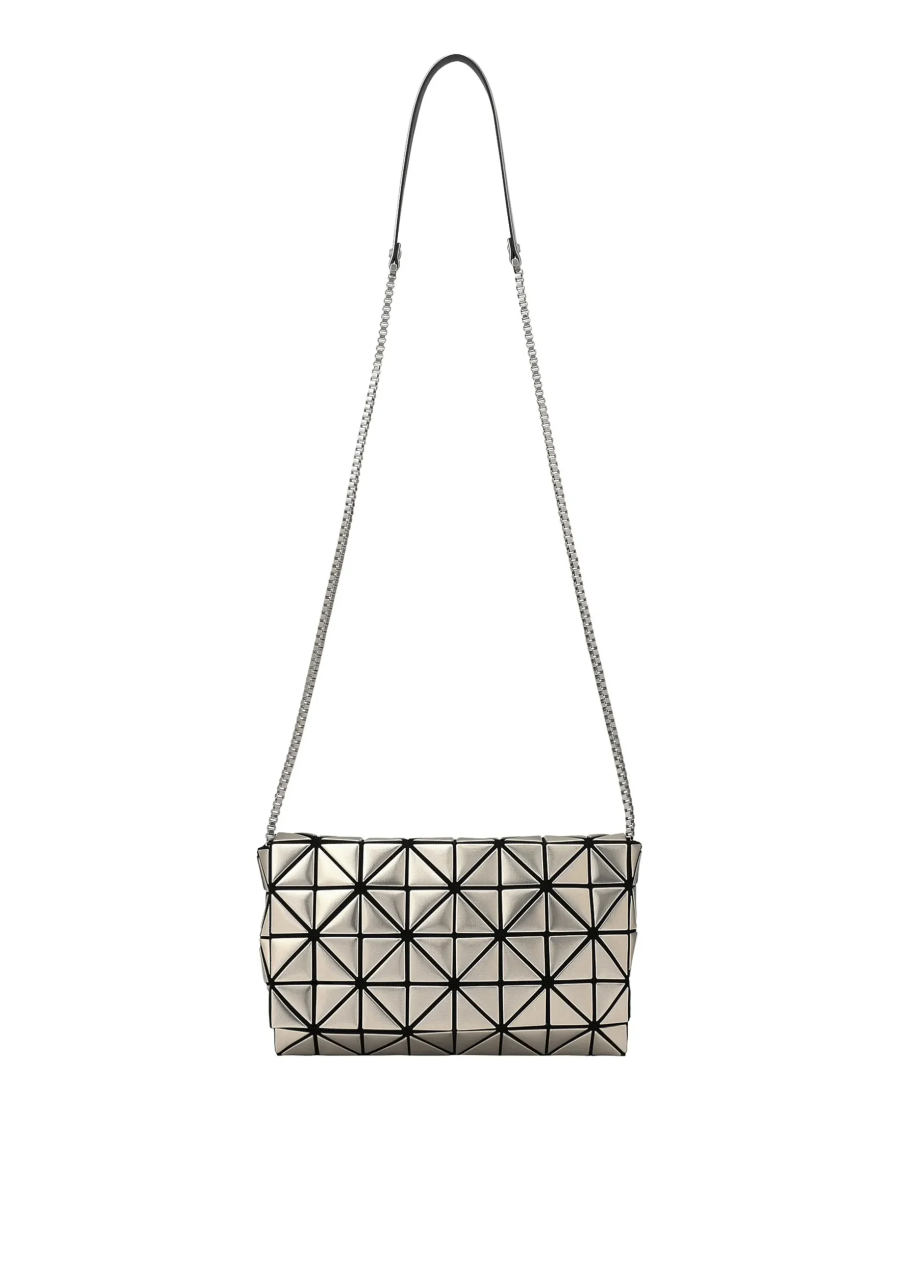 A shoulder bag from the PLATINUM series that is made of triangular pieces made of metallic material with a fabric pattern embossed on them. The entire bag can be worn as if it were a single accessory, giving it a luxurious feel that can be worn not only on special occasions, but also as an accent to your everyday outfit. It has a flap and a zipper, so you can safely store your valuables. The size allows you to store your smartphone and compact wallet.