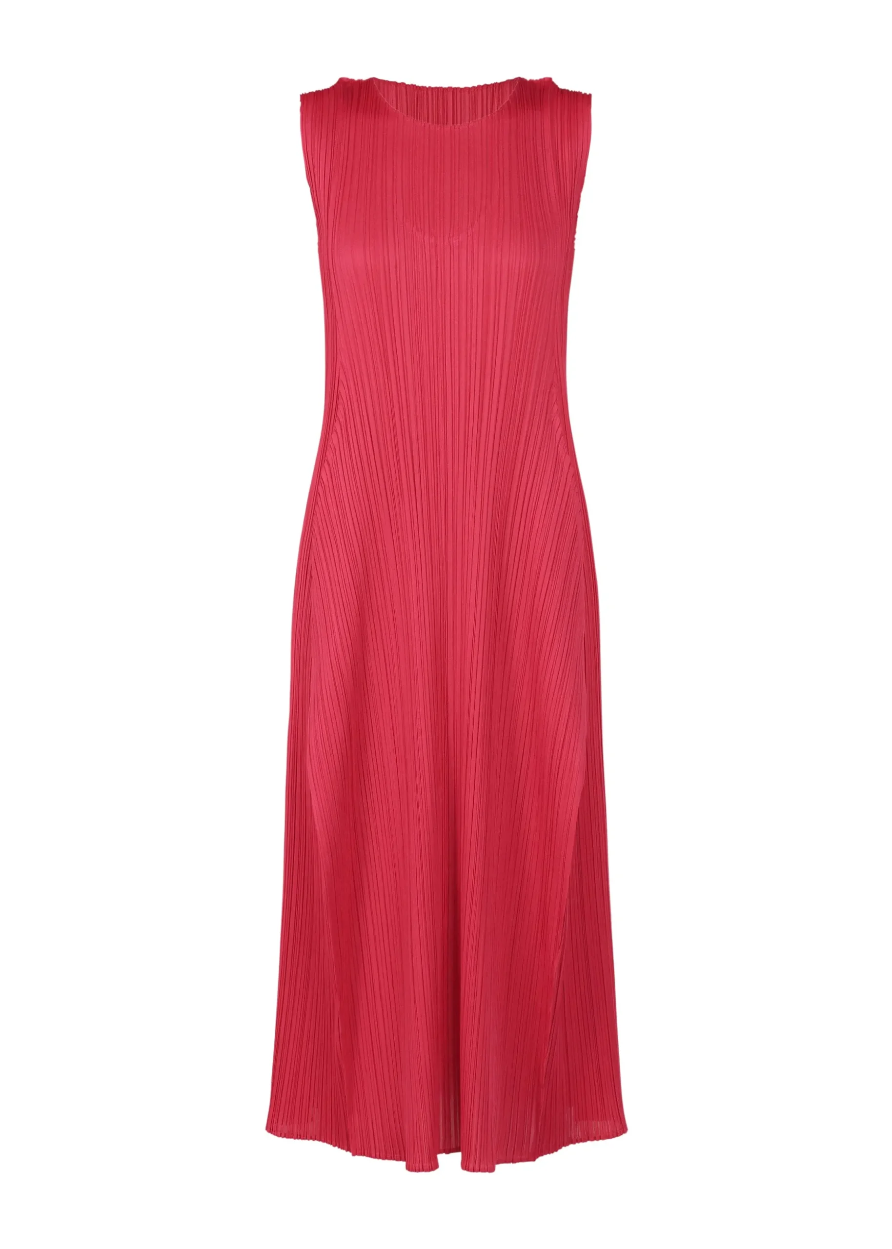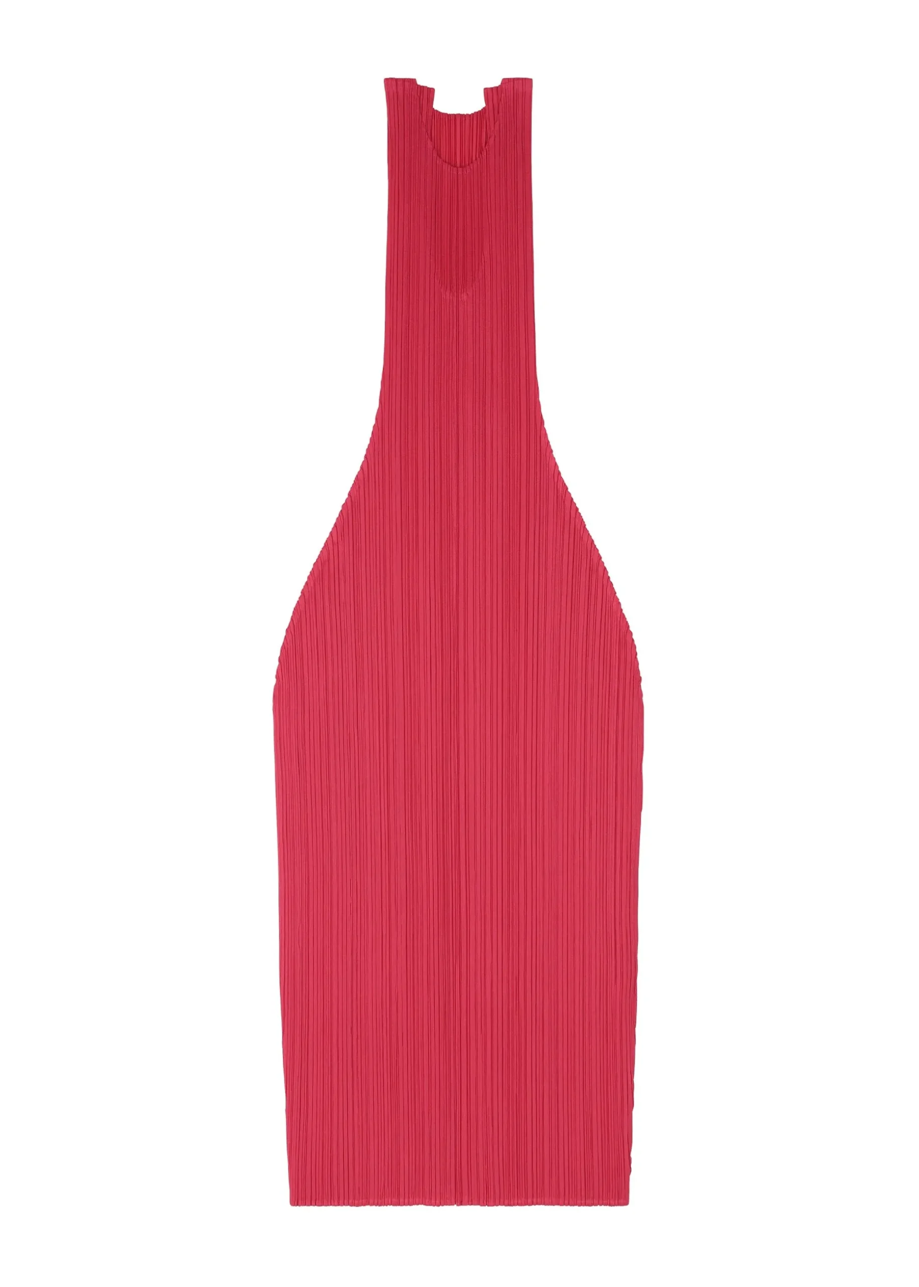 This round-neck, sleeveless dress is characterized by its puffy, three-dimensional silhouette. It is shaped like a wine bottle when laid flat, and has an elegant form when worn.