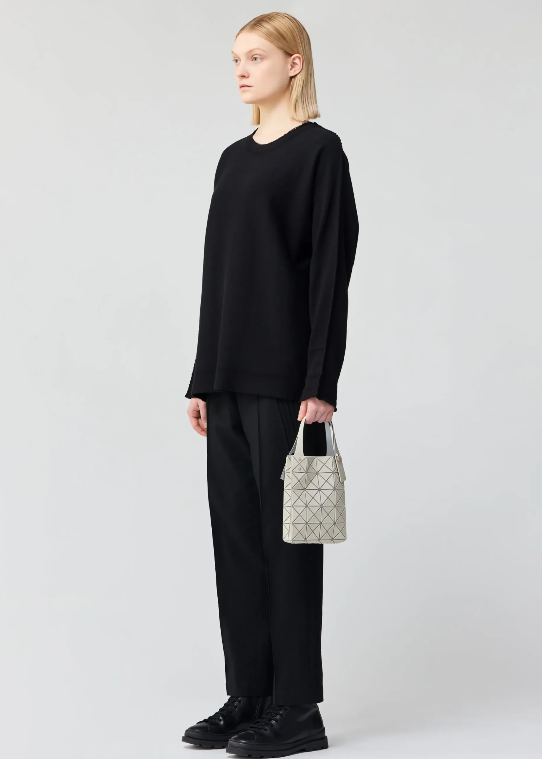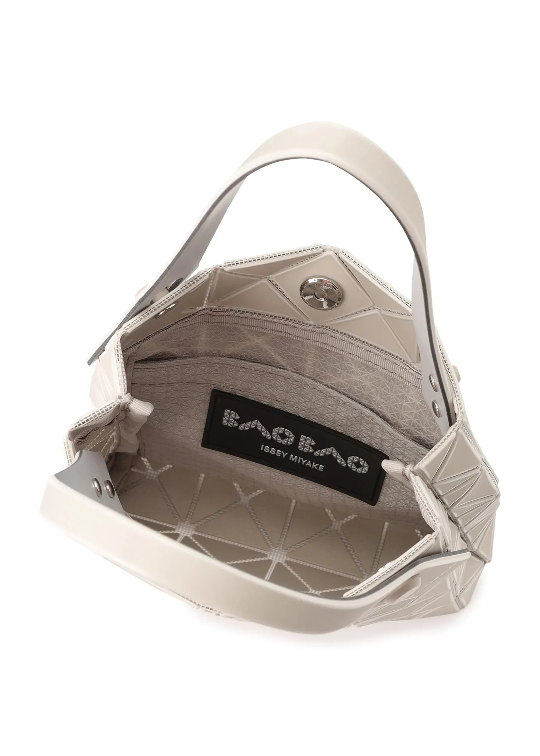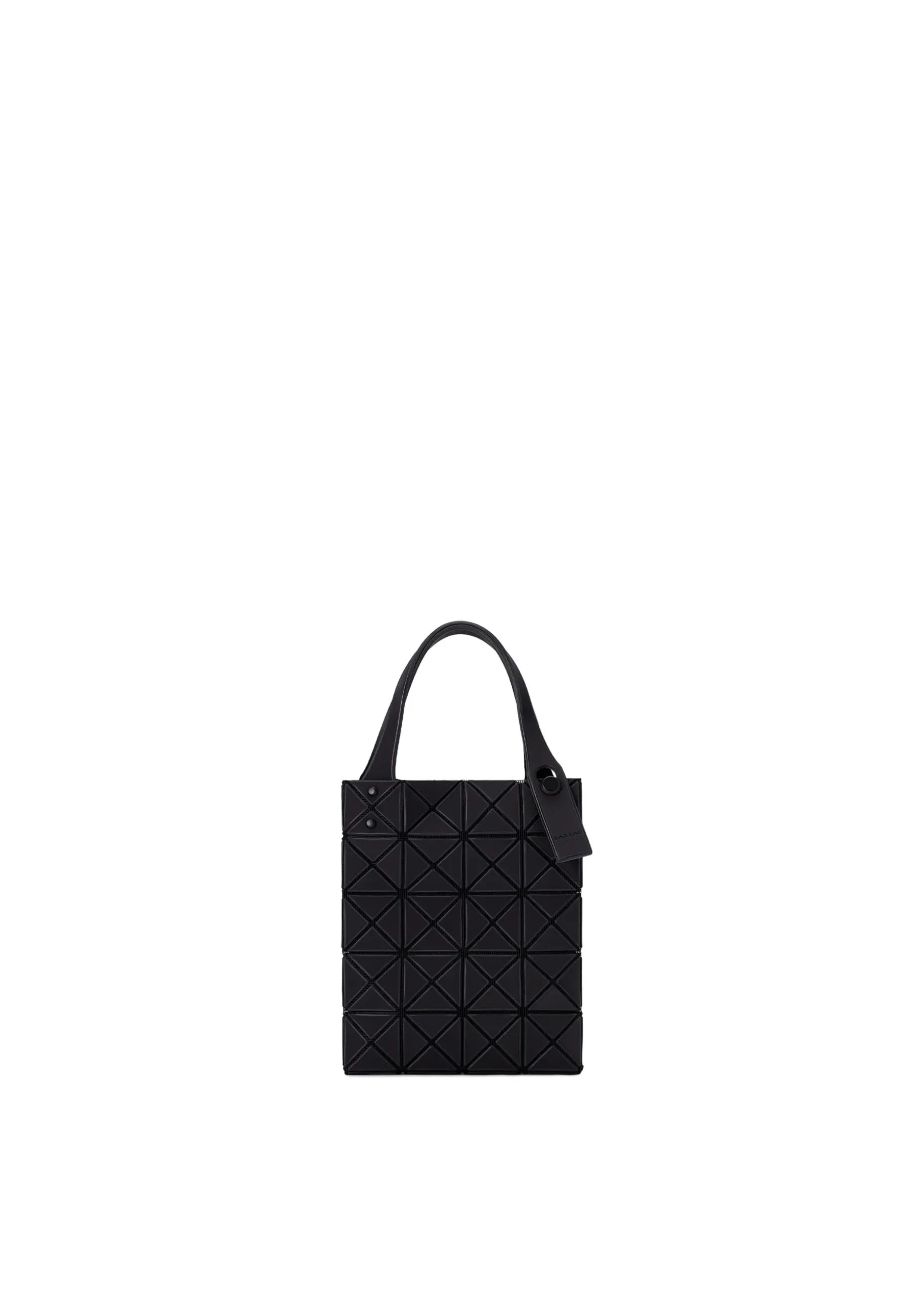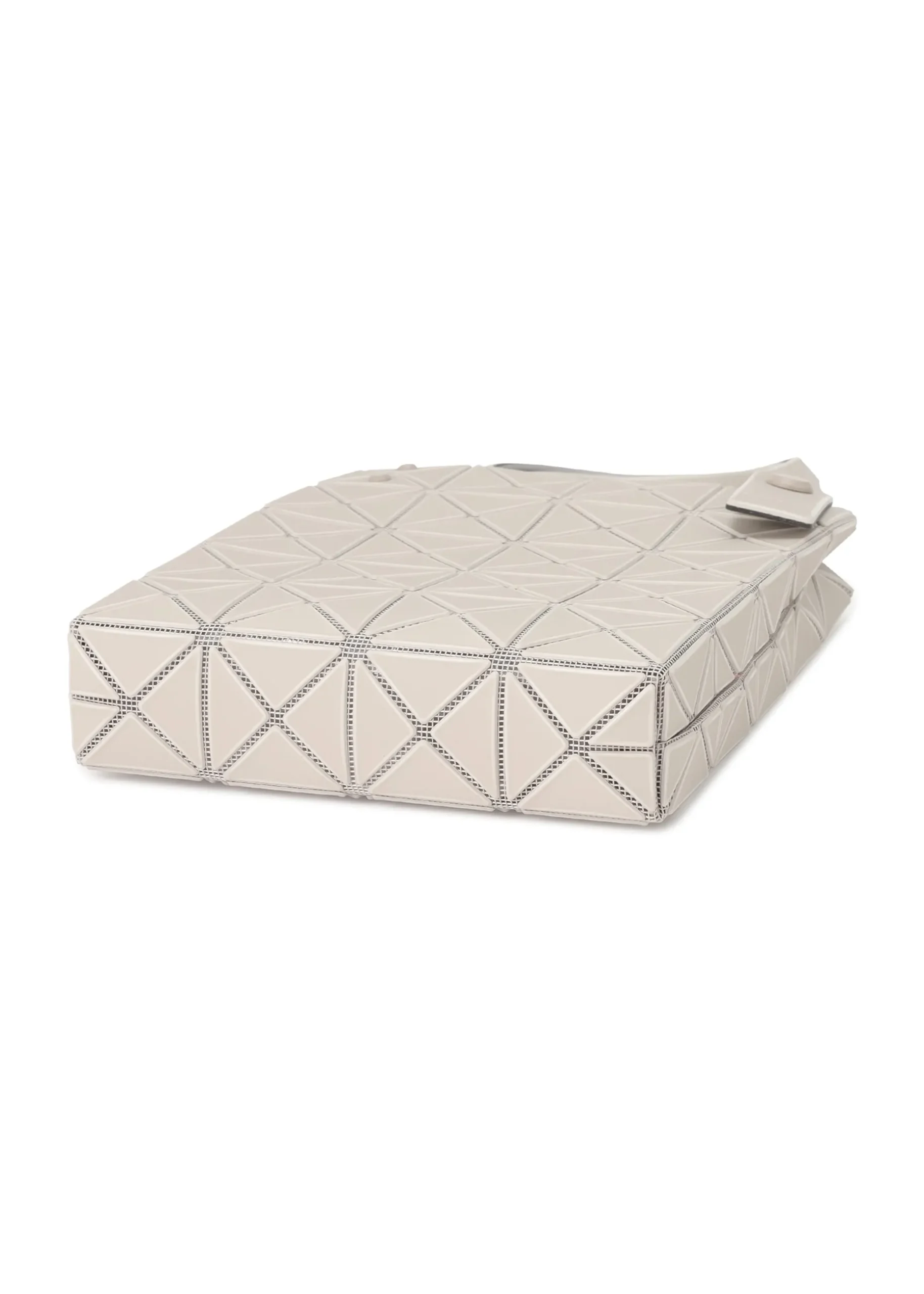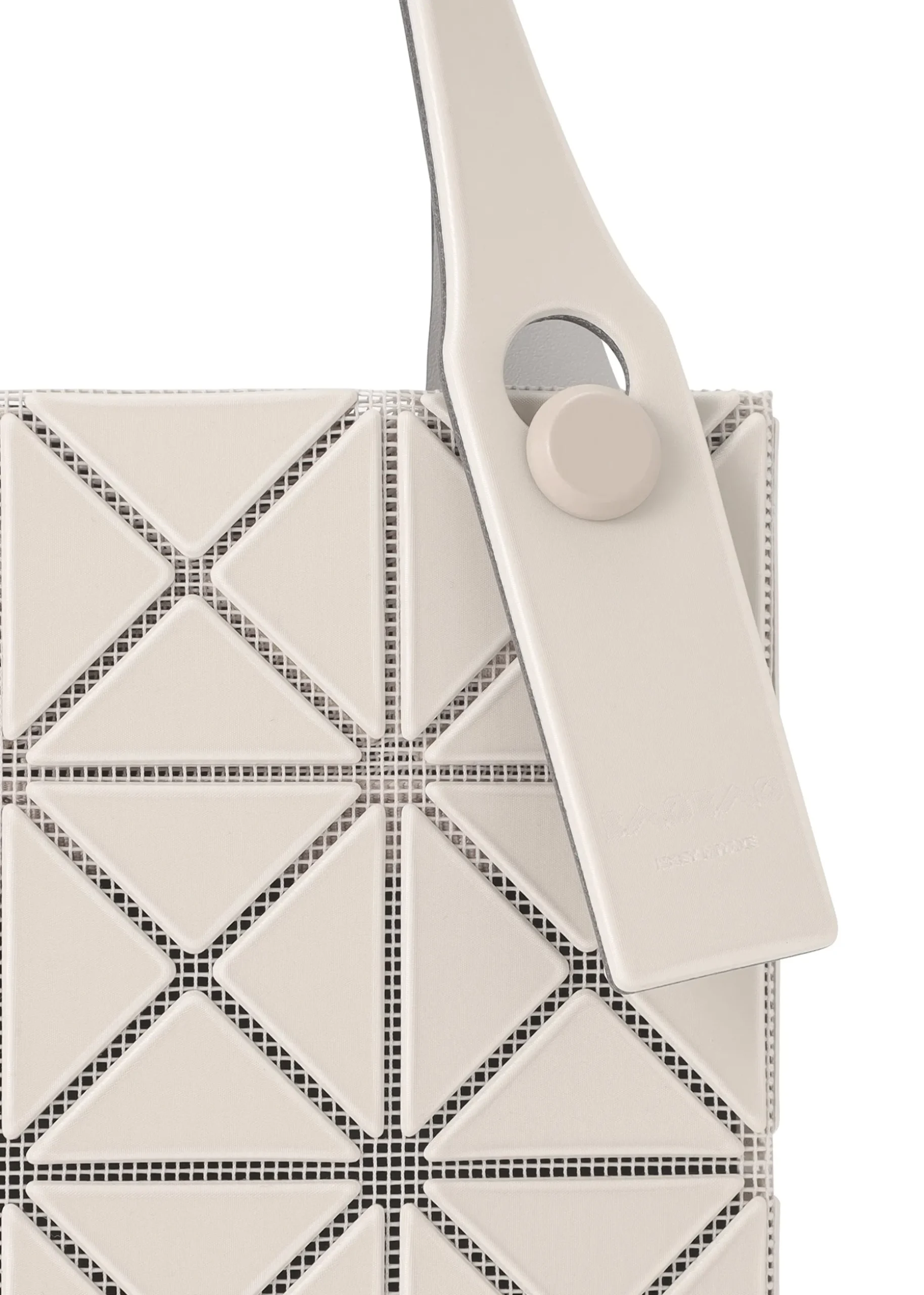 A PRISM series tote bag with a gusset made of textured material. The triangular pieces, mesh, and metal fittings are all unified in one tone. By folding the gusset to the side, it lies flat when stored, and when you put things in it, the gusset is woven into the inside, making it look like a shopping bag. The size makes it easy to incorporate as a focal point in your coordination.