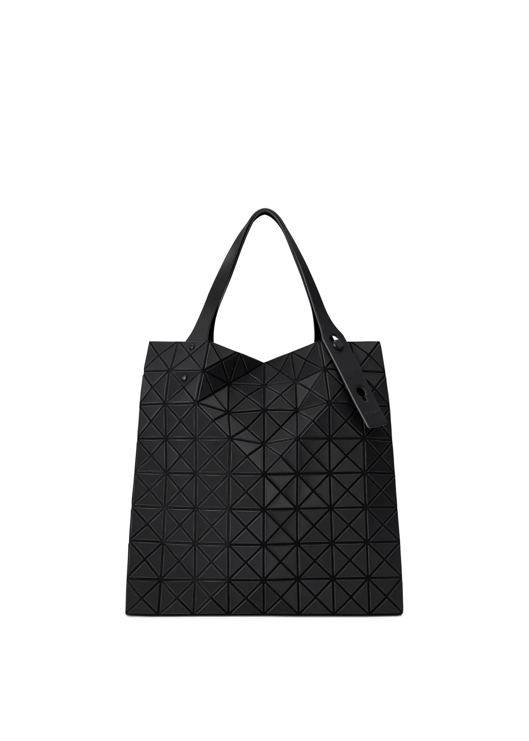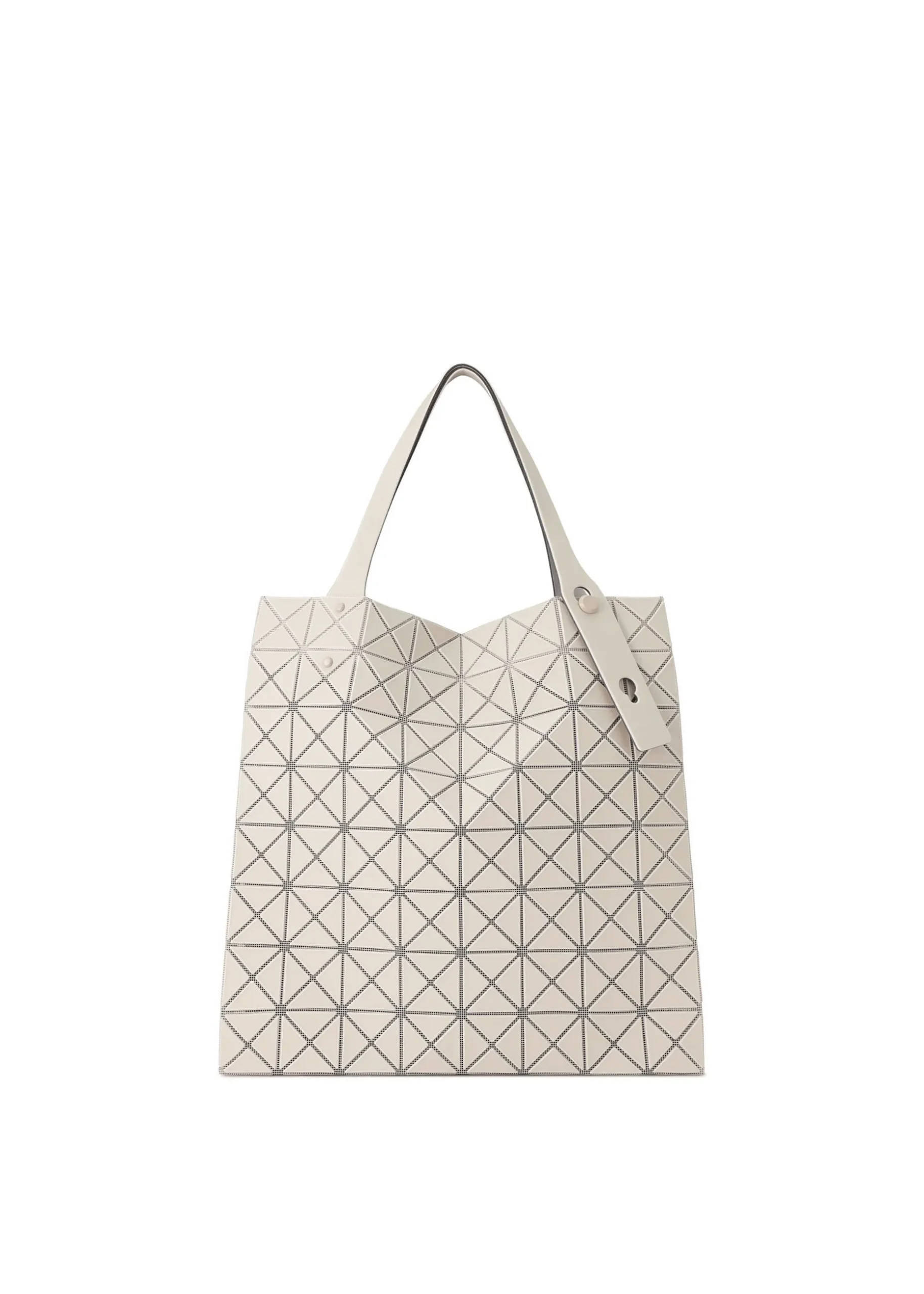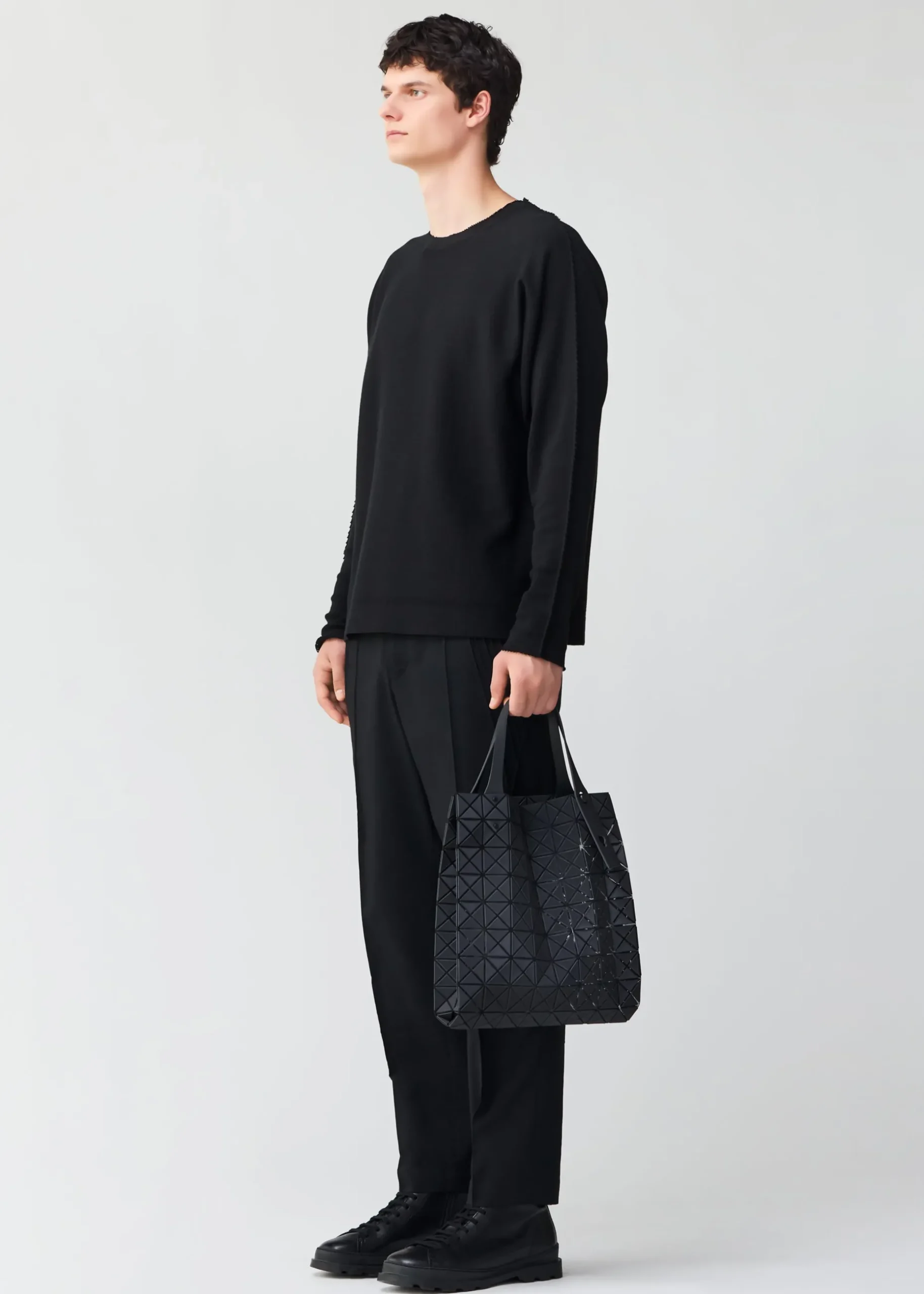A PRISM series tote bag with a gusset made of textured material. The triangular pieces, mesh, and metal fittings are all unified in one tone. By folding the gusset to the side, it lies flat when stored, and when you put things in it, the gusset is woven into the inside, making it look like a shopping bag. It looks more compact than the standard PRISM series, but the storage capacity is almost the same.