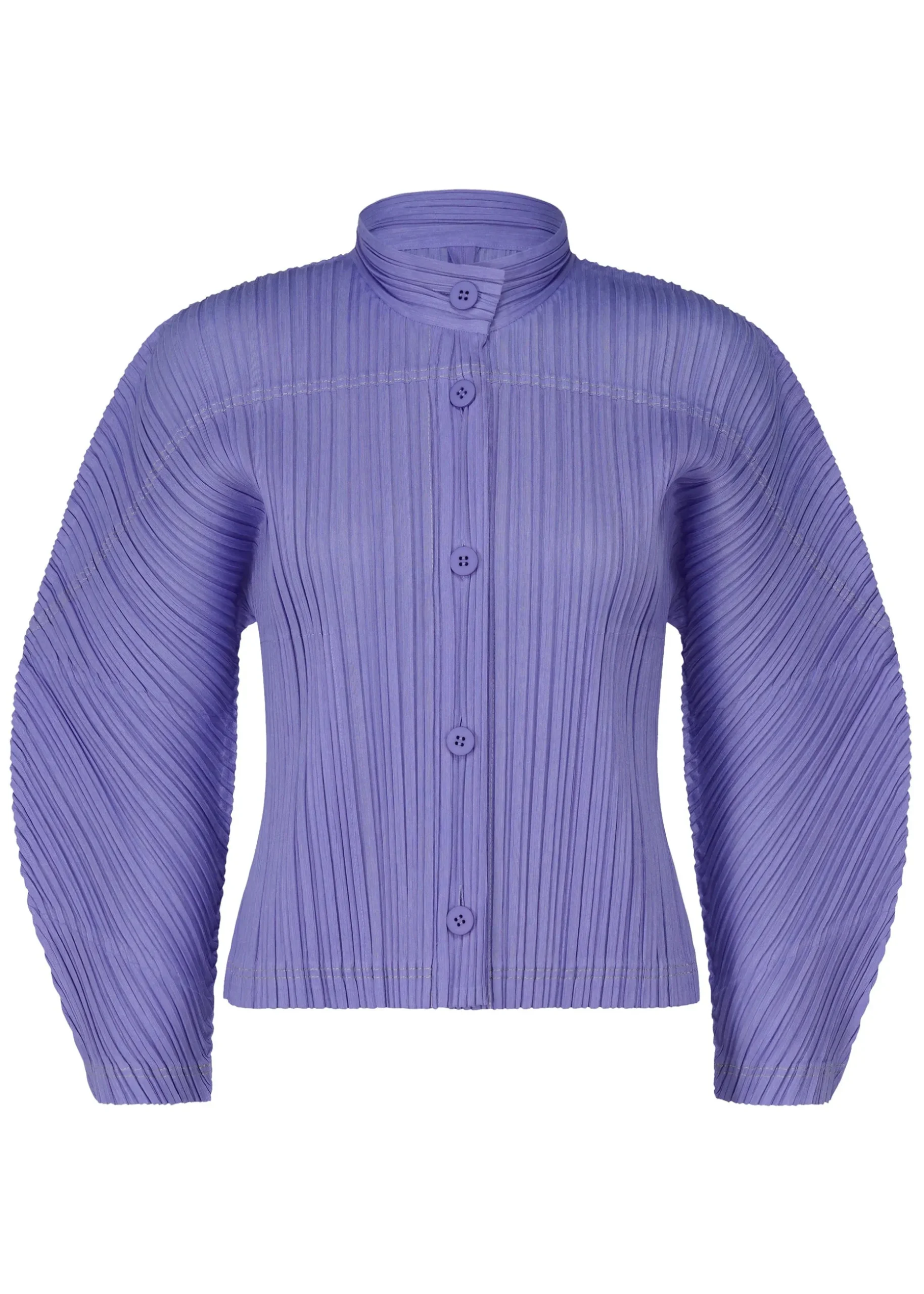 This buttoned jacket is characterized by the soft texture unique to ramie. It has a distinctive silhouette with round sleeves. It has pockets on both sides.