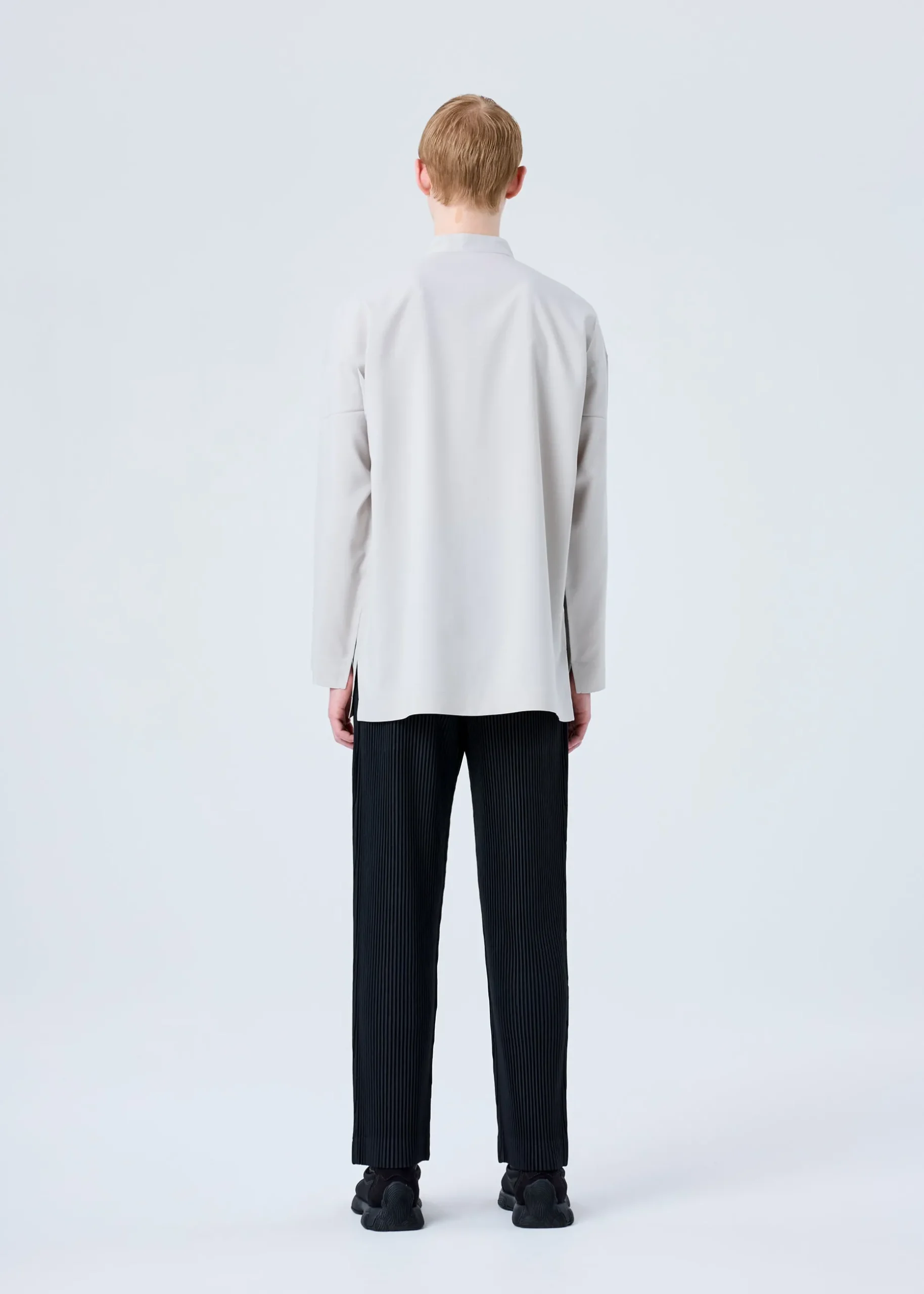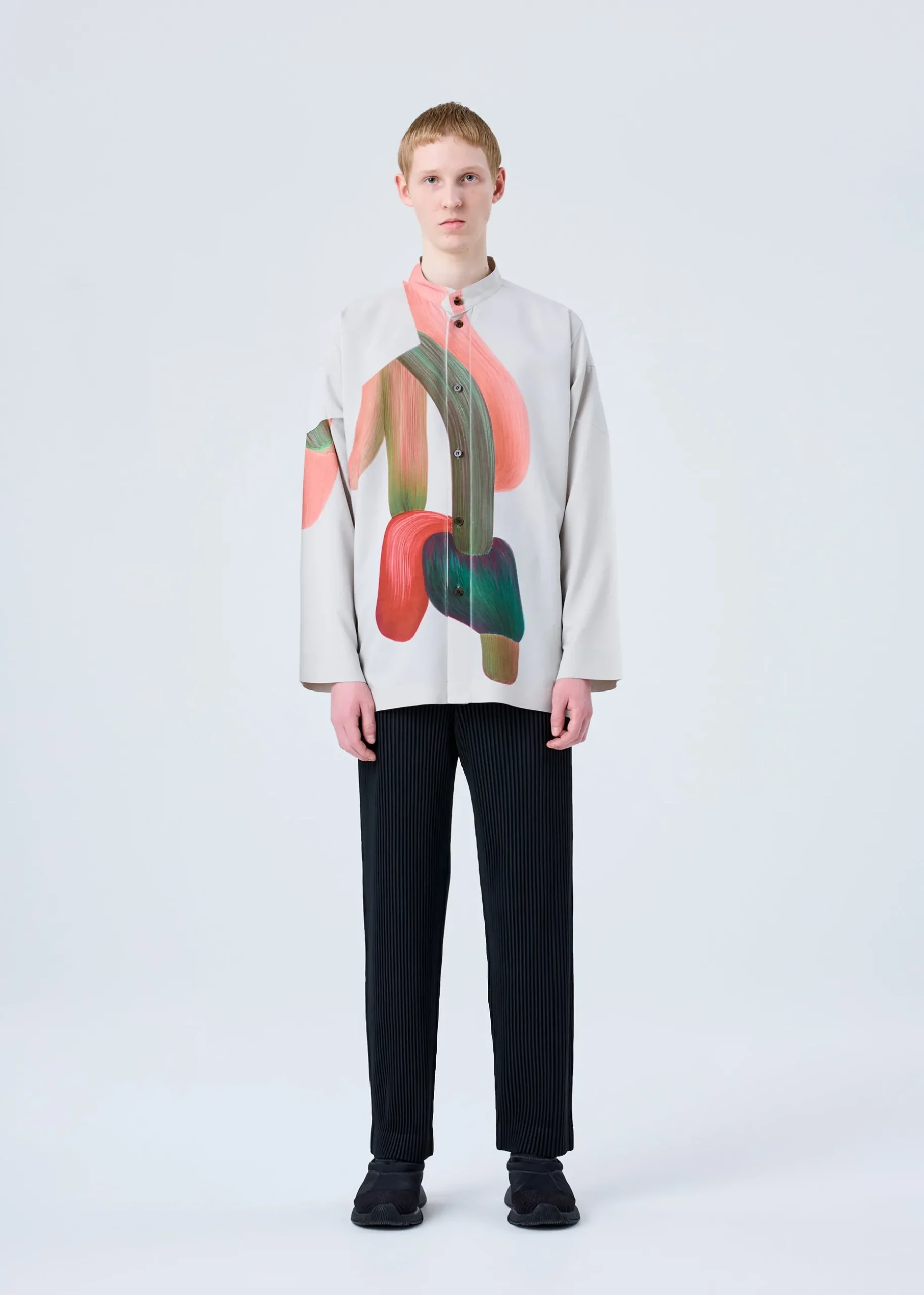 This shirt with a standing collar has a transfer print featuring designer/artist Ronan Bouroullec’s drawings. The sleeves and torso area are folded in a way that brings out the inherent impact of the pattern. There are slits on both sides.