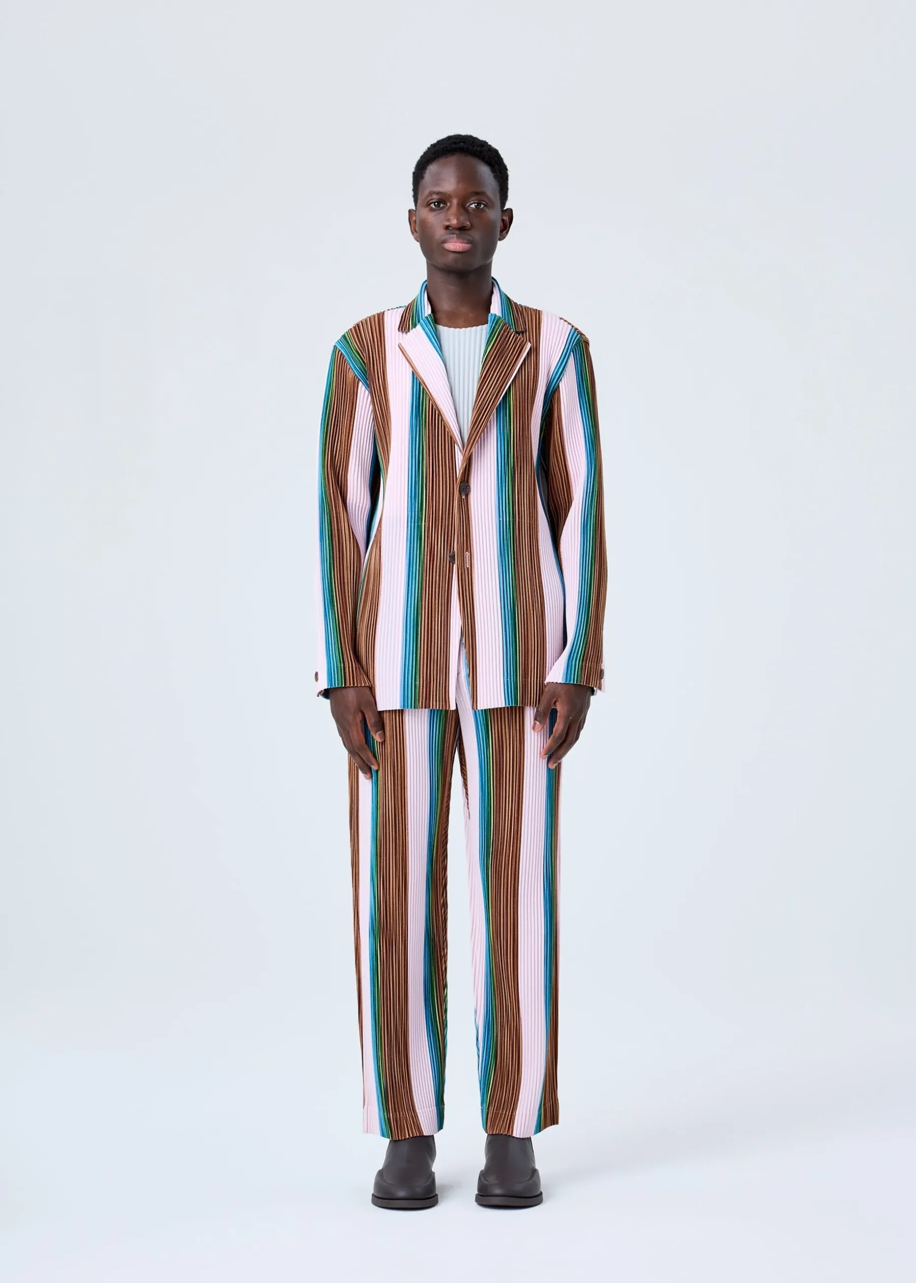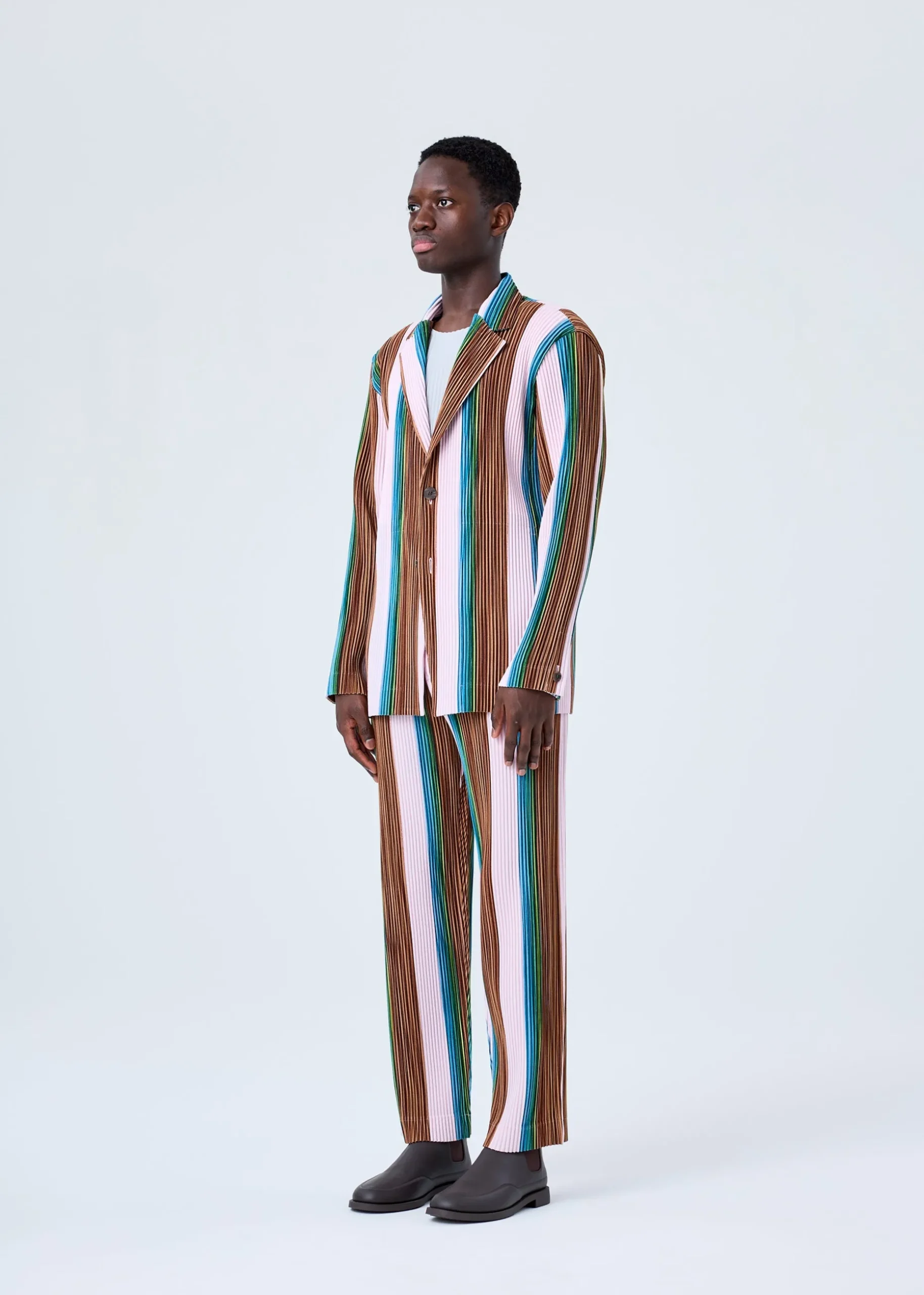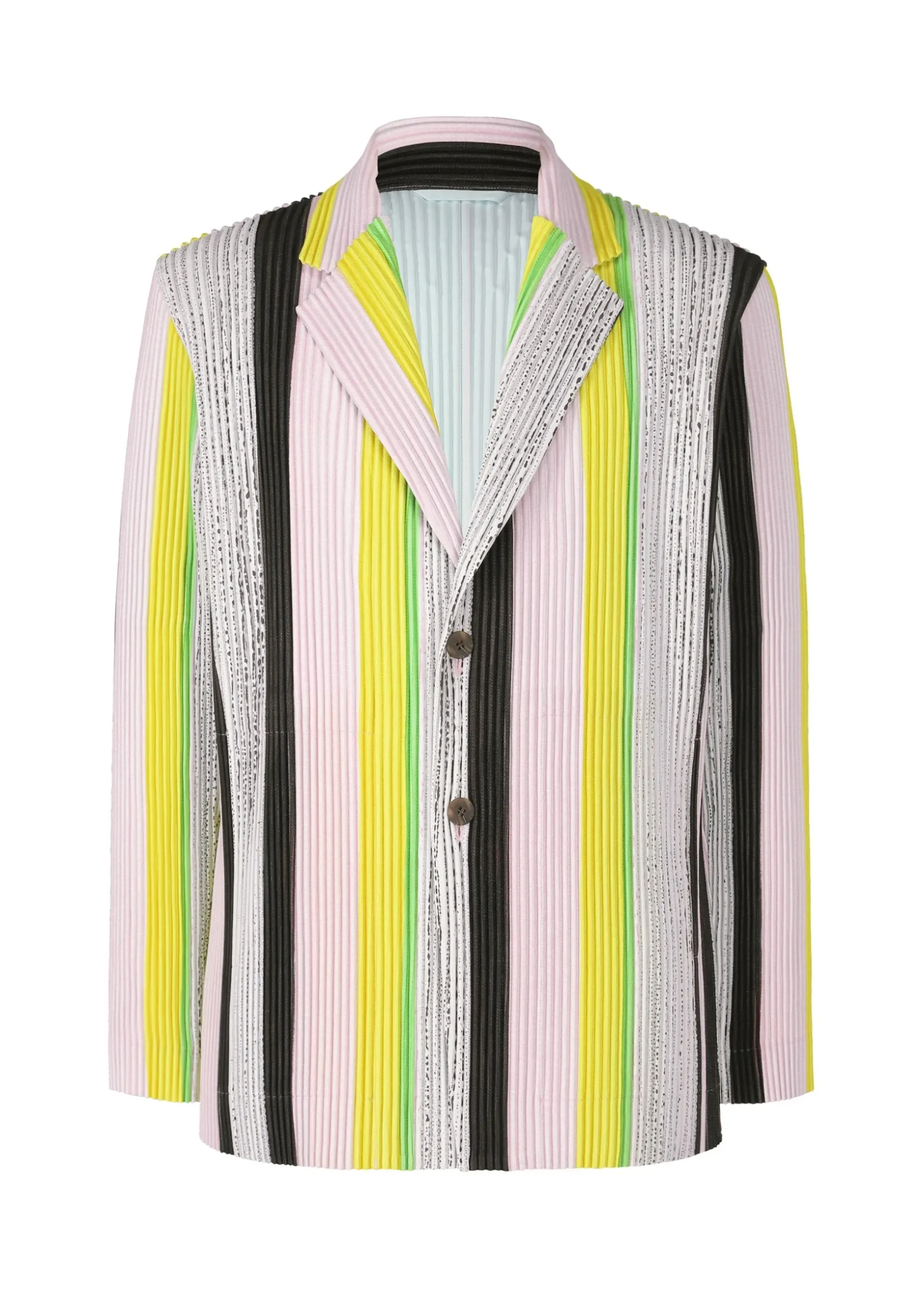 This tailored jacket has a striped print cut from part of a drawing by designer/artist Ronan Bouroullec. The inkjet print on both sides of the kersey fabric gives this jacket a wonderfully colorful finish. You can enjoy it as an item with a presence. It has pockets on both sides as well as inside pockets, and a center vent at the back.