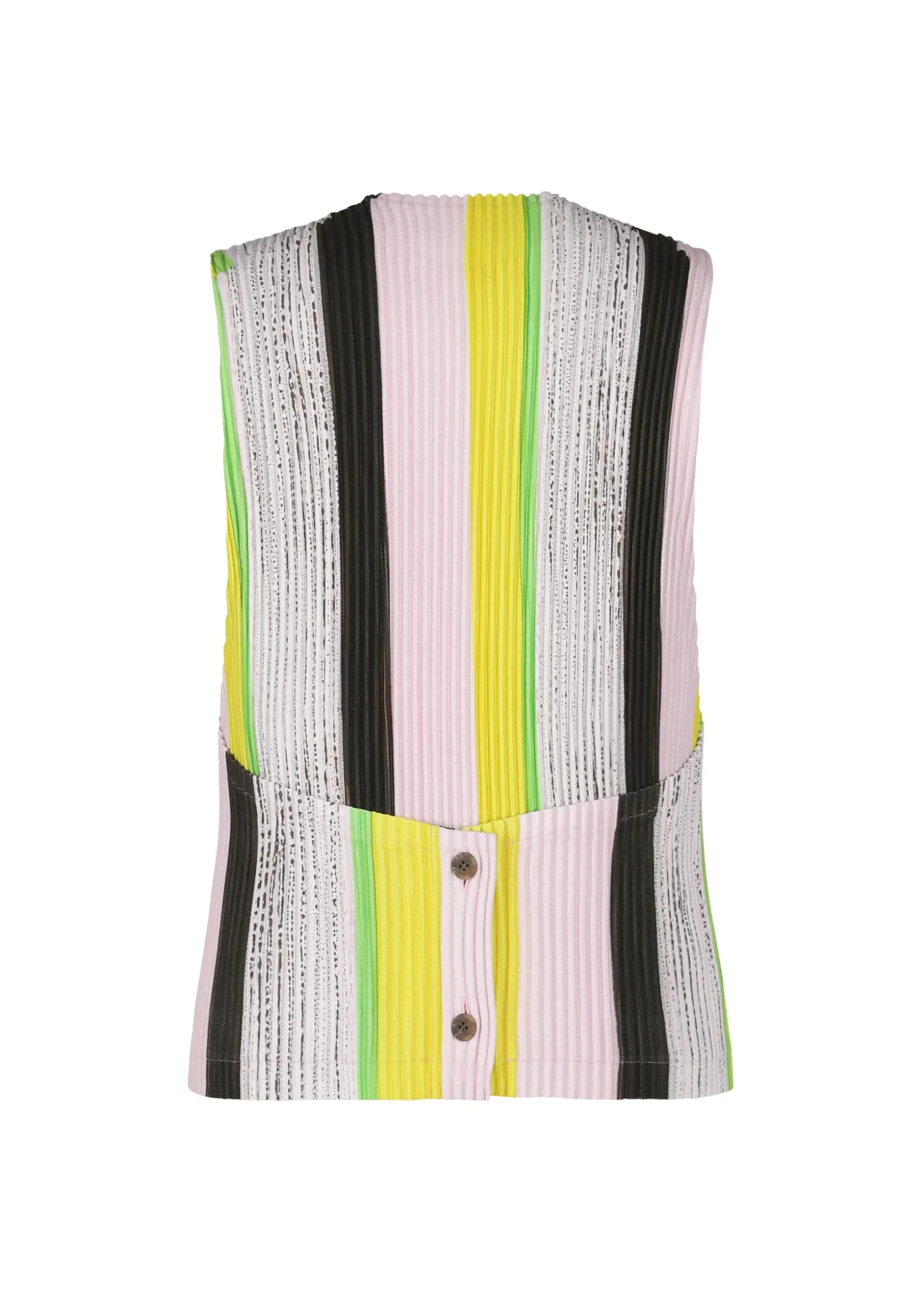 This round-neck vest has a striped print cut from part of a drawing by designer/artist Ronan Bouroullec. The inkjet print on both sides of the kersey fabric gives this vest a wonderfully colorful finish. You can enjoy it as an item with a presence.