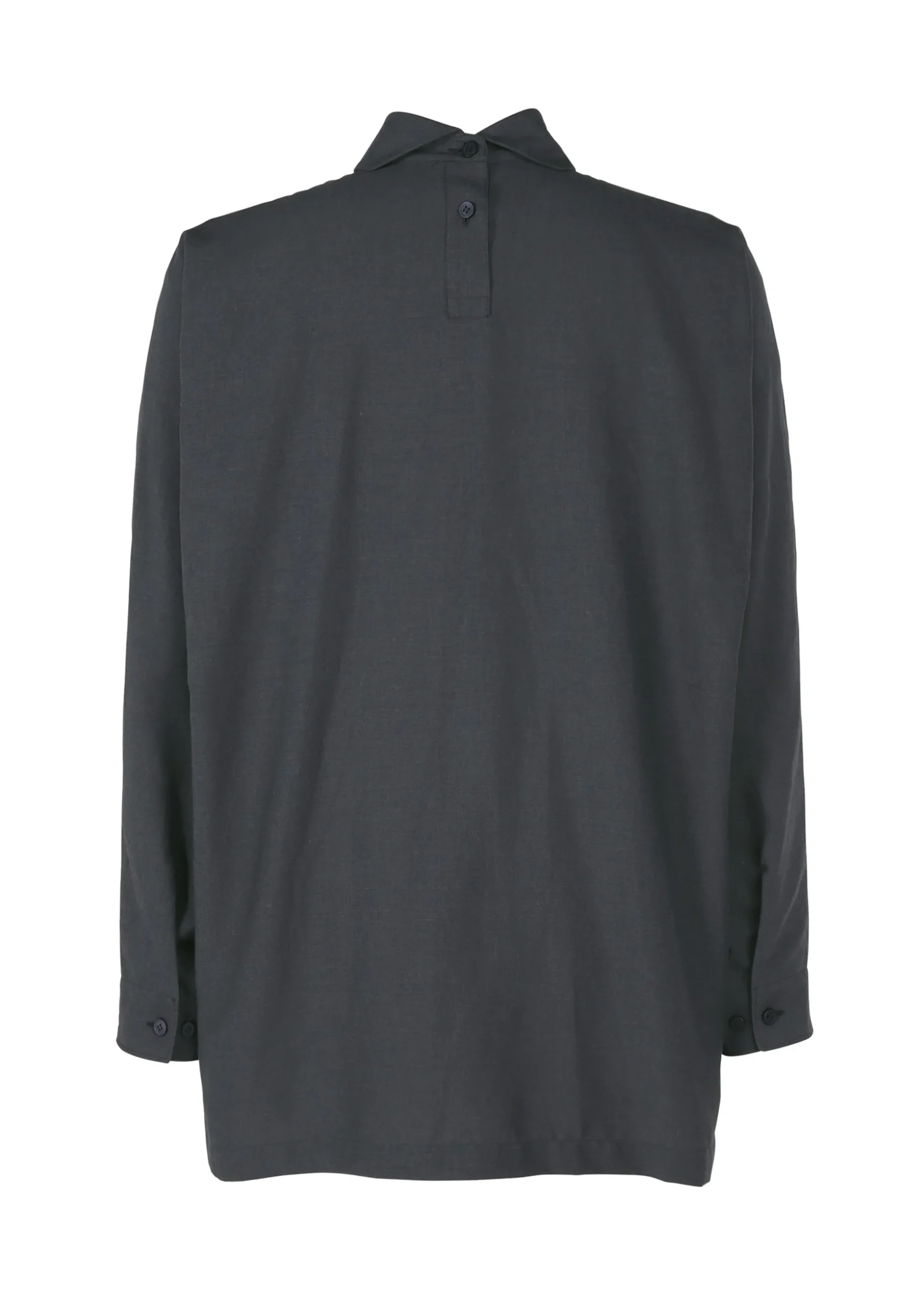 This shirt with a standing collar faithfully reproduces designer/artist Ronan Bouroullec’s “STYLO-BILLE” series drawings using embroidery. The shirt is designed to have large blank spaces in order to maximize the dynamic look of the pattern. It has slits on both sides.