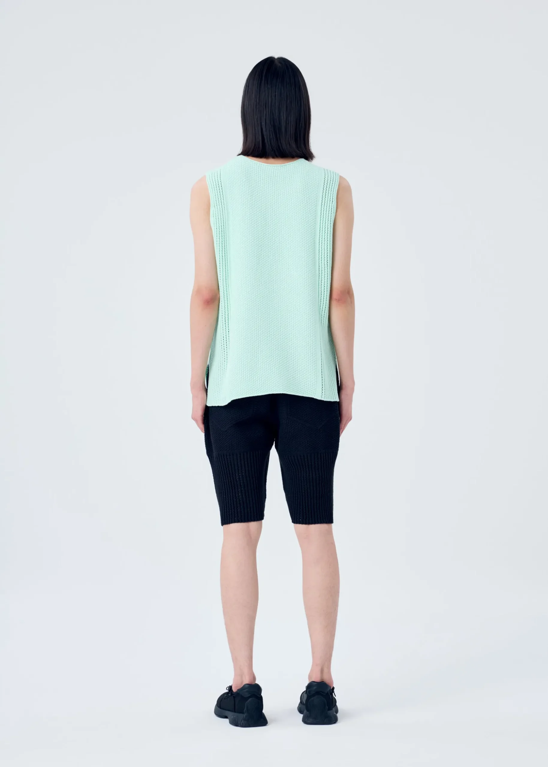 This knit vest is characterized by its varied silhouette combining standard knitted fabric and ribbing. You can enjoy the soft, light texture. It has pockets on both sides.
